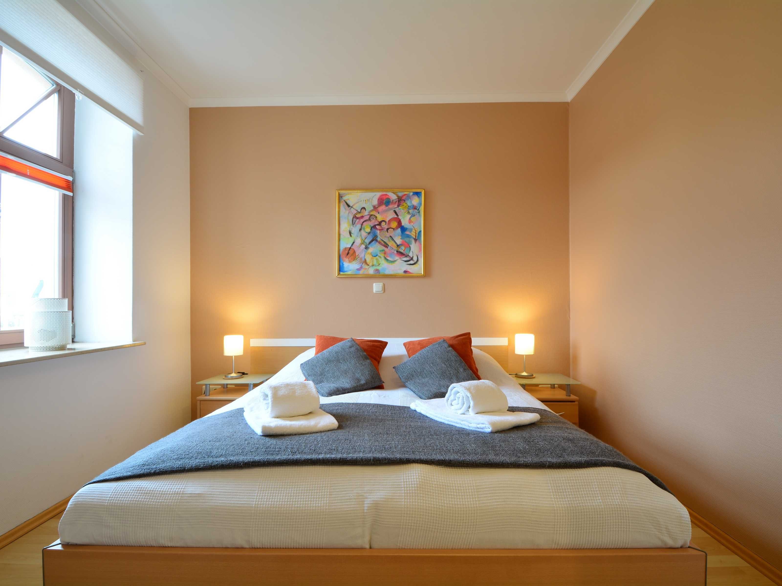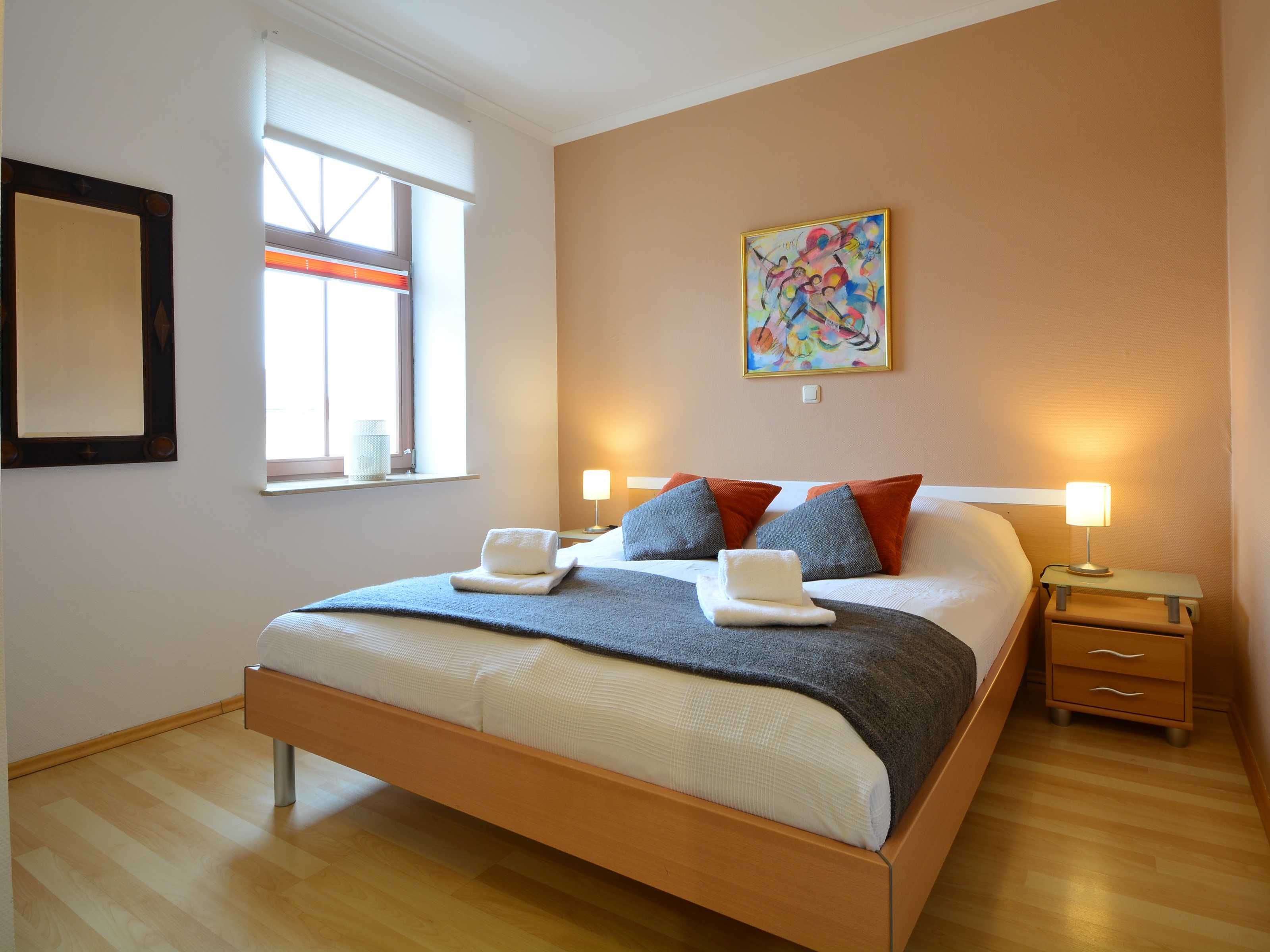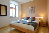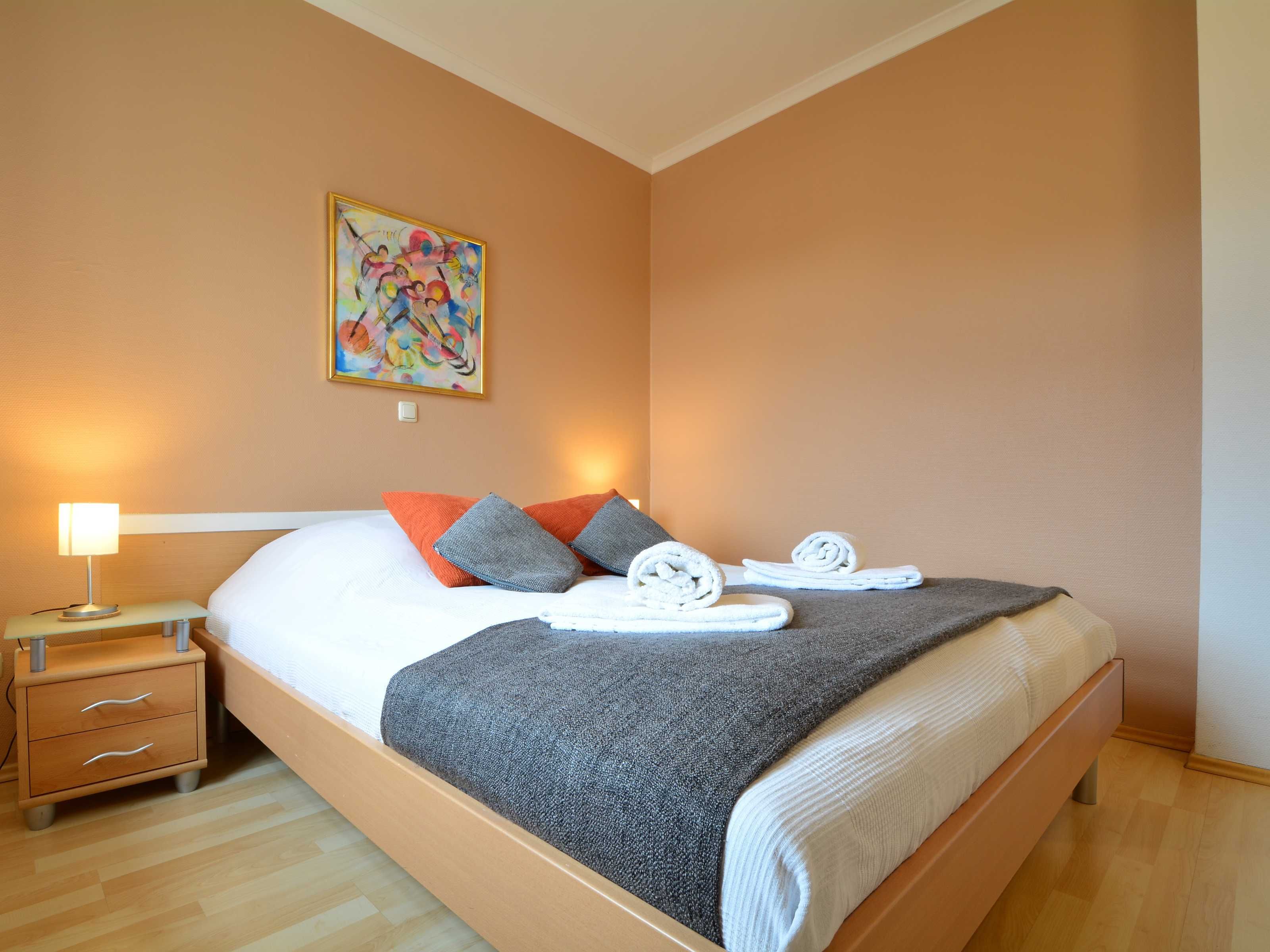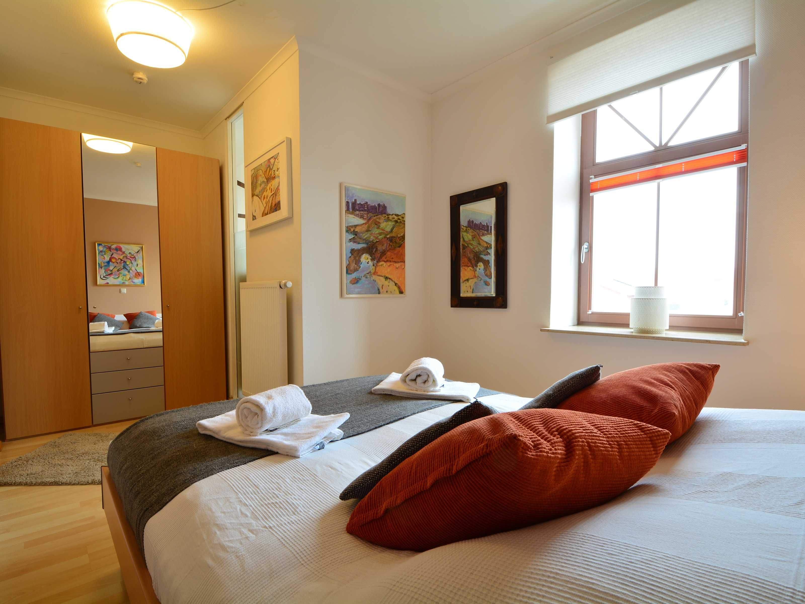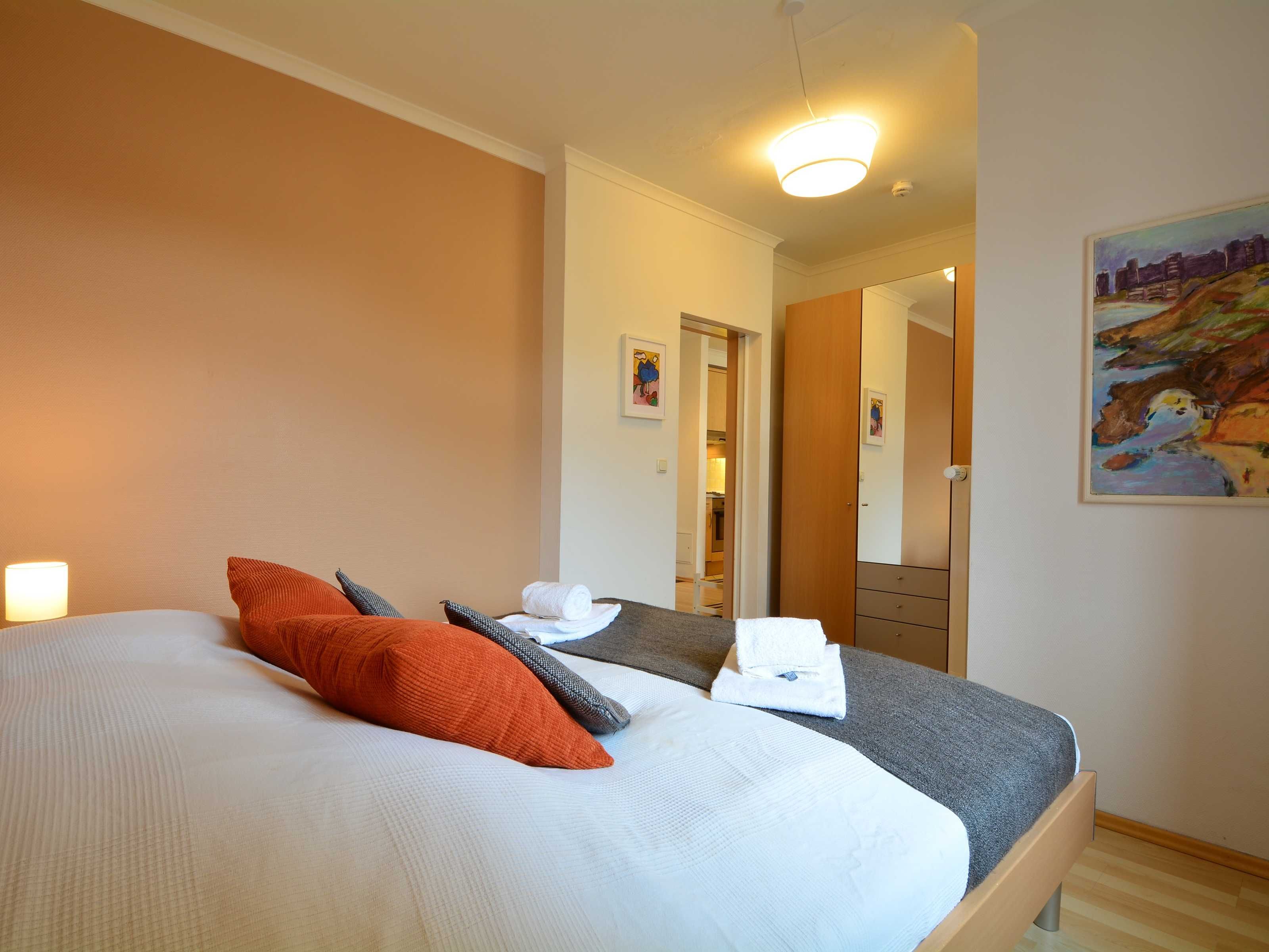 Der separate Schlafraum ist mit einem Doppelbett (zwei Matratzen je 80 x 200 cm, Härtegrad 1 weich) sowie einem großzügigen Kleiderschrank mit Ganzkörperspiegel ausgestattet. Alle Fenster der Wohnung sind mit Plissees versehen, die je nach Bedarf als Sichtschutz oder Verdunkelung dienen und so zur angenehmen Atmosphäre beitragen.