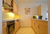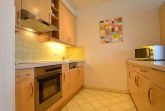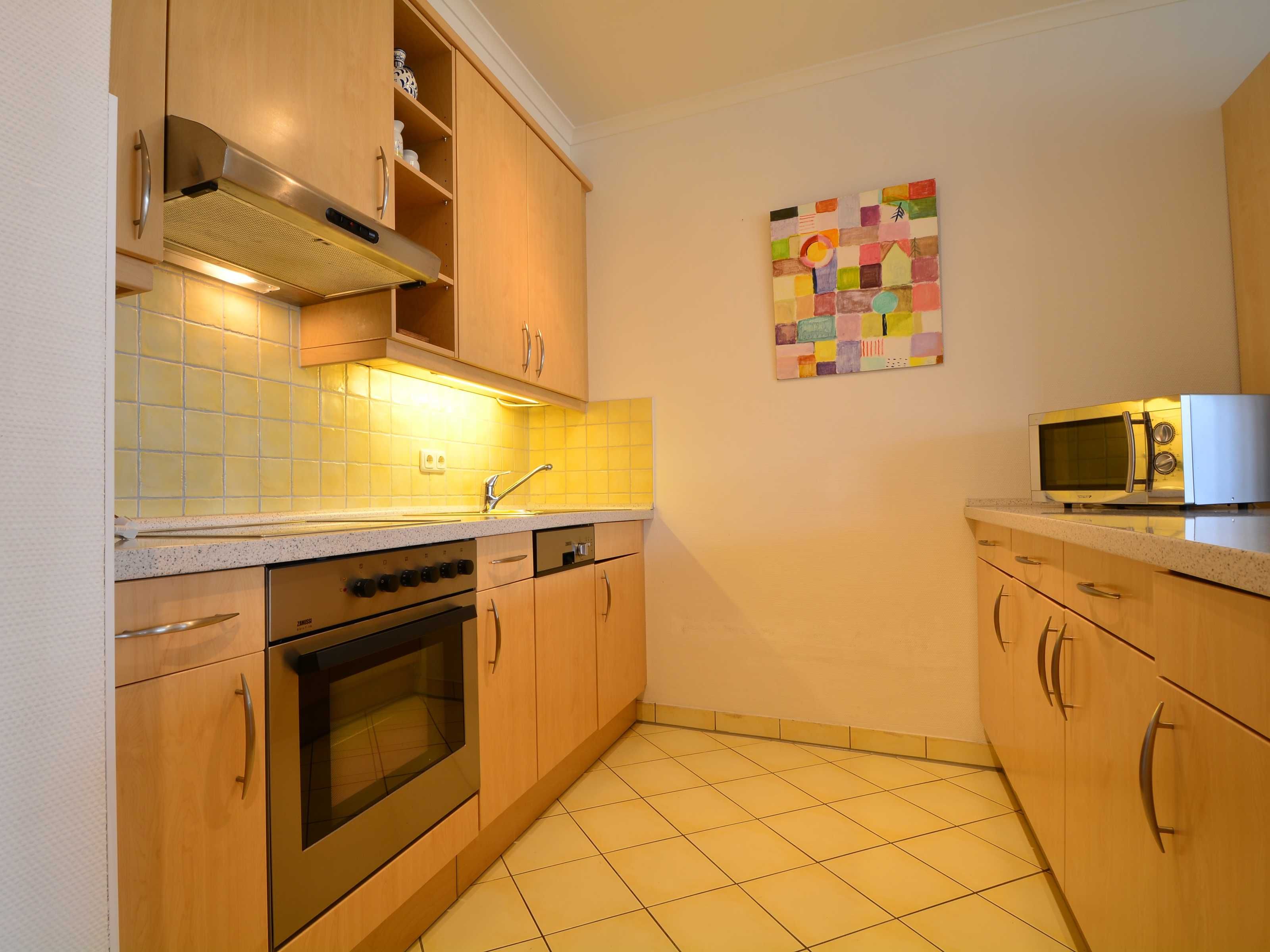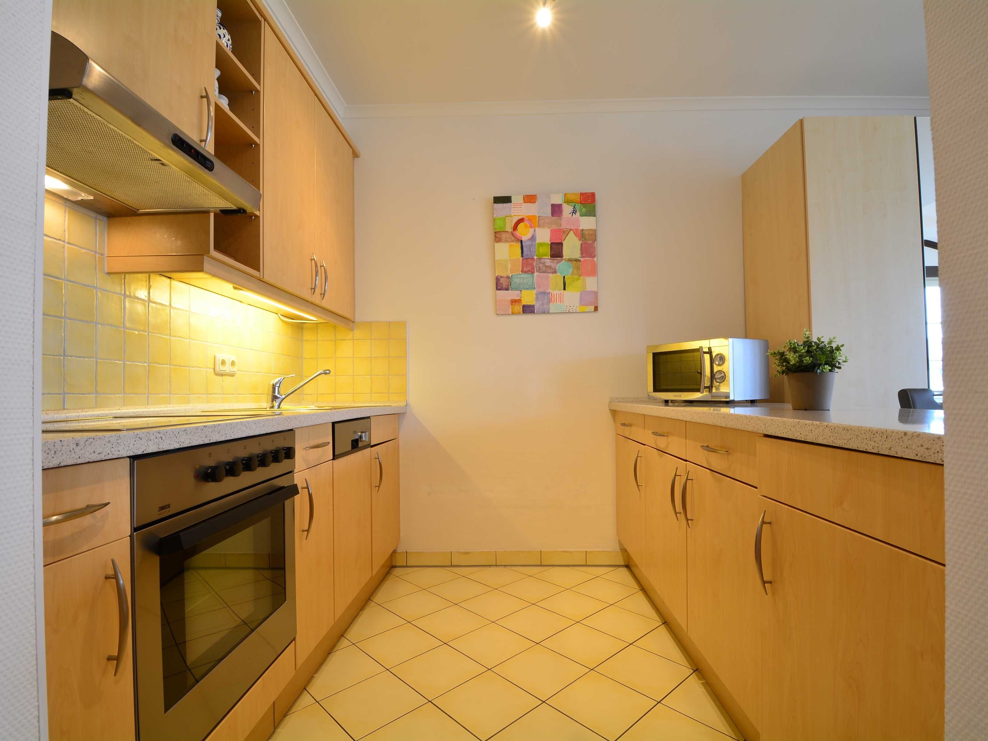 Die offene Küchenzeile ist vollständig ausgestattet mit einem modernen 4-Platten-Cerankochfeld, einem Backofen mit Dunstabzug, einem Geschirrspüler, einer Mikrowelle sowie einem Kühlschrank mit integriertem Gefrierfach. Für die Zubereitung kleiner und großer Mahlzeiten stehen außerdem eine Kaffeemaschine, ein Wasserkocher, ein Toaster und diverses Kochzubehör zur Verfügung. Reinigungsutensilien für Gäste sind ebenfalls vorhanden und erleichtern die Selbstversorgung im Urlaub.