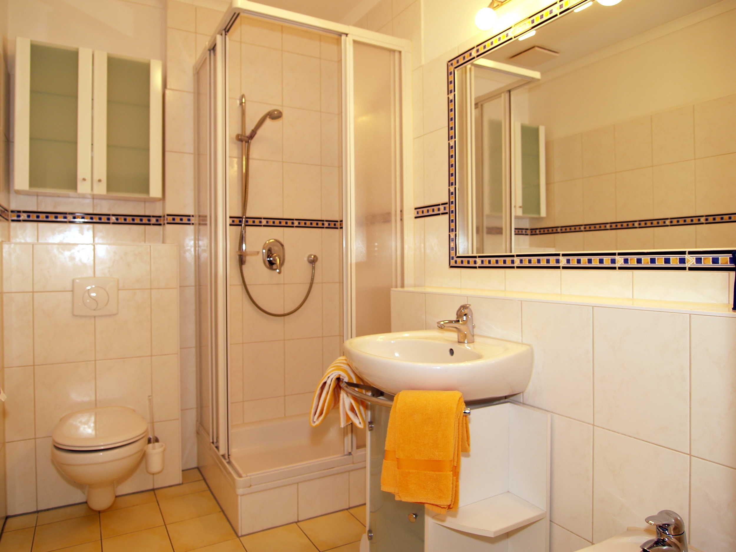 Das Badezimmer ist funktional und hochwertig zugleich. Es verfügt über eine Dusche, ein WC und ein Waschbecken. Ergänzt wird die Ausstattung durch einen Handtuchwärmer, einen Föhn, einen Kosmetikspiegel sowie eine Personenwaage. So steht auch der persönlichen Pflege im Urlaub nichts im Wege.