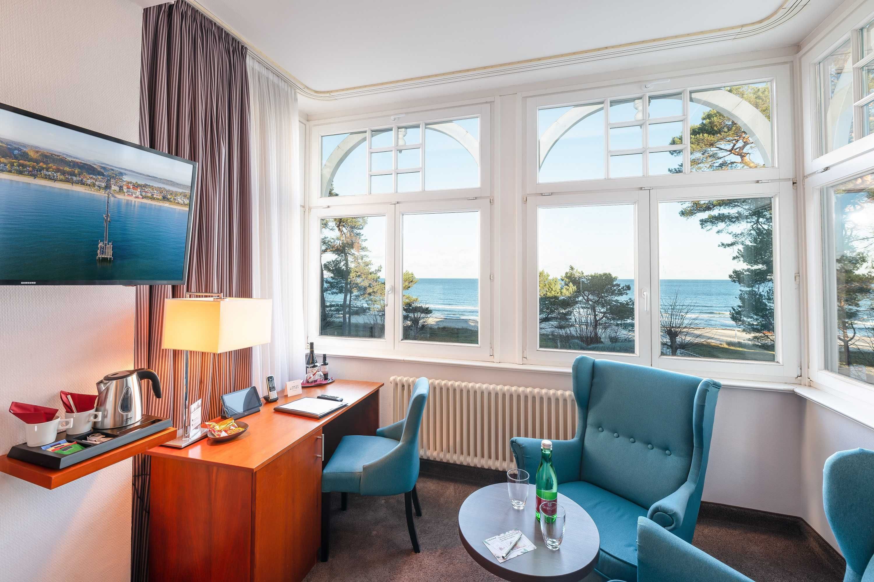 Alle unsere Zimmer sind liebevoll eingerichtet und bestechen mit einmaligem Komfort. Die modernen Bäder sind kleine Wohlfühl-Oasen mit viel Raum zur freien Entfaltung, alle Räumlichkeiten sind mit TV, Telefon, Zimmersafe und einer Minibar ausgestattet. Unsere mondänen Suiten verfügen außerdem über einen vollausgestatteten Küchenbereich sowie eine einladende Badewanne zum Träumen und Genießen. Besonders eindrucksvoll: Aus vielen unserer Doppelzimmer und Juniorsuiten haben Sie einen unvergesslichen Panoramablick auf die Ostsee.
