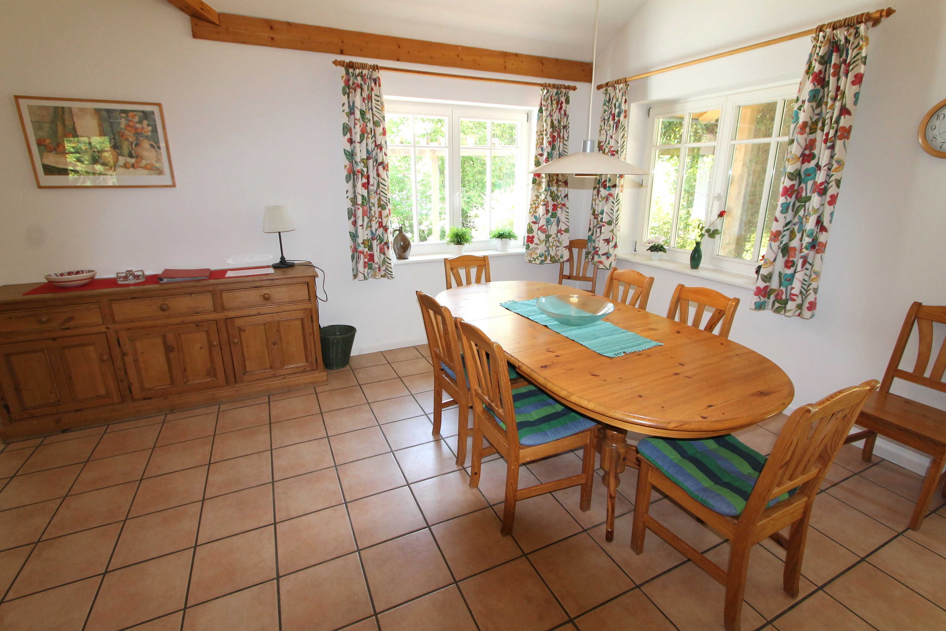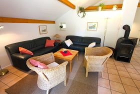 Im Wohnraum finden Sie eine gemütliche Couchecke mit Sat- TV und Kamin, darin integriert befindet sich der Essbereich mit Tisch und Stühlen.