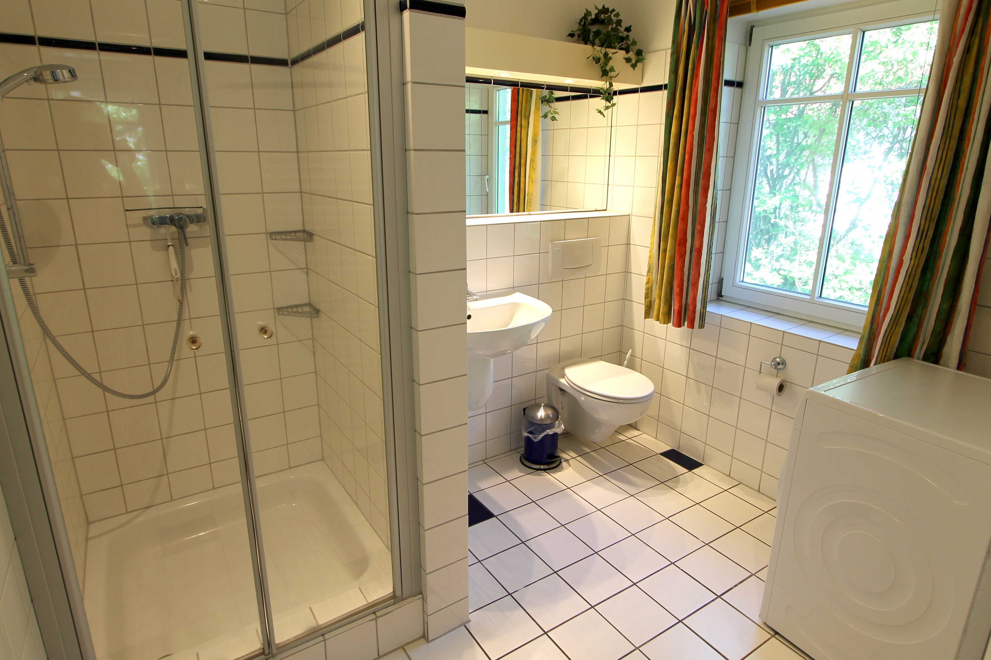 Das Badezimmer verfügt über eine Dusche, WC und Waschmaschine, es ist zusätzlich ein Gäste- WC vorhanden.