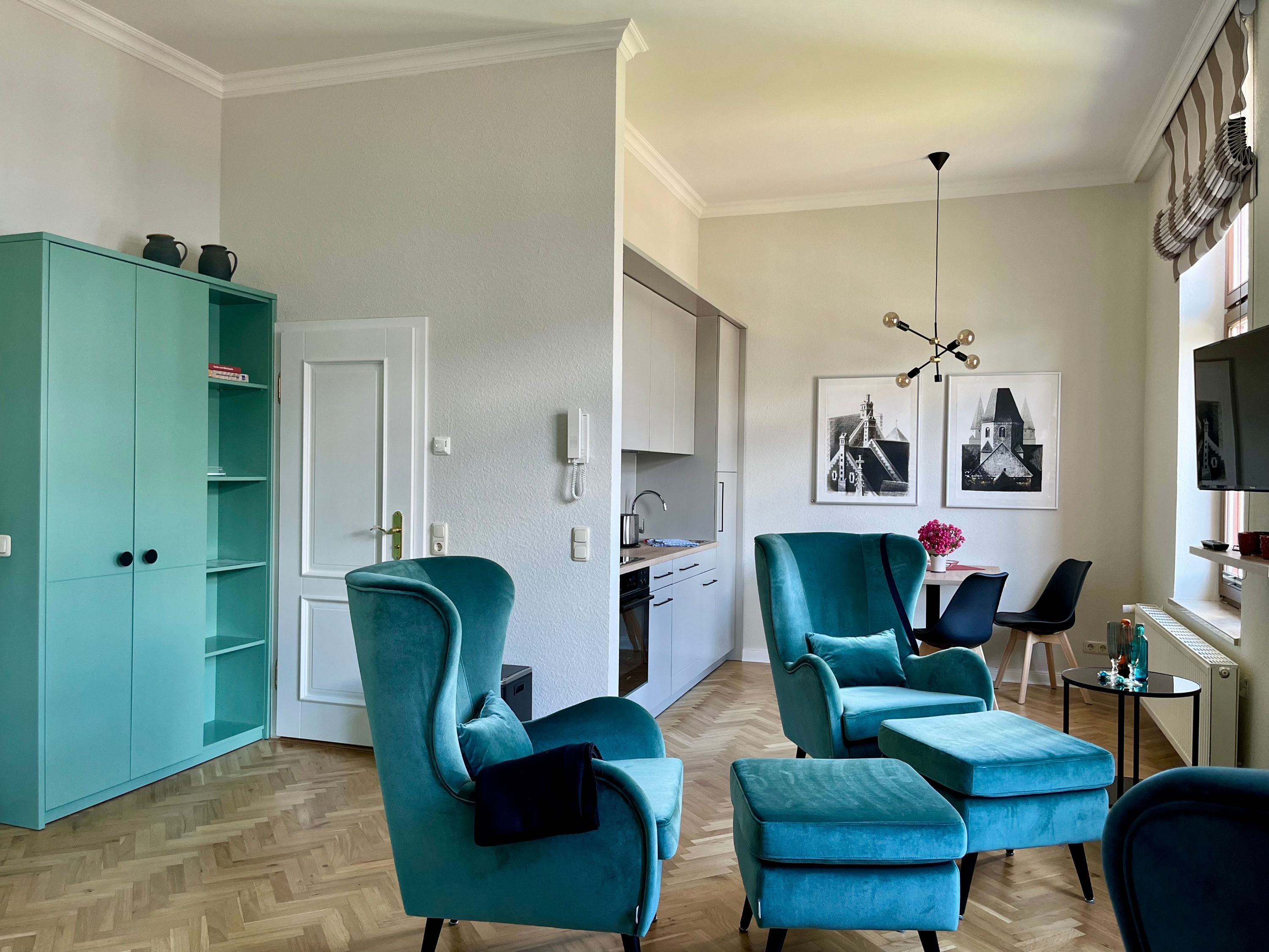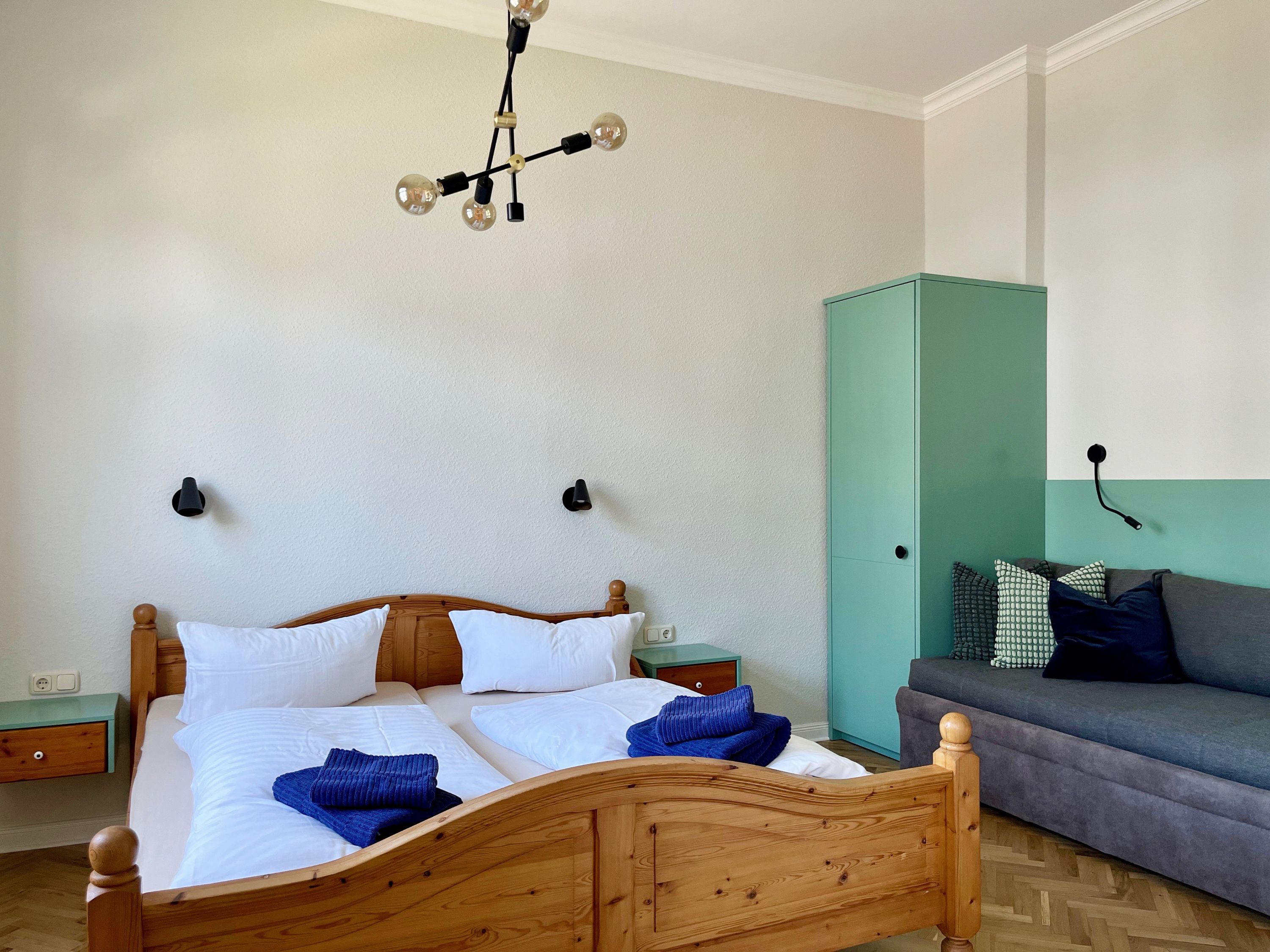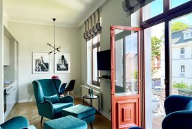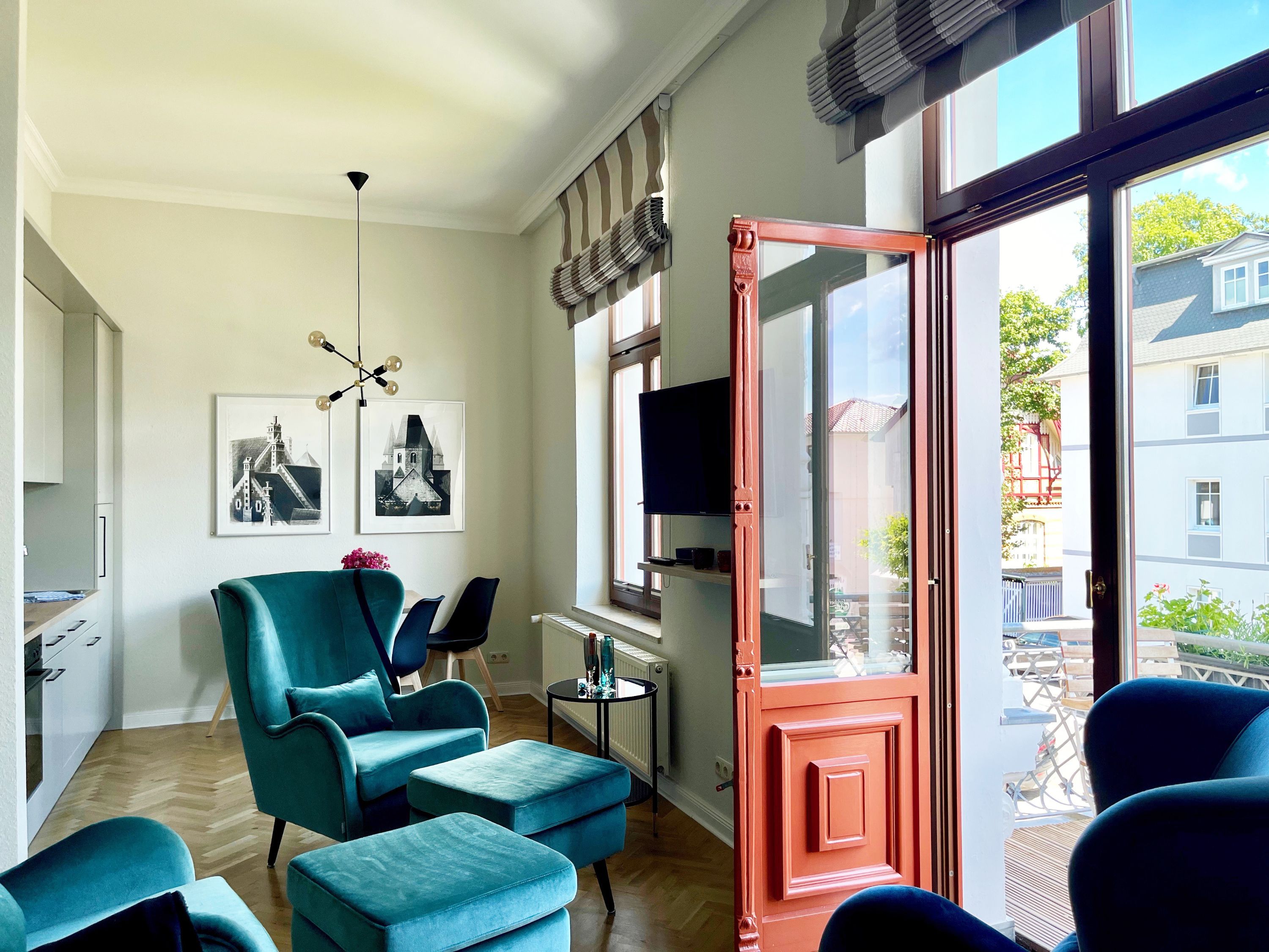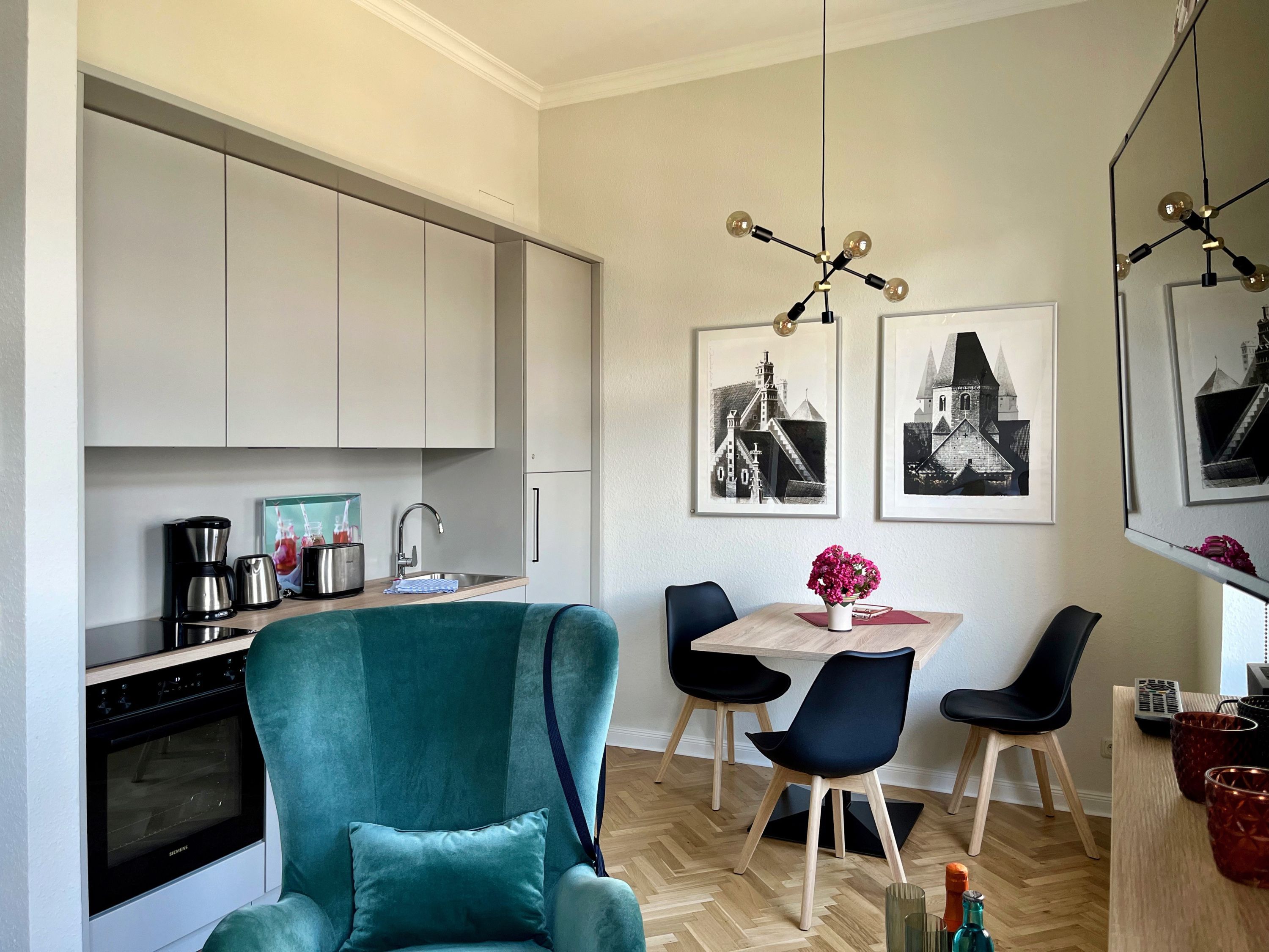 Unsere Ferienwohnung mit kleinem Balkon ist modern eingerichtet. Sie wohnen in historischem Ambiente mit hohen Räumen, Kassettentüren und Parkettböden - ergänzt mit Einbaumöbeln, die viel Stauraum bieten.