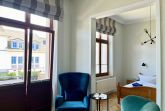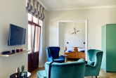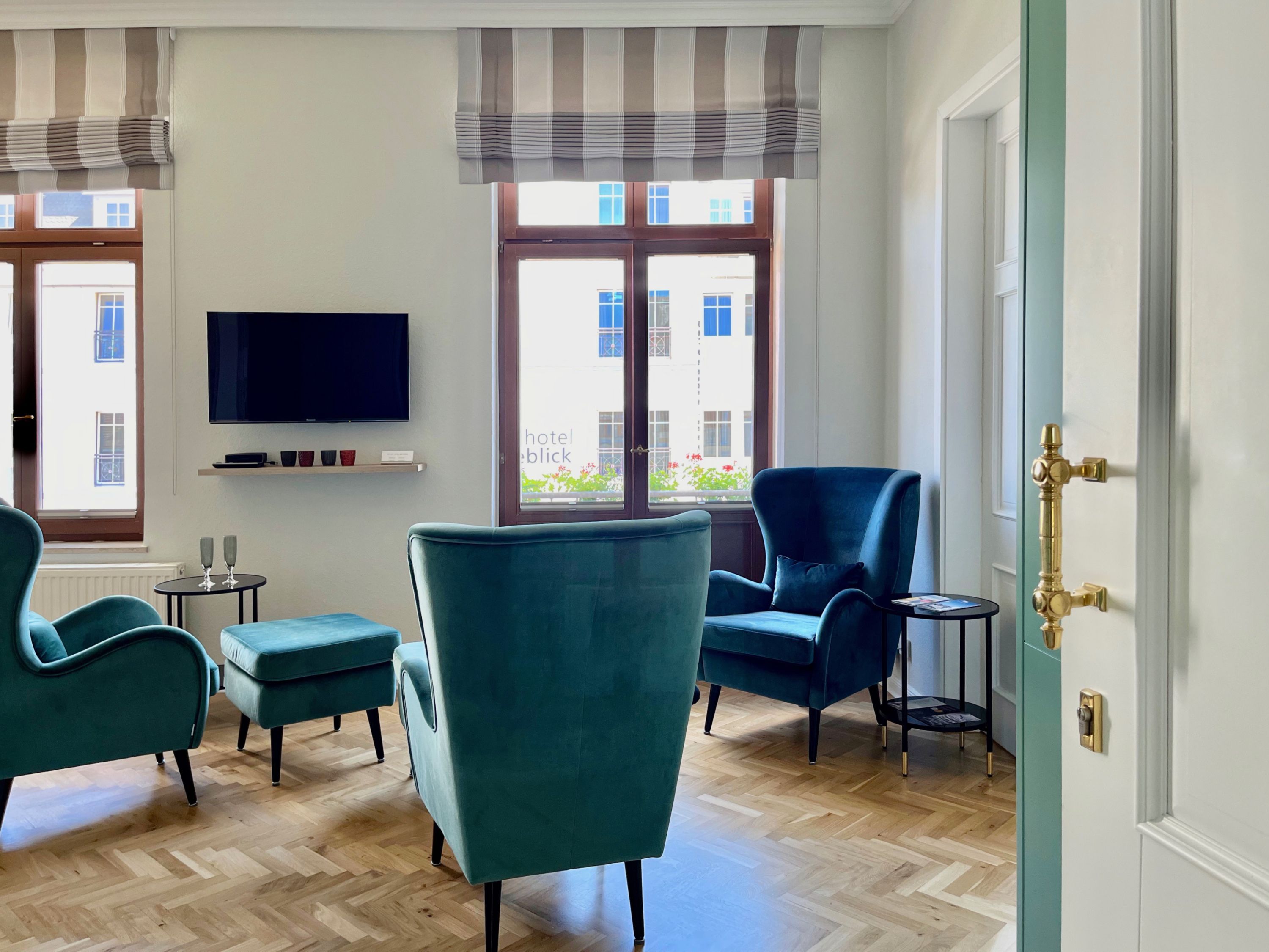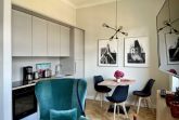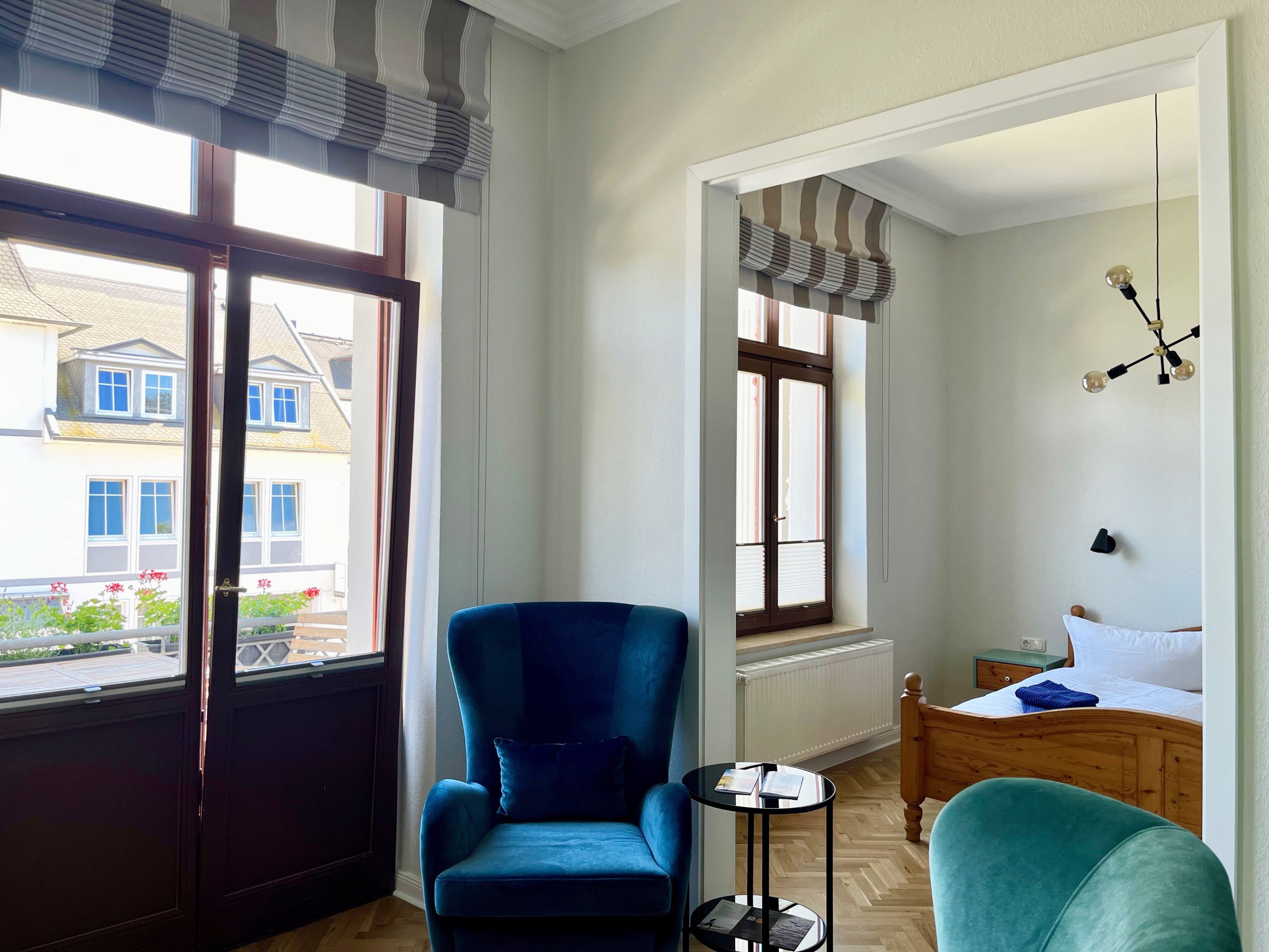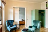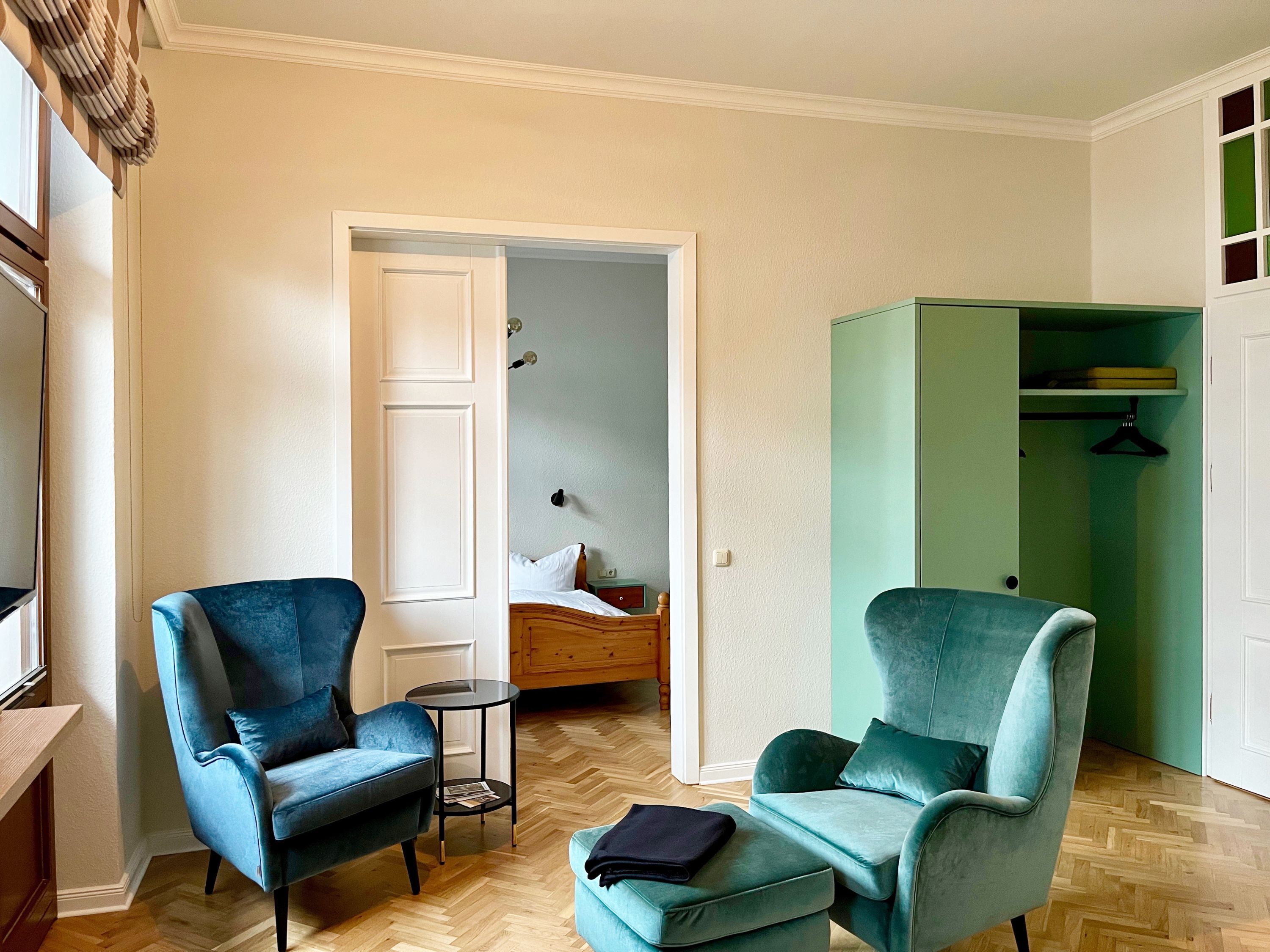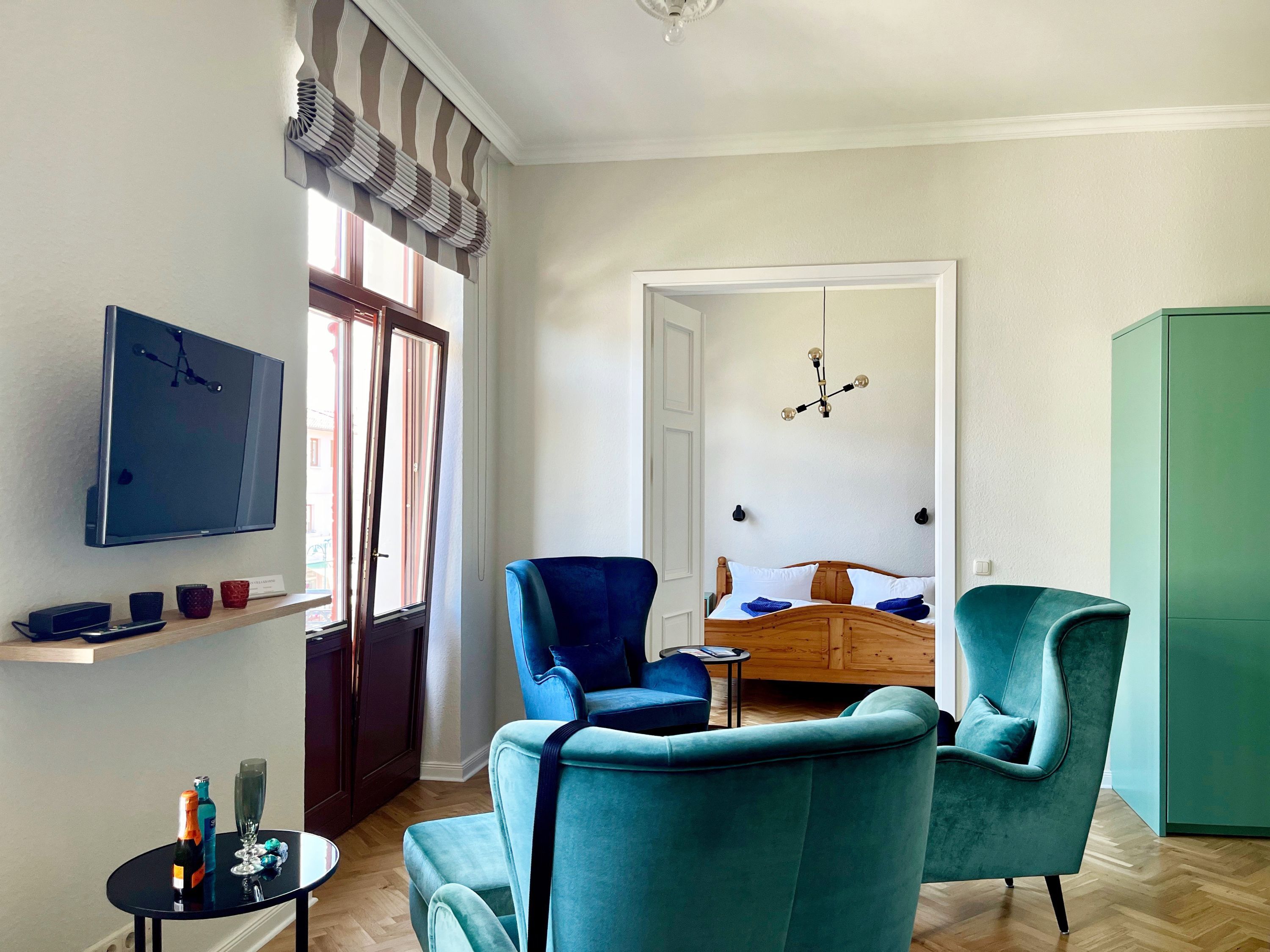 Unsere Ferienwohnung mit kleinem Balkon ist modern eingerichtet. Sie wohnen in historischem Ambiente mit hohen Räumen, Kassettentüren und Parkettböden - ergänzt mit Einbaumöbeln, die viel Stauraum bieten.