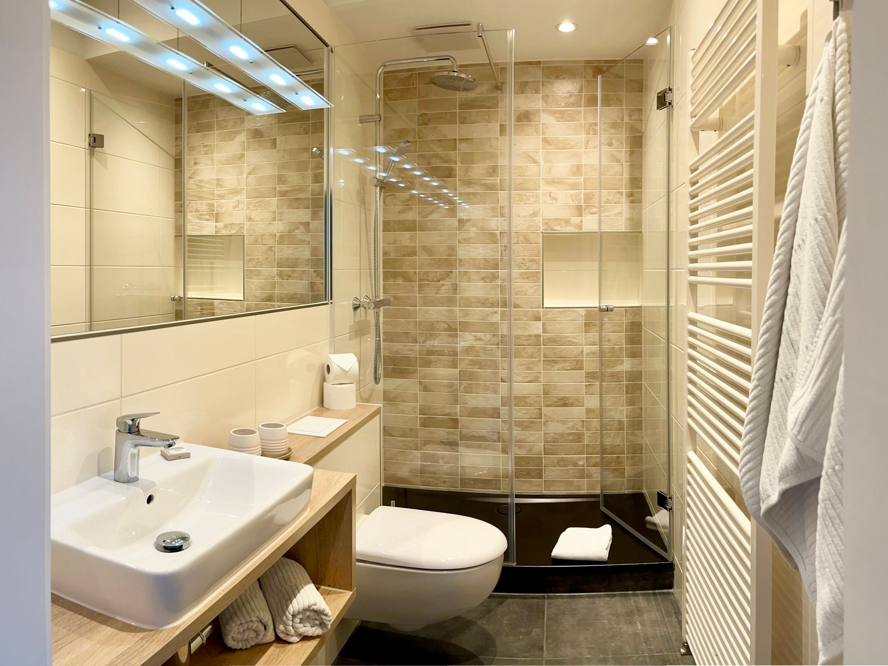 In den Wohnraum integriert ist eine Komfort-Küchenzeile (Spülmaschine, Cerankochfeld, Backofen, Kühlschrank mit Gefrierfach, Wasserkocher, Toaster, Filter-Kaffeemaschine) und ein Essplatz für 3 Personen. Gemütliche Ohrensessel mit Fußhockern bieten beste Voraussetzungen zum Entspannen. Es steht ein zuverlässiges W-LAN-Netz und Smart-TV zur Verfügung sowie ein DVD-Player und ein Bluetooth-Lautsprecher - zur einfachen Verbindung mit dem Smartphone, iPad oder einem anderen bluetoothfähigen Gerät. Zusätzlich zum Doppelbett gibt es im Schlafzimmer eine bequeme Polsterliege. Diese kann als Bett für die 3. Person genutzt werden oder bietet als Sofa einen gemütlichen Leseplatz. Das freundliche moderne Badezimmer ist mit Dusche, Handtuchheizkörper und Fußbodentemperierung ausgestattet.