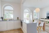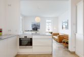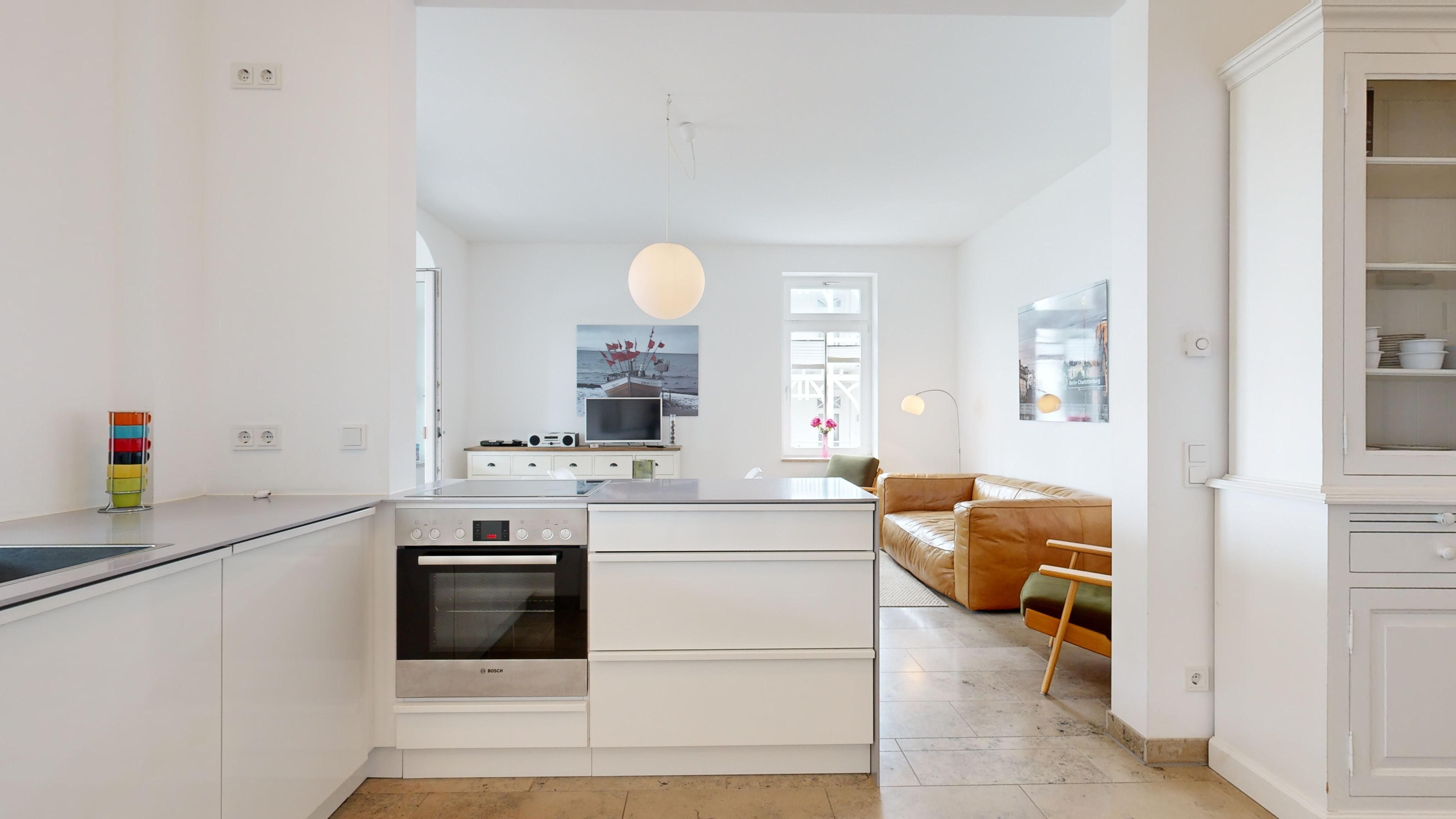 Küche: Hochwertige, neue Küchenzeile im Wohnraum integriert mit Ceran-Herd und Backofen, Spülmaschine, Kühlschrank mit Gefrierfach, Kaffeemaschine, Toaster, Wasserkocher