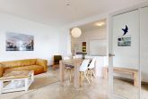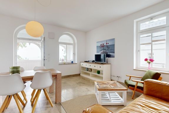 Wohnzimmer: Heller, freundlicher Wohnraum mit einer gemütlichen Couchl, Sessel, LCD-Flachbildschirm, Blue-Ray-Recorder, Stereoanlage, Internetzugang (WLAN inkl.), Esstisch für 4 Personen, großer Balkon mit Meerblick