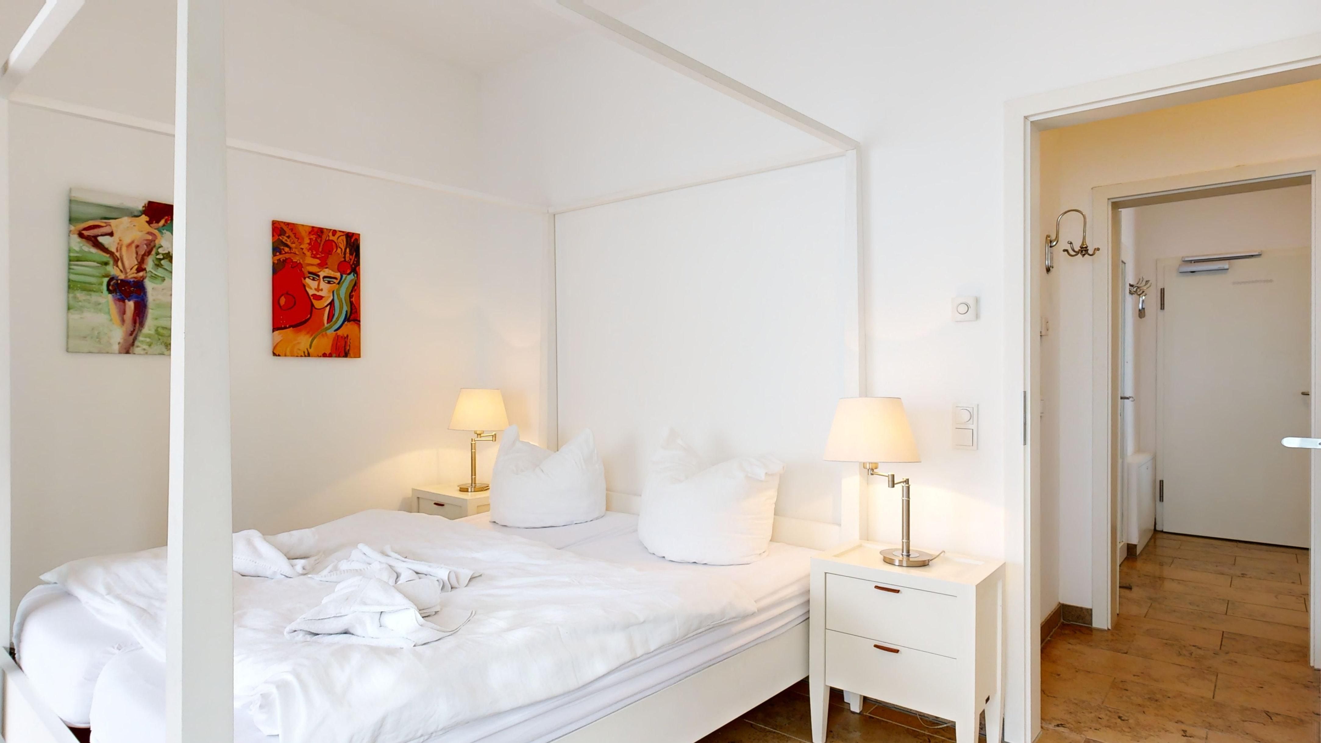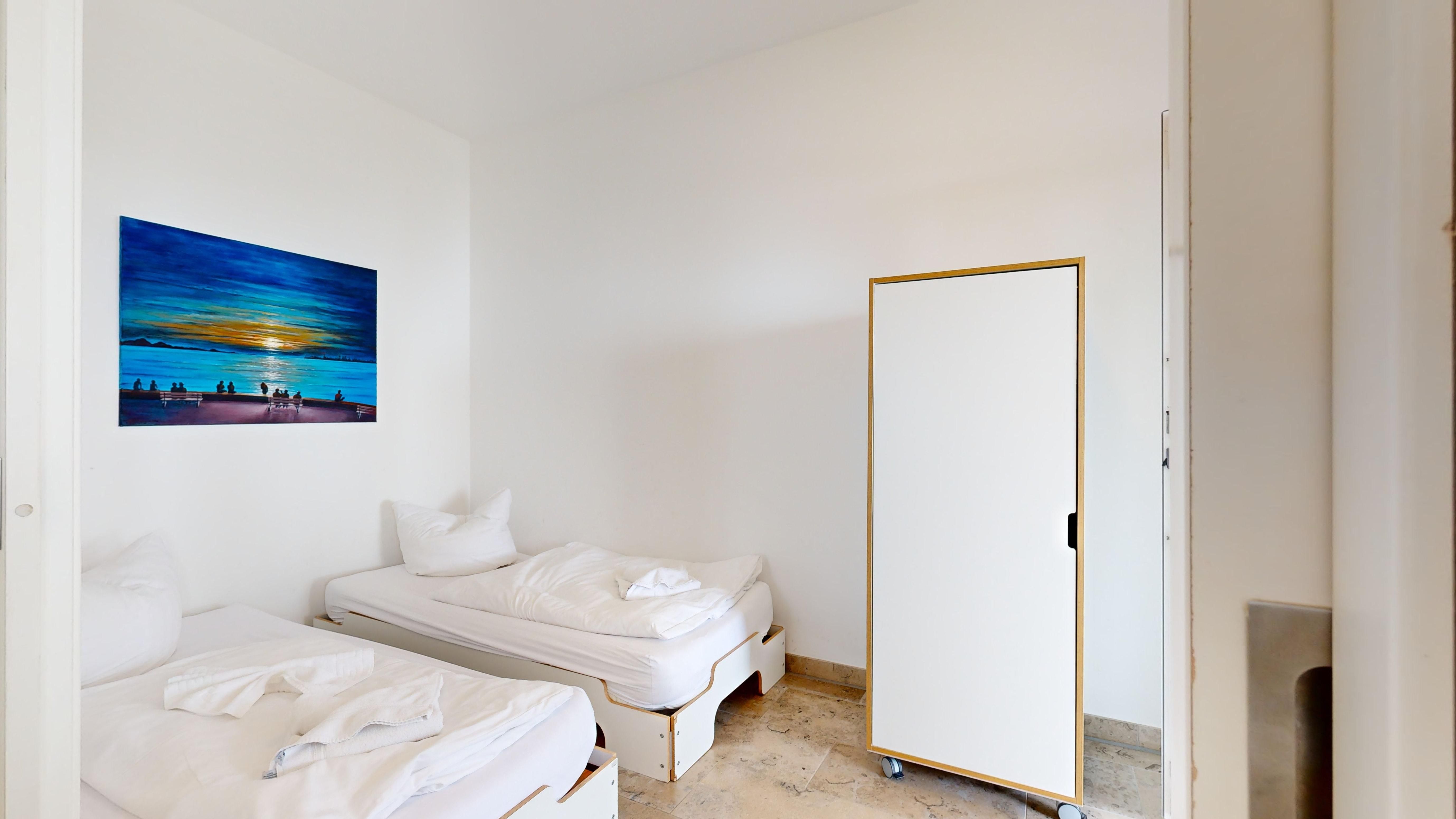 1 kleineres Schlafzimmer mit zwei Stapelliegen (90 x 200 cm), kleiner Kleiderschrank, Meerblick