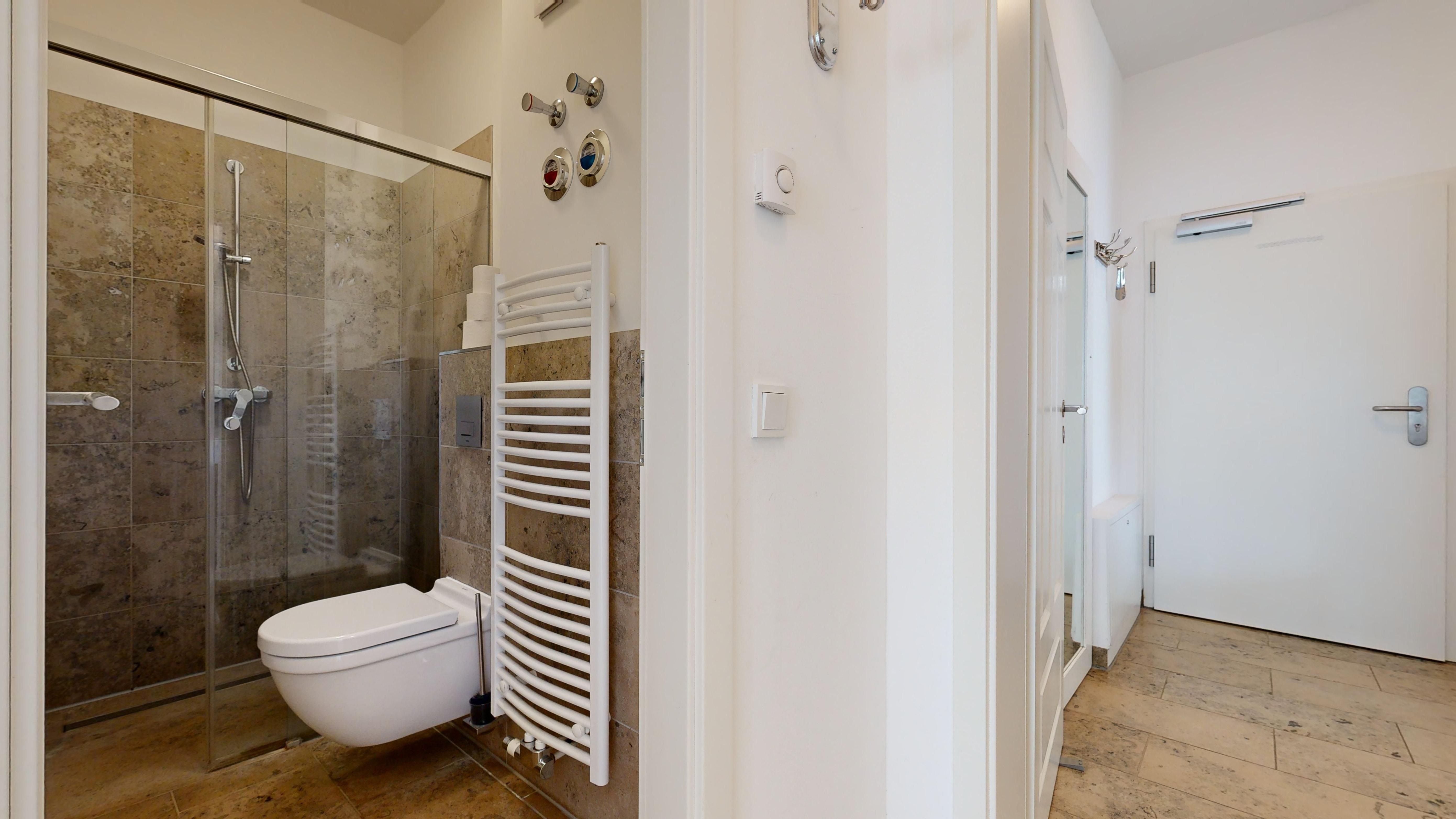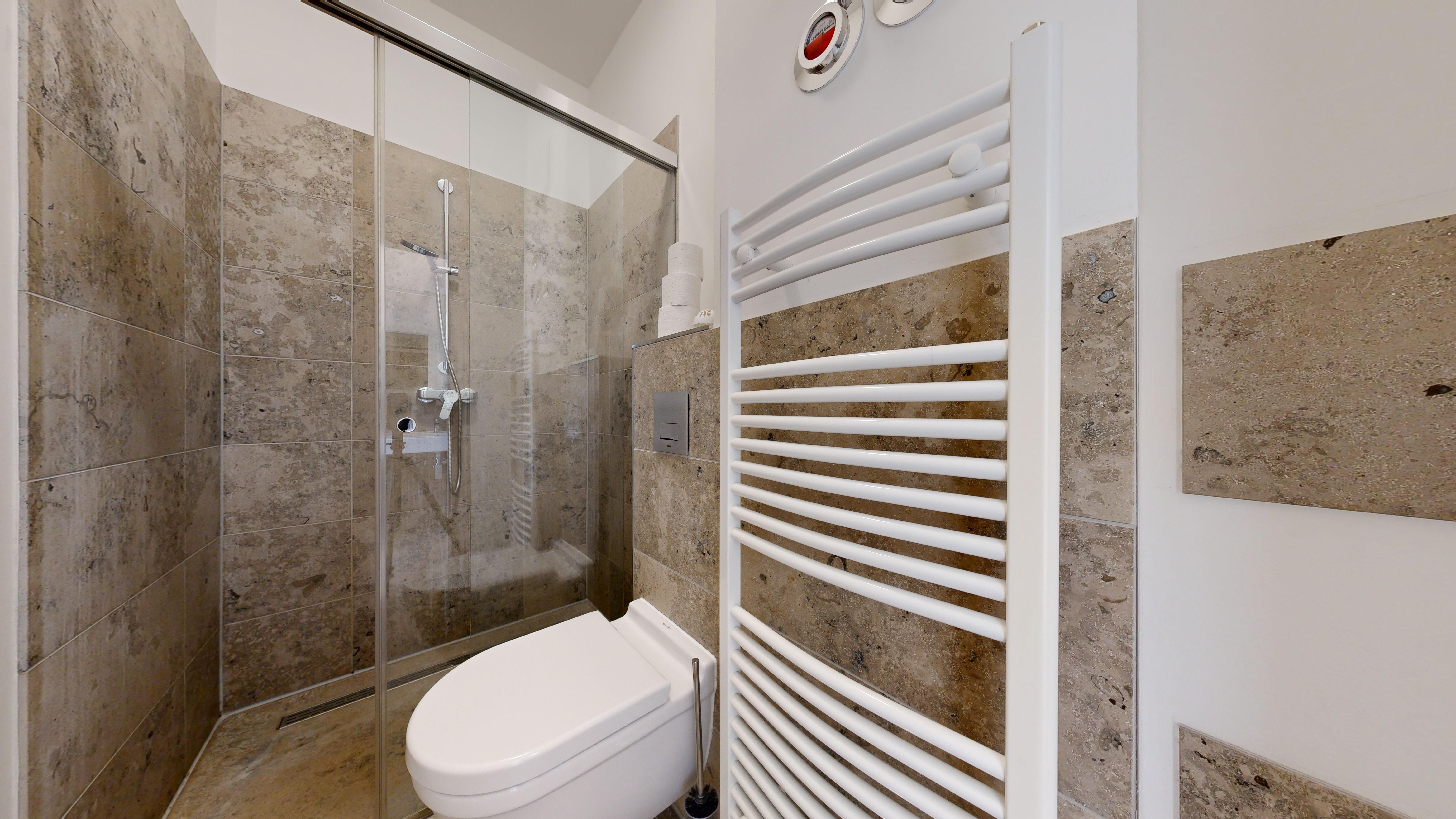Badezimmer mit Dusche, Waschbecken, WC, Föhn, Handtuch-Heizkörper