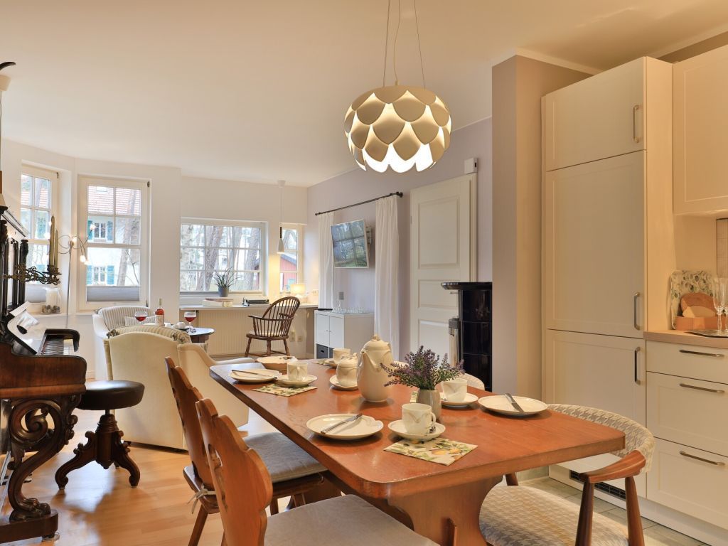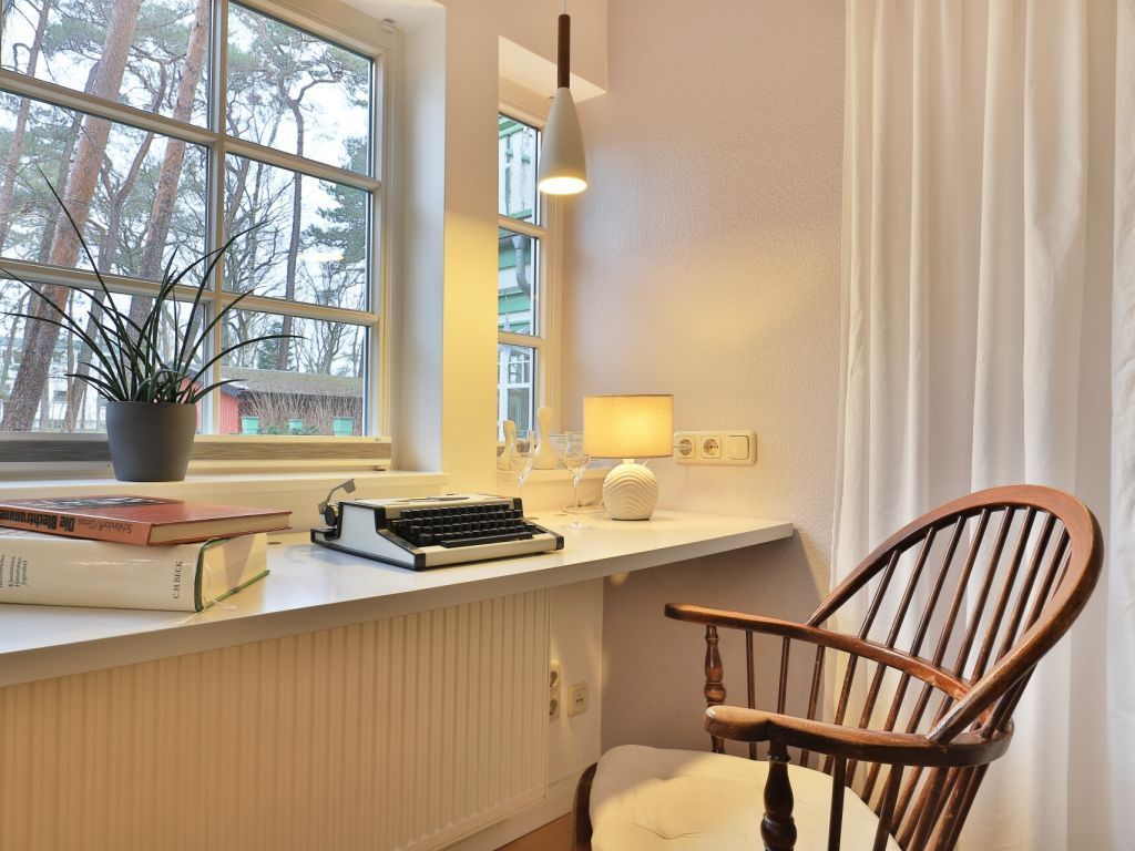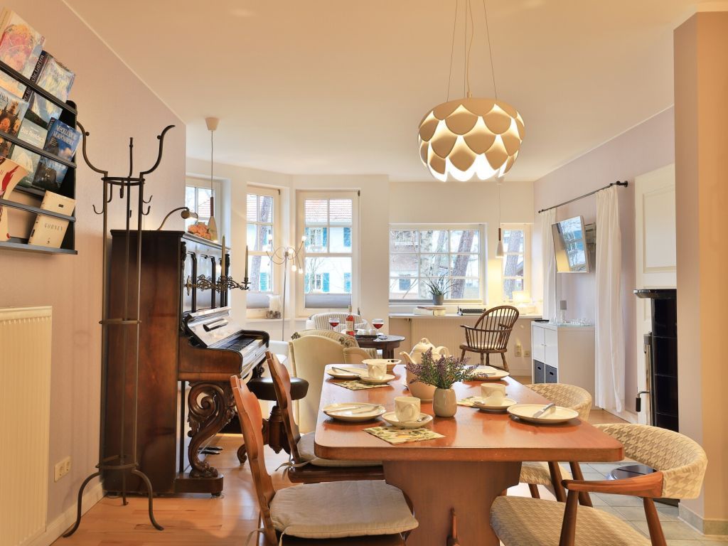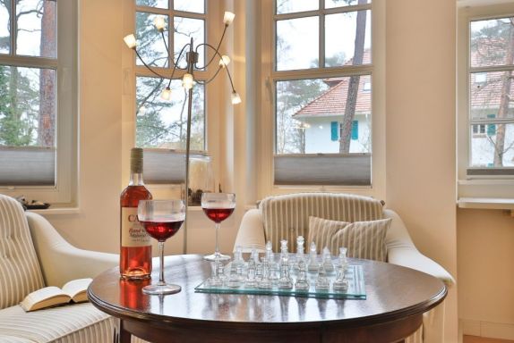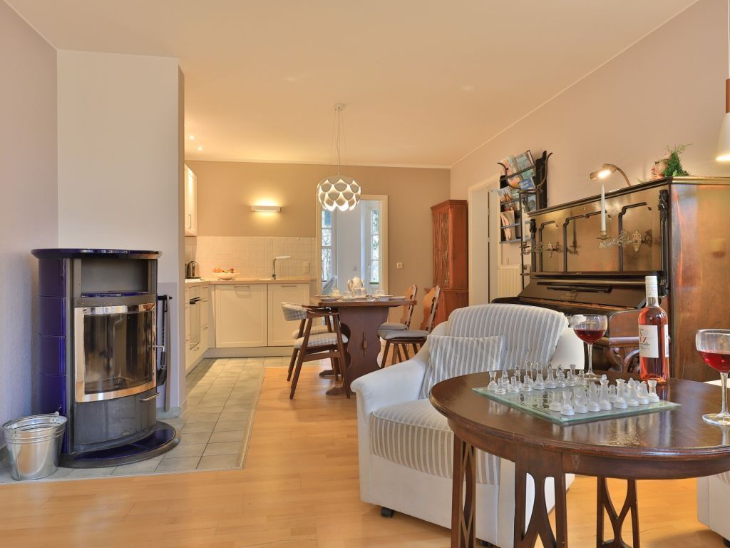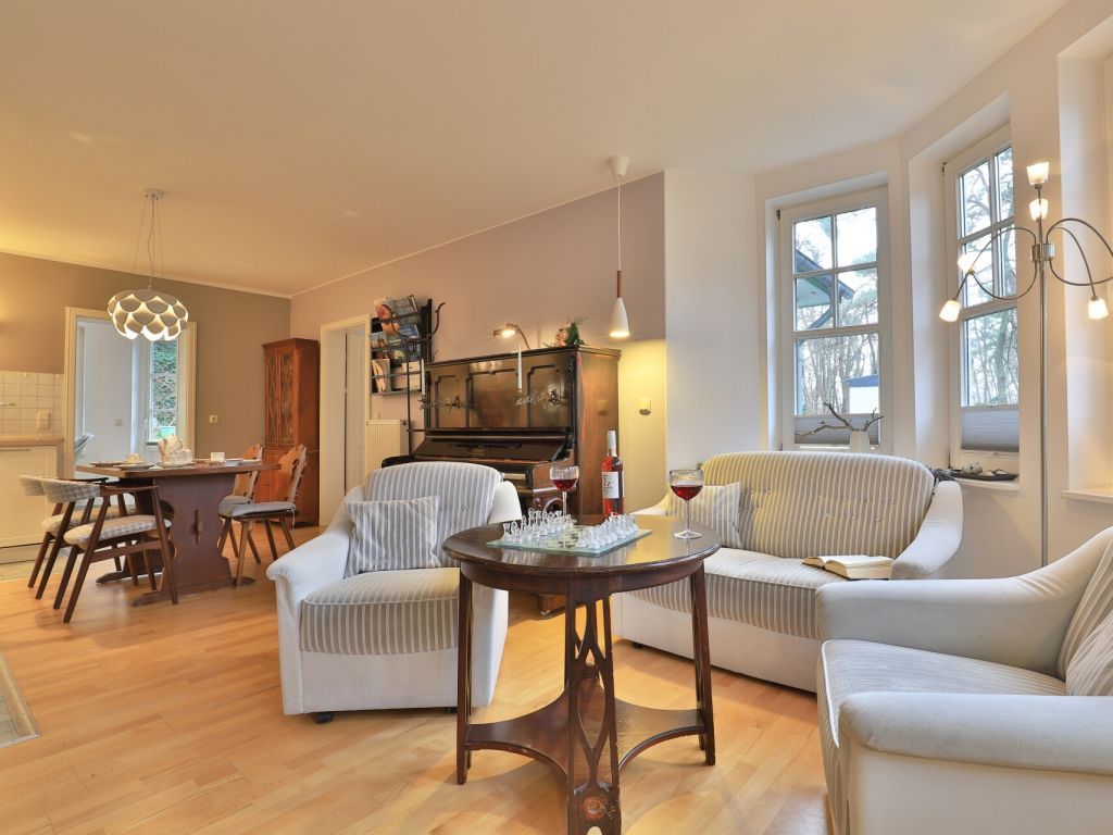 Die 2,5 Zimmer Suite Möwe- mit Terrasse, bietet eine großzügige Wohnfläche von 60qm und ist ideal für zwei Gäste. Sehr komfortabel empfängt Sie der gehoben möblierte Wohn-Essbereich mit einer bequemen Sofagarnitur, Kaminofen, Schreibplatz, Klavier, Fernseher. WLAN nutzen Sie kostenfrei. Die offene Einbauküche, mit Esstischtisch, ermöglicht vorteilhaft die Selbstversorgung mit: Ceranfeldherd, Backofen, Dunstabzug, Kaffeemaschine, Wasserkocher, Toaster u.v.m. Hervorzuheben ist der charmant möblierte Wintergarten mit Blick in den Waldpark und Zugang zur Terrasse, die Sie über fünf Stufen erreichen. Erholsam schlafen Sie im separaten Schlafzimmer mit Doppelbett, Kleiderschrank und einem Sekretär. Bei Anreise sind Ihre Betten bereits für Sie bezogen und Handtücher liegen bereit. Das vom Schlafzimmer zu betretene Tageslichtduschbad ist mit einer Dusche, Waschtisch, Föhn und WC ausgestattet.
