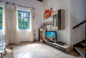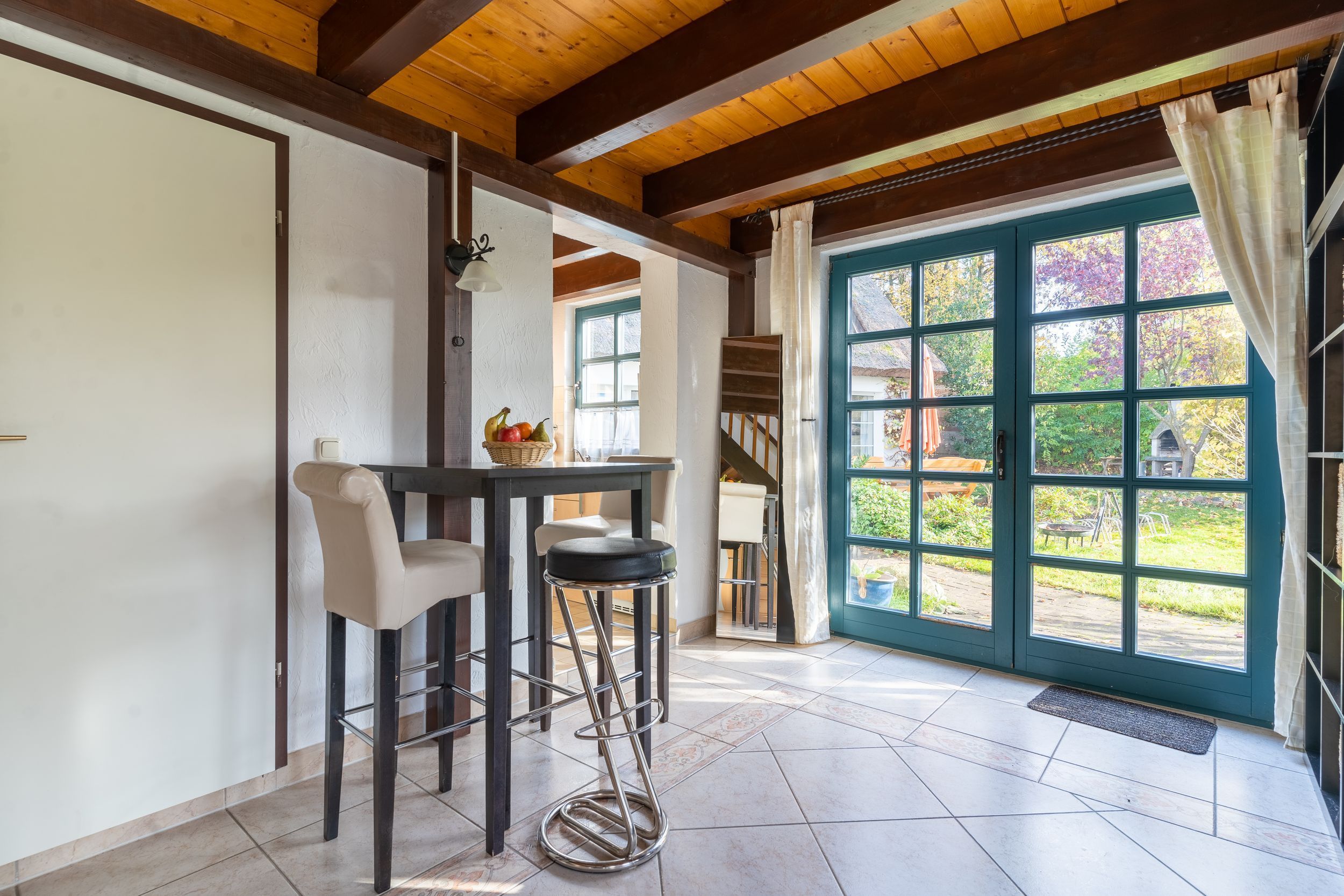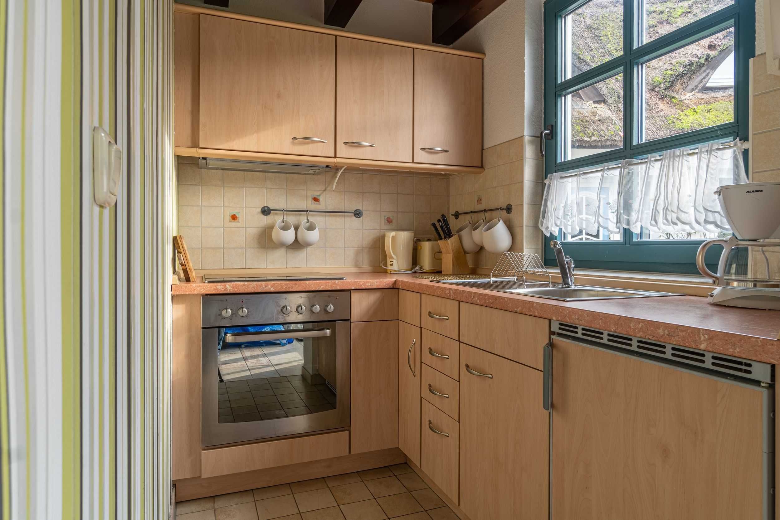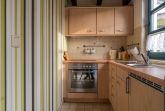 Die Ferienwohnung bietet auf 52 qm Platz für bis zu 2 Personen (Aufbettung 1 Person bis 10 Jahre möglich). Der Wohnbereich im Erdgeschoß verfügt über eine große Couch, TV und einen Essplatz. Die angrenzende Küche ist ausgestattet mit Herd, Backofen, Kühlschrank, mit Tiefkühlfach, Kaffeemaschine, Toaster, Wasserkocher.
