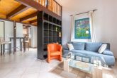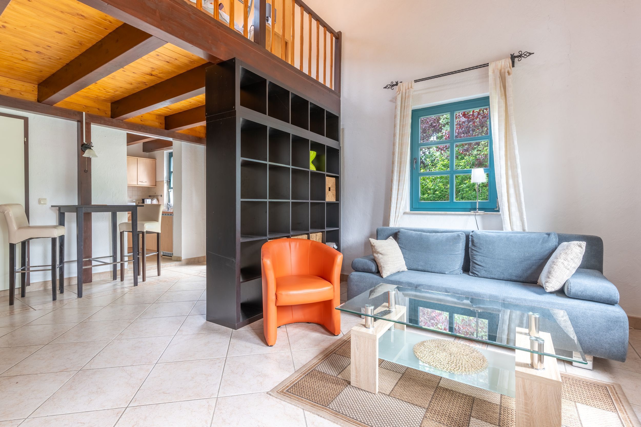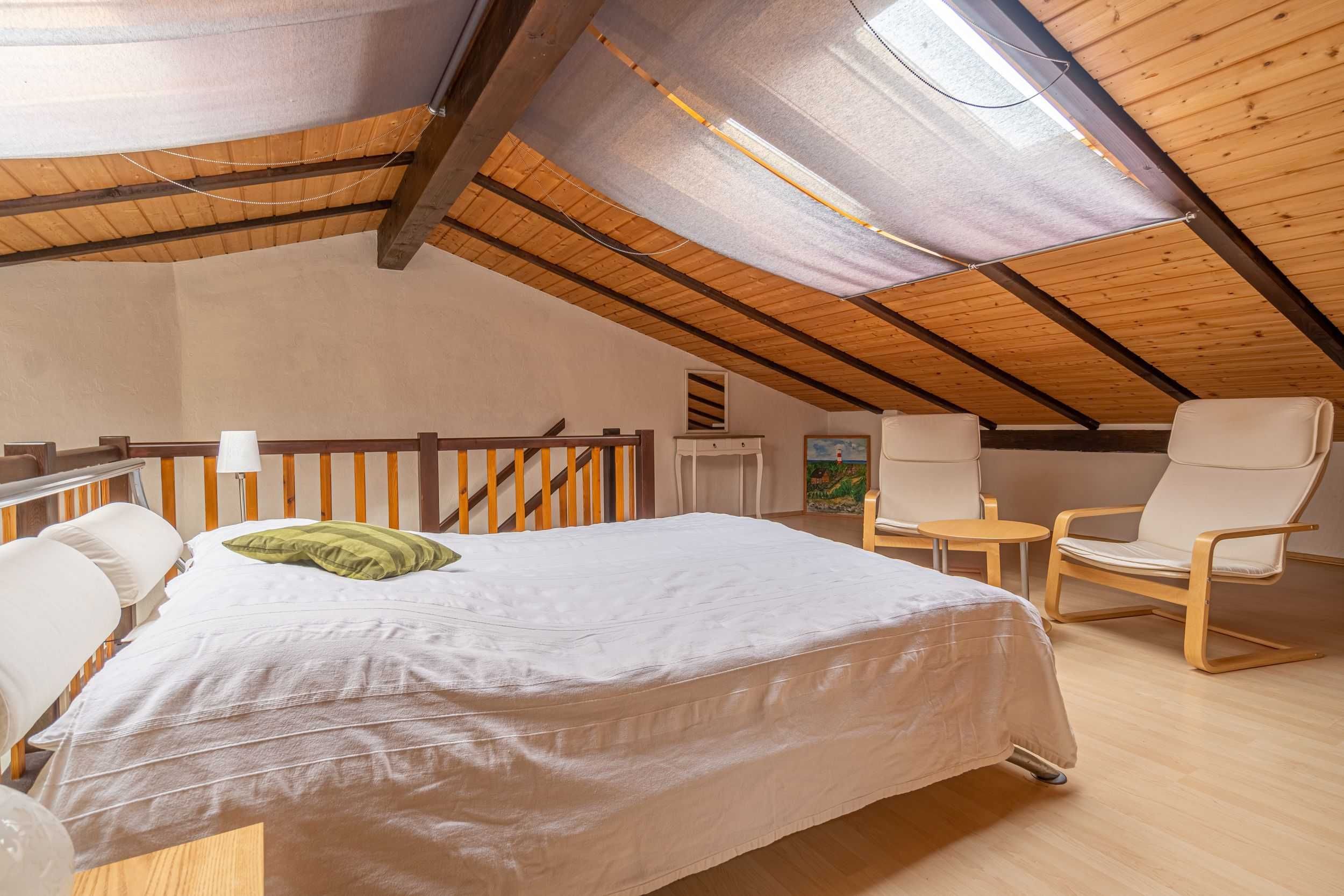 Über eine Treppe kommen Sie zur offenen Schlafgalerie mit Doppelbett sowie einer kleinen Schlafcouch.