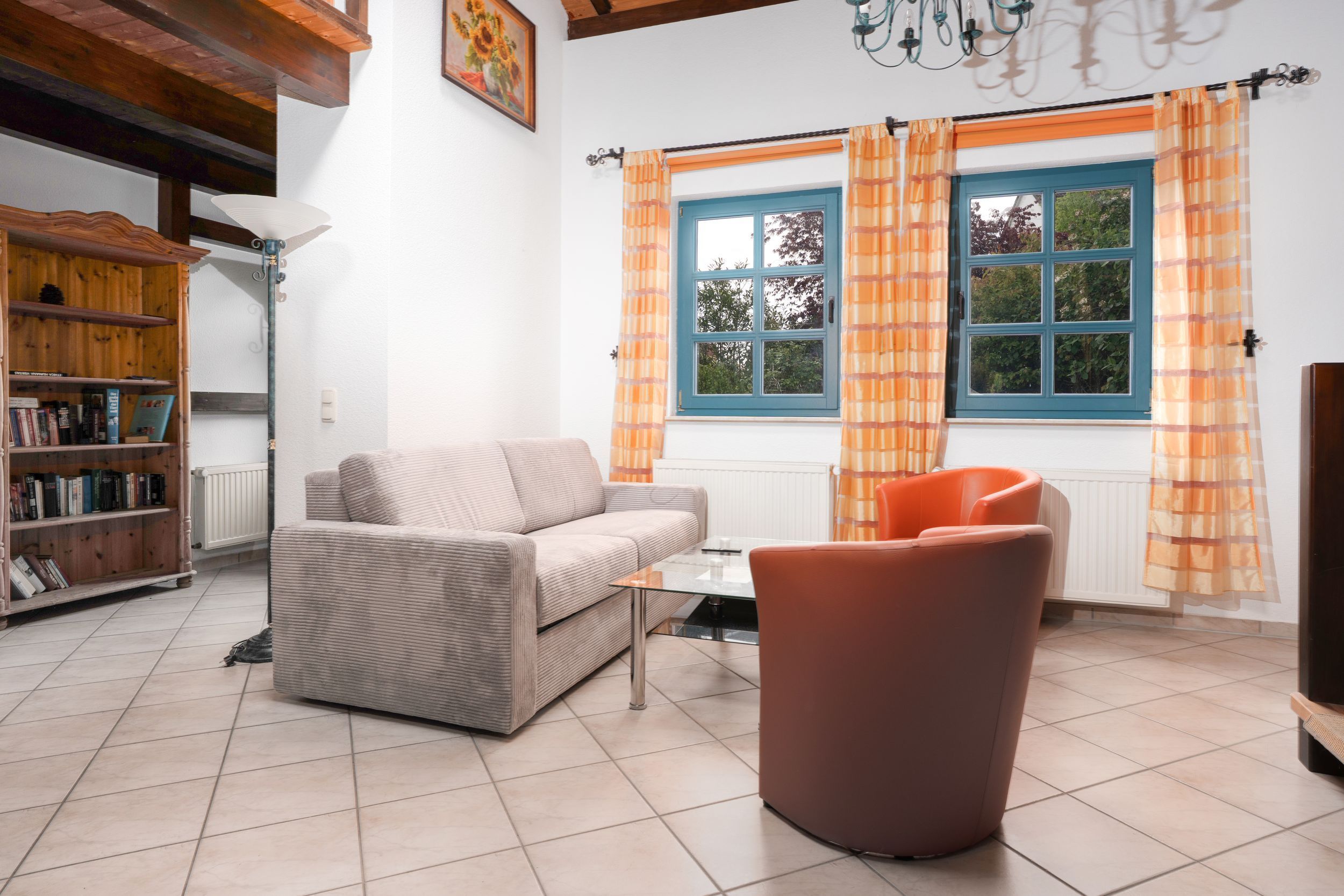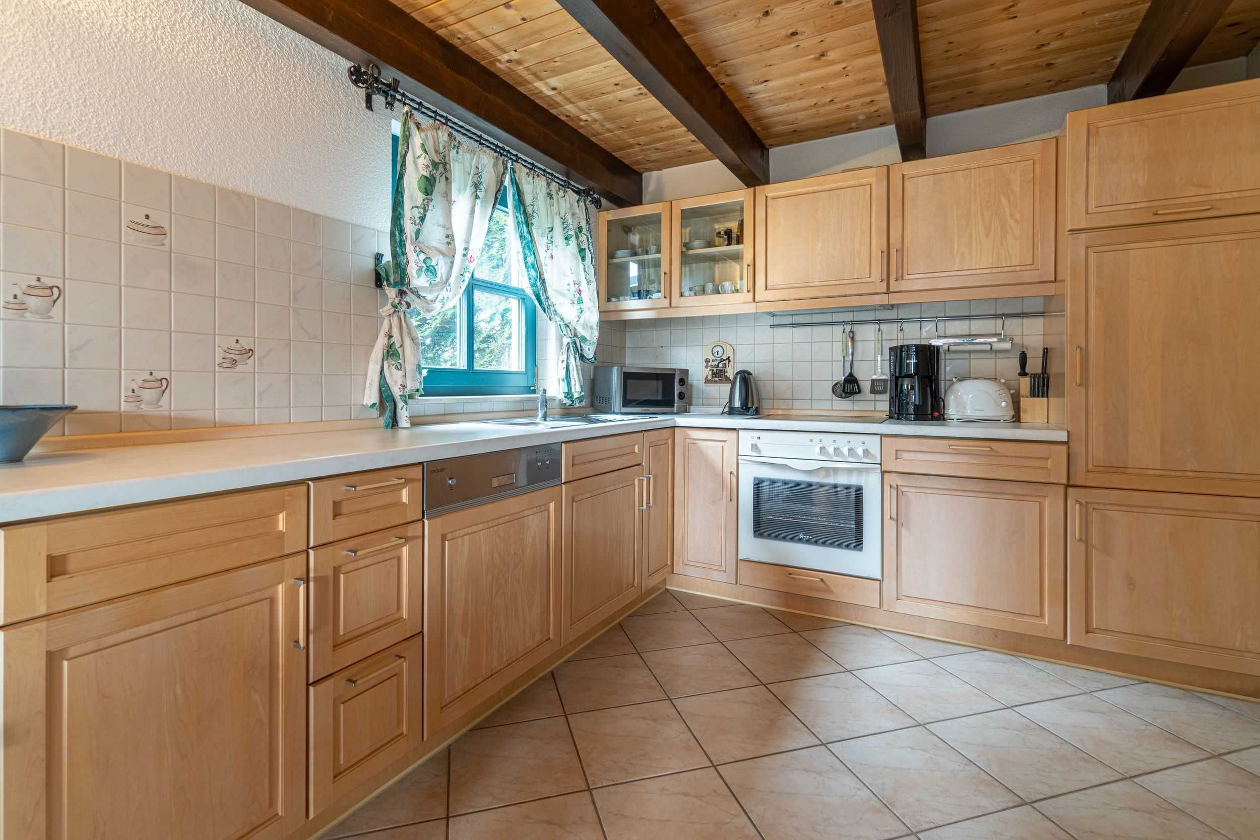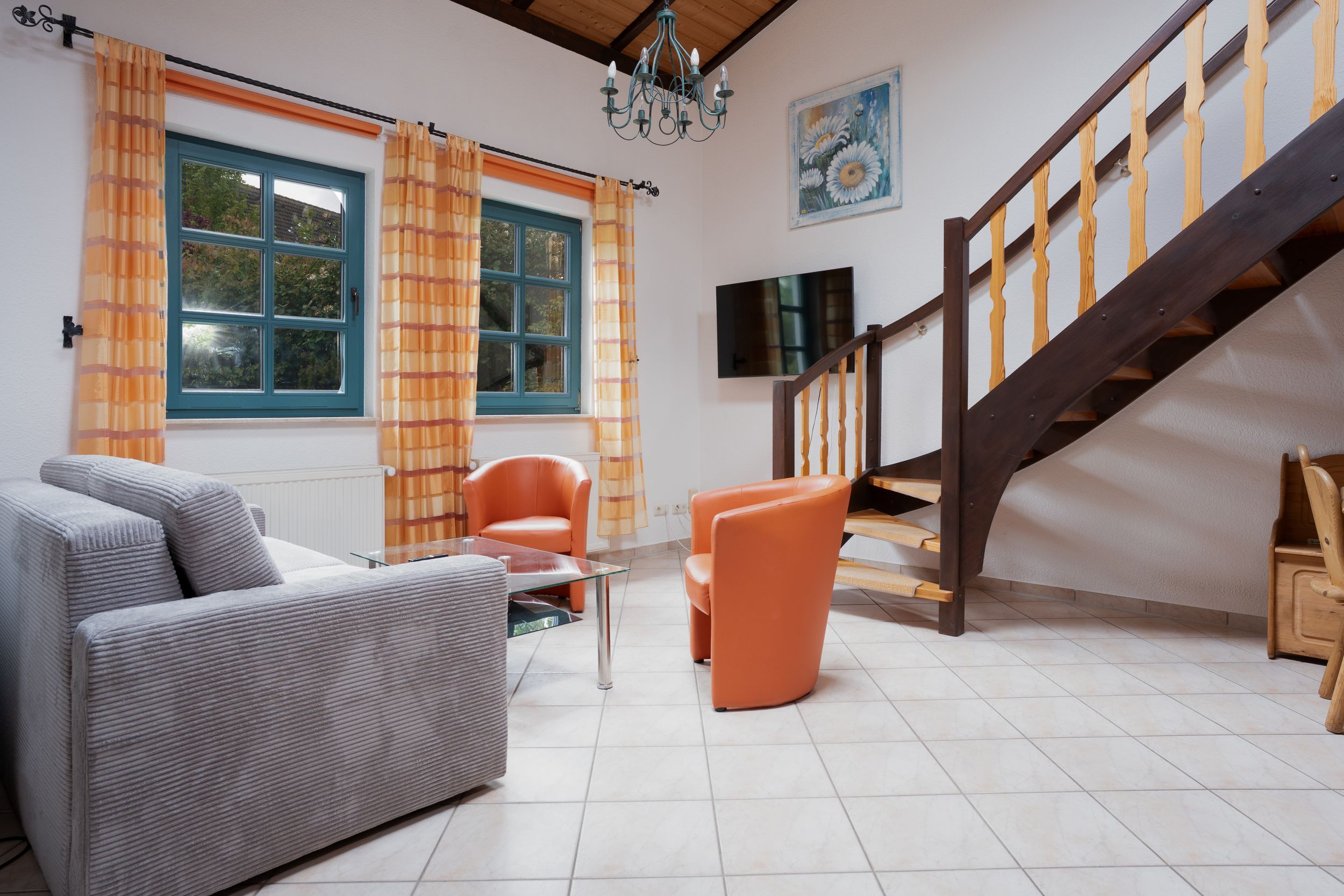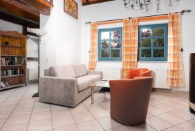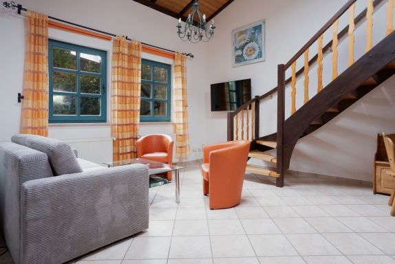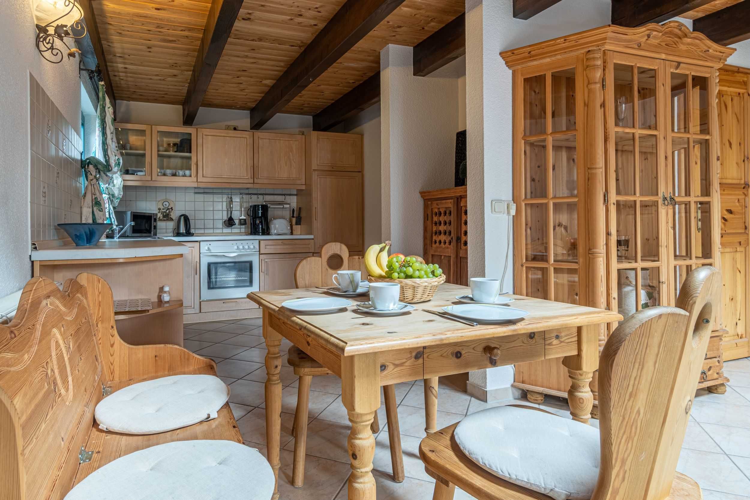 Die Ferienwohnung Katja bietet auf 55 qm Platz für bis zu 3 Personen. Der Wohnbereich im Erdgeschoß verfügt über eine Schlafcouch für 2 Personen, TV und einen Essplatz. Die angrenzende Küche ist ausgestattet mit Herd, Backofen, Kühlschrank, mit Tiefkühlfach, Geschirrspüler, Kaffeemaschine, Toaster, Wasserkocher.