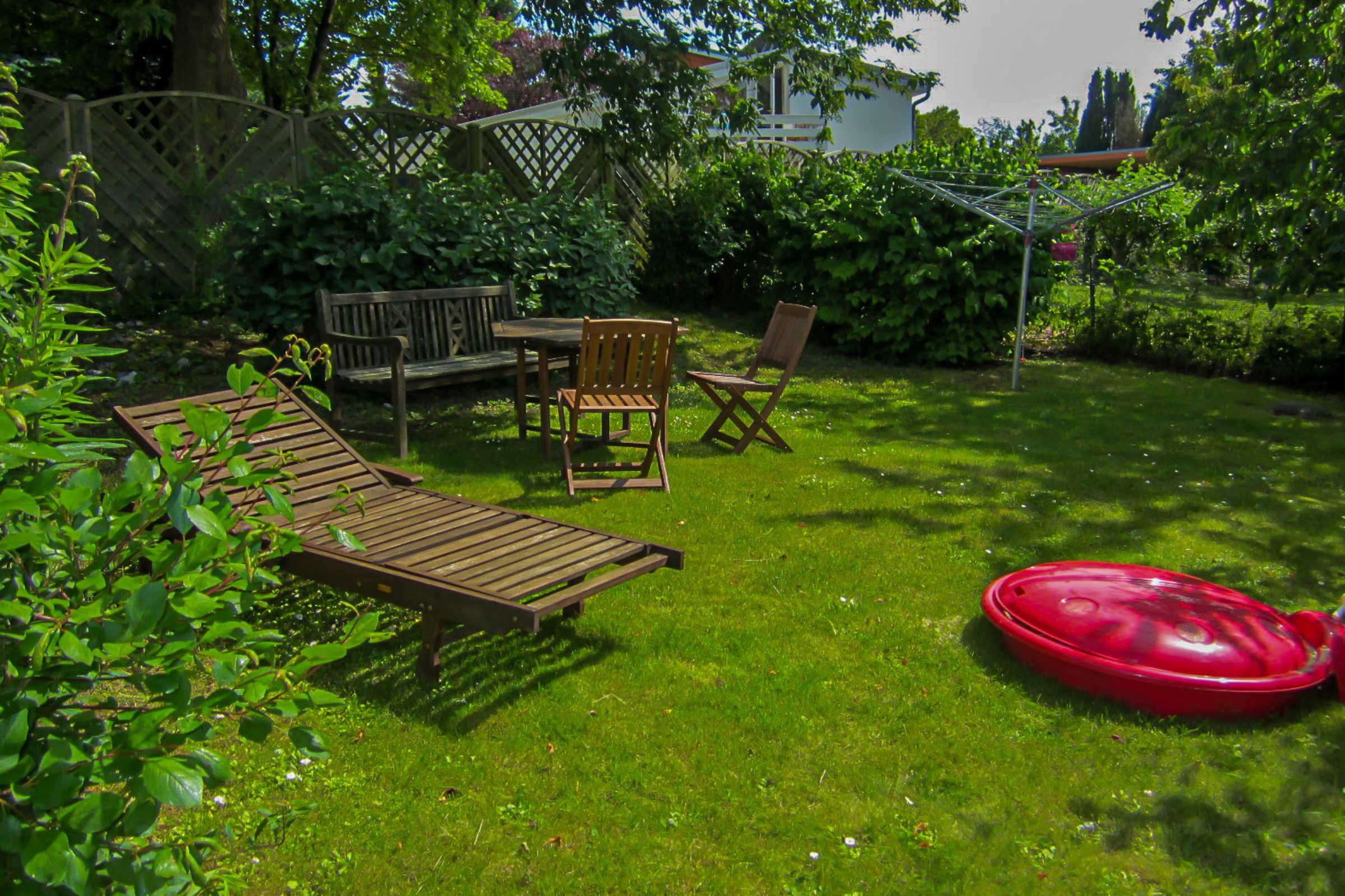 Vor der Ferienwohnung nutzen Sie eine kleine Terrasse für ein Frühstück in der Sonne. Der Grillplatz sowie der Garten steht zur Gemeinschaftsnutzung zur Verfügung.