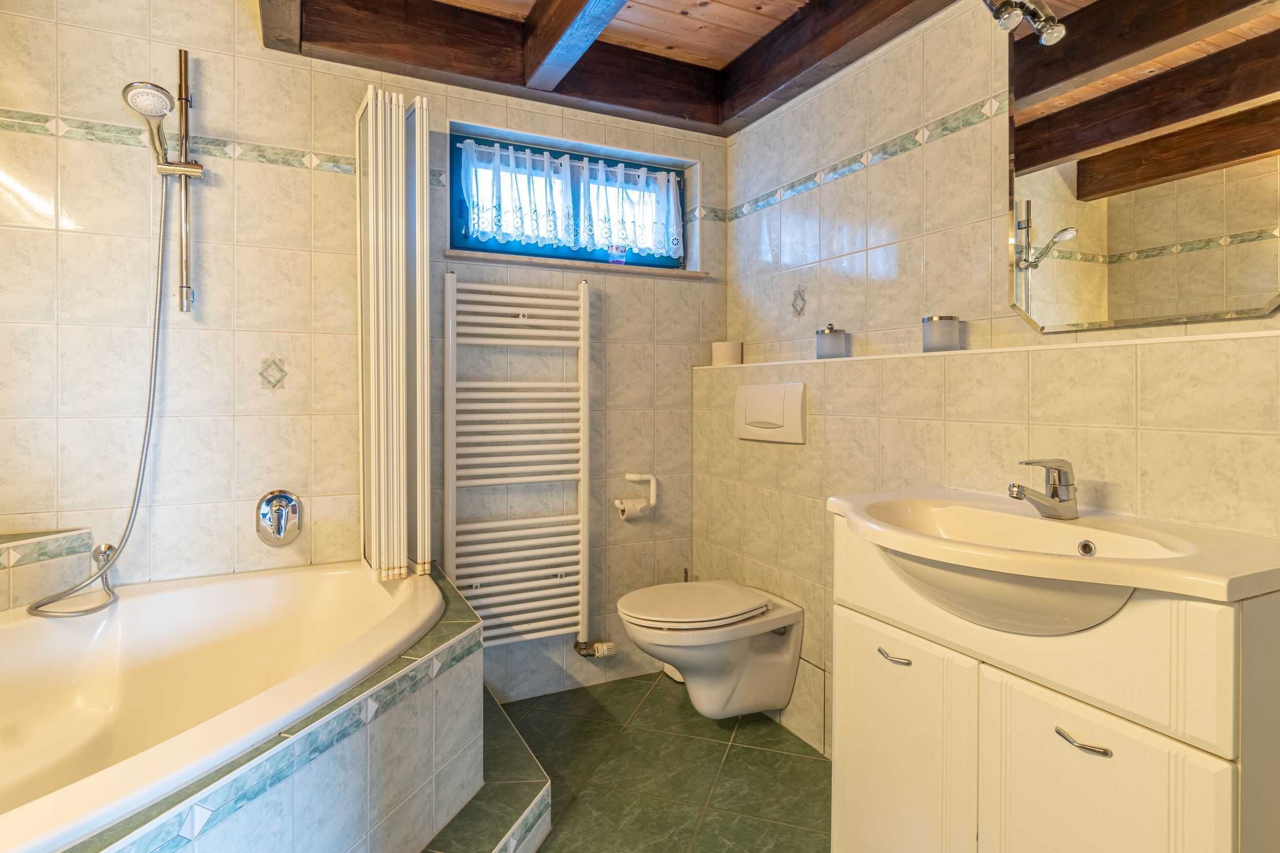 Im Erdgeschoß befindet sich auch das moderne Bad mit Eckbadewanne.
