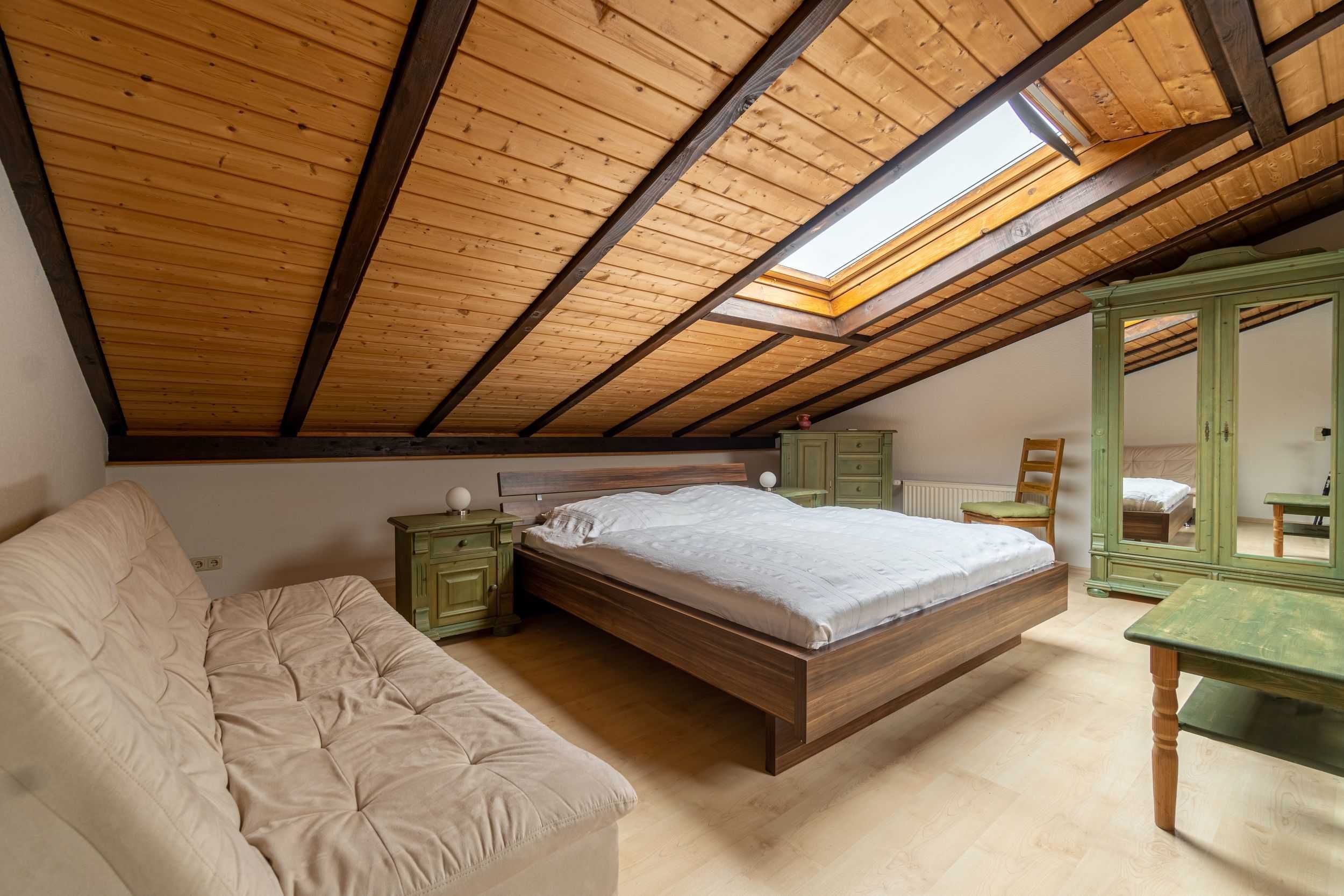 Über eine Treppe kommen Sie zur offenen Schlafgalerie mit Doppelbett und einer Schlafcouch für eine Person.