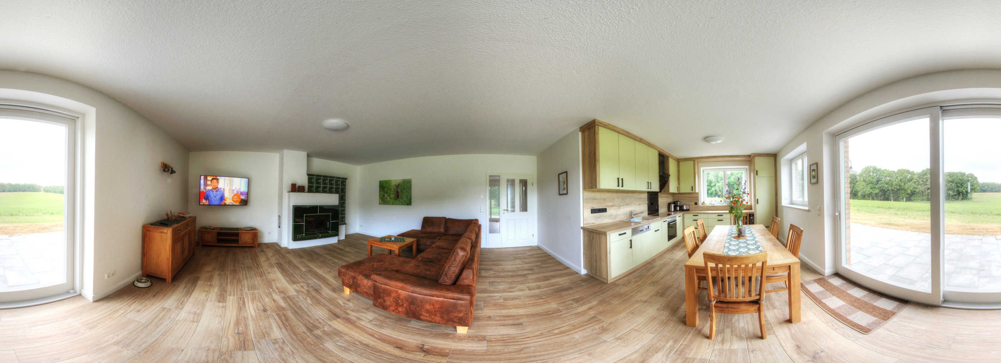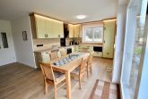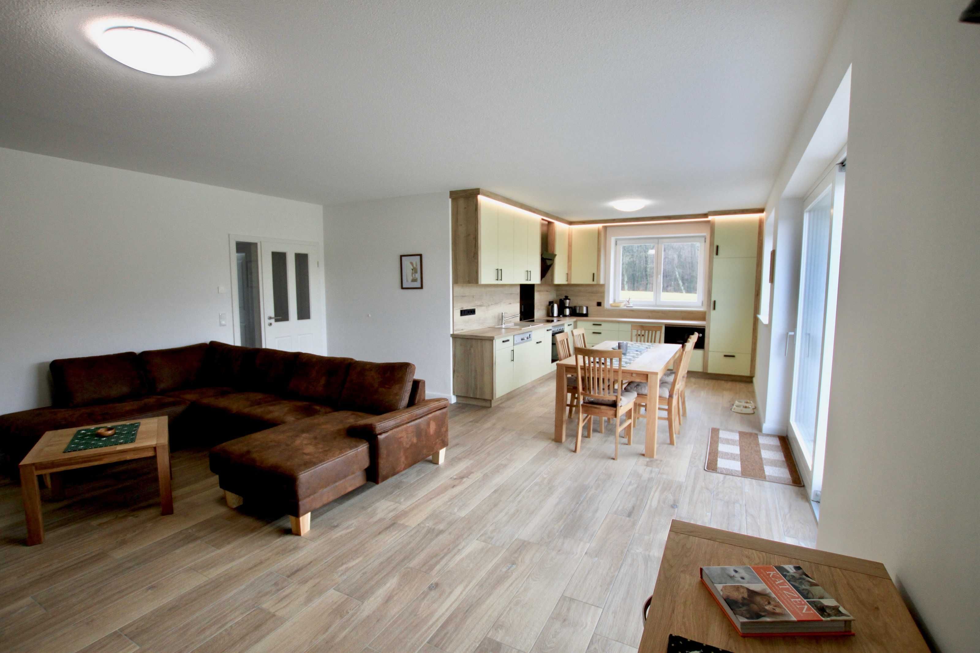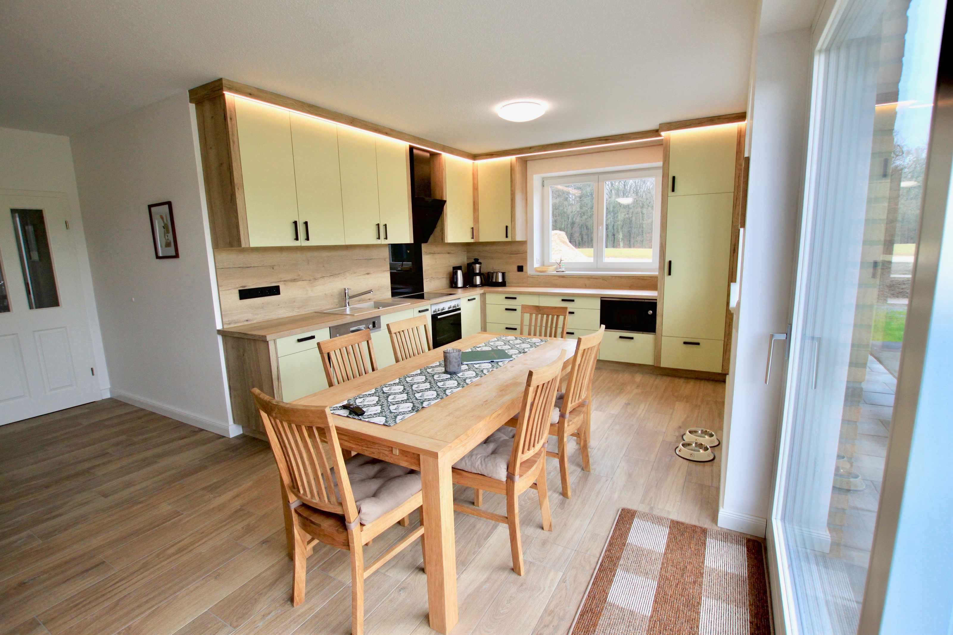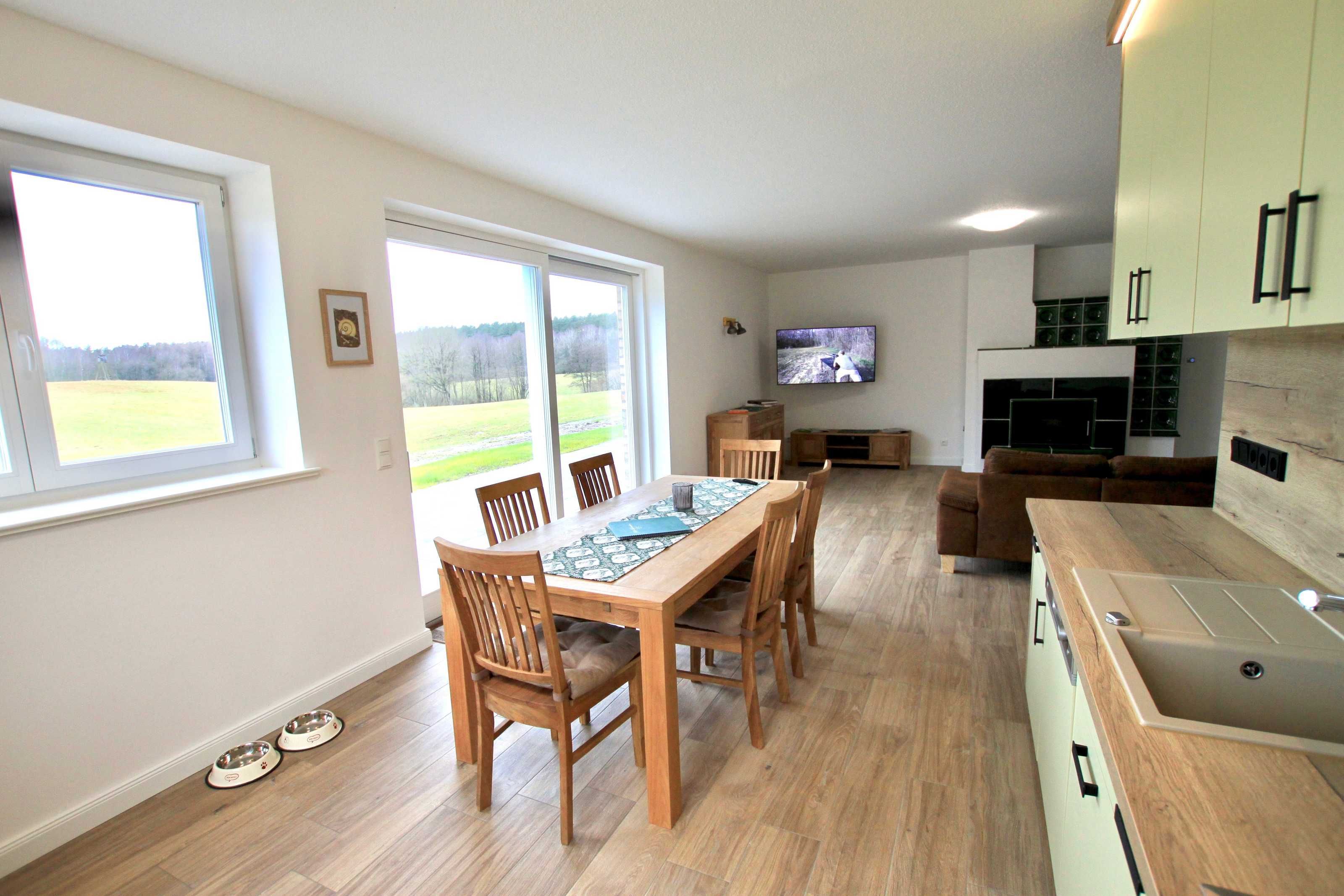 Die Ferienwohnung verfügt über eine sehr große helle Küche mit offenem Wohn- und Essbereich. Schauen sie beim Abendbrot dem Knistern des Feuers zu oder genießen Sie durch die großen Fenster die wundervolle Aussicht.
