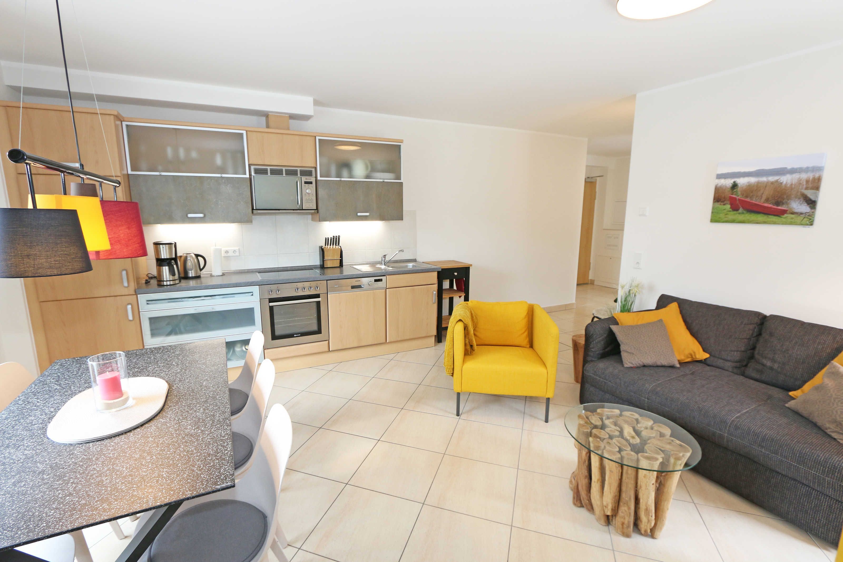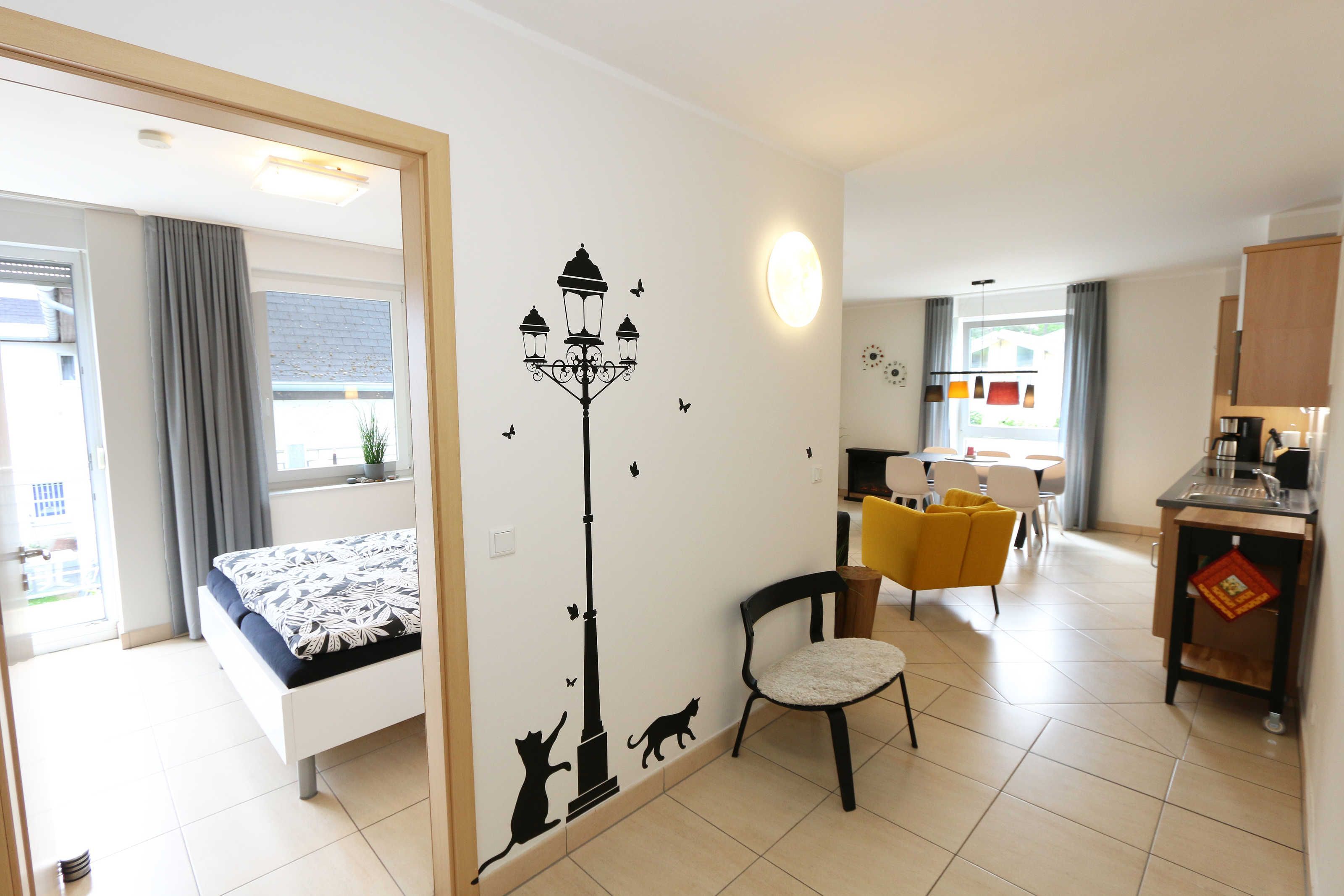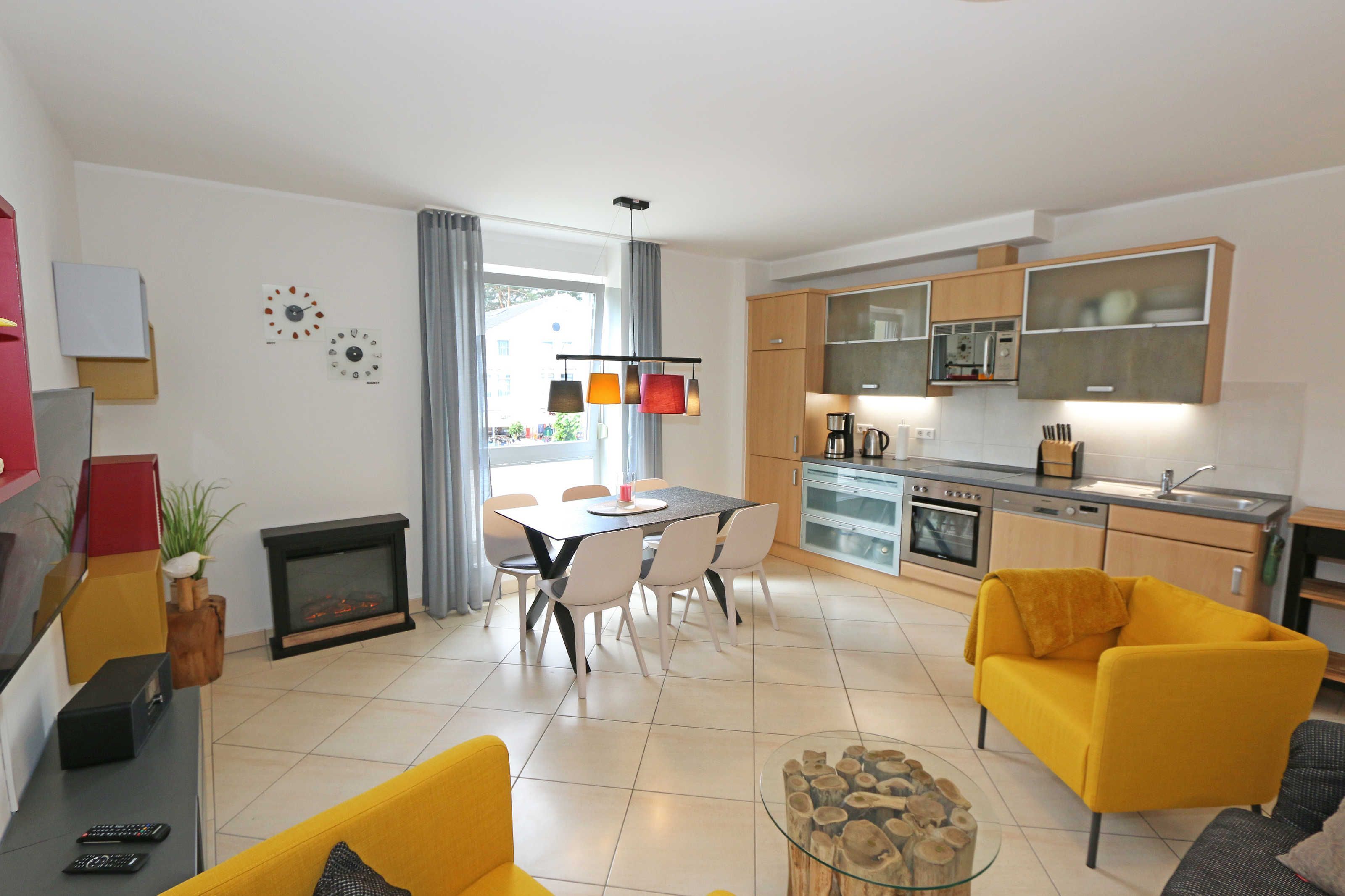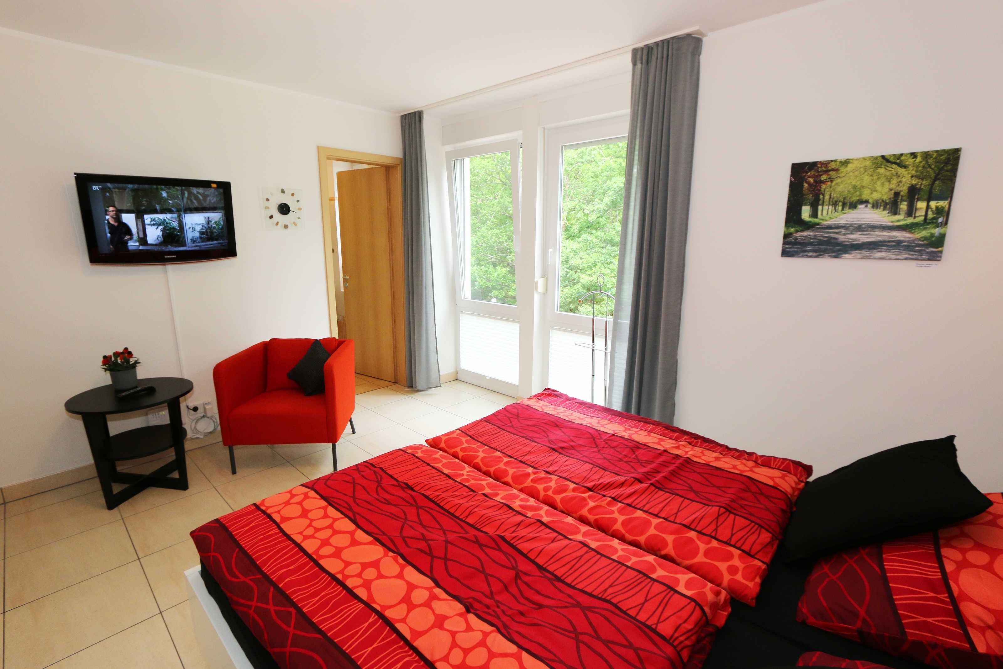 Sie wohnen auf ca. 70 m² in einer 3-Raum-Ferienwohnung für max. 2 bis 6 Personen, welche sich in der 1. Etage des Hauses befindet. Die Nichtraucherwohnung „ Auszeit“ verfügt über 2 Schlafzimmer, 2 Bäder, einen Wohn-Essbereich sowie einen kleinen Balkon. Durch die bodentiefen Fenster erwartet Sie eine sehr helle und freundliche Wohnung. Der Flur ist mit einer Garderobe, einem Ganzkörperspiegel und einer Sitzmöglichkeit versehen. Der Wohn-/Essbereich ist ausgestattet mit einer bequemen Couch (Aufbettungsmöglichkeit für 2 Personen 1,40m x 2,00m), zwei Sesseln, einem Couchtisch, TV Board mit Smart-TV mit Netflix-Abonnement, DAB CD-Radio mit Bluetooth und USB, WLAN-Zugang, diversen Regalen, eine Leselampe, einem LED-Kamin mit Heizfunktion sowie einem Esstisch mit 4 Stühlen. Die angrenzende Küchenzeile ist mit einer Kühlgefrierkombination, mit einem Ceranfeld, einem Backofen, einer Spülmaschine, einer Mikrowelle, einer Kaffeemaschine, einem Wasserkocher, einen Toaster ausgestattet aber auch Kleingeräte wie ein Rührmixer, ein Raclette Gerät und ein Eierkocher sind vorhanden. Das erste Schlafzimmer verfügt über ein Doppelbett (1,80 m x 2,00 m) mit verstellbaren Lattenrosten, Nachttischablagen, einem Kleiderschrank, eine Sitzmöglichkeit sowie ein Smart-TV. Von hier gelangen Sie direkt in eines der beiden Bäder welches mit einer Dusche, WC, Waschplatz, Handtuchtrockner und Fön ausgestattet ist. Das zweite Schlafzimmer verfügt über ein Doppelbett (1,60 m x 2,00 m), verstellbare Lattenroste, Nachttischablagen sowie einen Kleiderschrank. Von hier haben Sie zudem einen Zugang zu Ihrem bestuhlten Ost-Balkon. Beide Schlafzimmer verfügen über ein Insektenschutzgitter. Das 2. Bad erreichen Sie von Ihrem Flur, welches auch mit einer Dusche, einem WC, einem Waschplatz, einem Kosmetikspiegel, einem Handtuchtrockner sowie Fön ausgestattet ist. Die Ferienwohnung ist durchgehend gefliest und verfügt über eine Fußbodenheizung. Alle Fenster sind wahlweise über Vorhänge oder Außenrollos, zum Teil auch über Plissees abzudunkeln. Für unsere kleinen Gäste stehen zwei Hochstühle sowie ein Kinderreisebett (ohne Zusatzmatratze, ohne Bett Inlett) inklusive zur Verfügung. Reinigungsutensilien sowie ein Bügelbrett und ein Bügeleisen stehen Ihnen zusätzlich in der Wohnung zur Verfügung. Im Erdgeschoss des Hauses befindet sich ein gemeinschaftlicher Abstellraum, wo Sie eine Waschmaschine sowie einen Bollerwagen inklusive nutzen können. Auch Ihre mitgebrachten Fahrräder können hier je nach Verfügbarkeit eingestellt werden und E-Bikes geladen werden. Maximal sind 2 Hunde sind gegen eine Gebühr gern gesehene Gäste. Ein eigener PKW-Stellplatz (Nr.05) befindet sich hinter dem Haus. Die Erstausstattung eines Wäschepaketes (komplette Bettwäsche, 1 Duschhandtuch, 2 kleine Handtücher) können Sie bis 14 Tage vor Anreise gegen einen Aufpreis dazu buchen oder durch eigene ergänzen. Ab 2 gebuchten Paketen erhalten Sie einmalig 1 Geschirrhandtuch und 1 Duschvorleger hinzu.