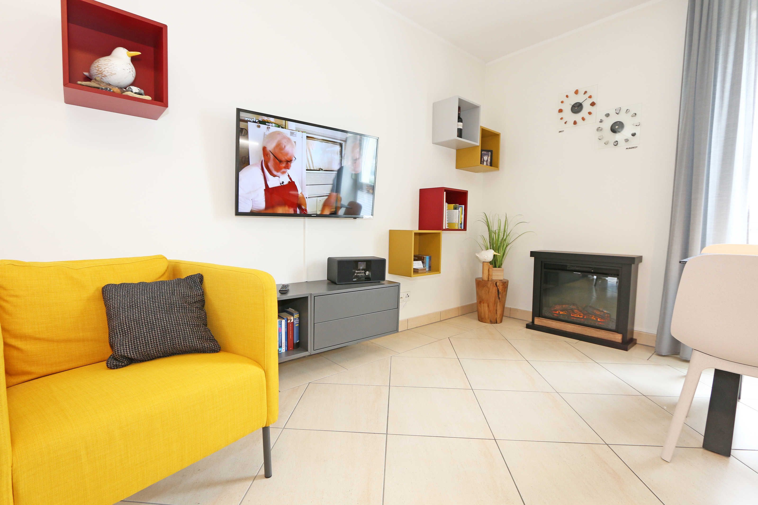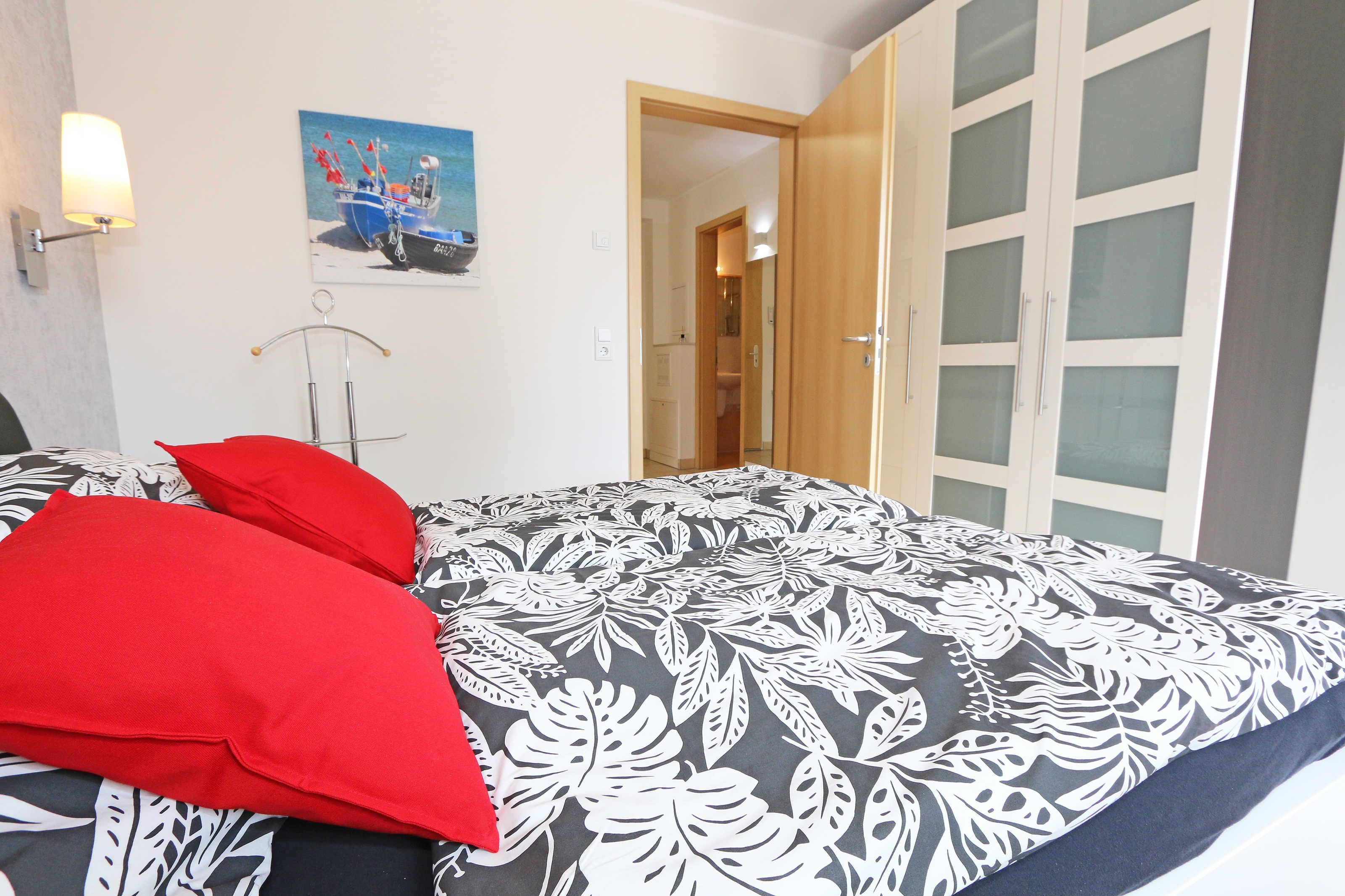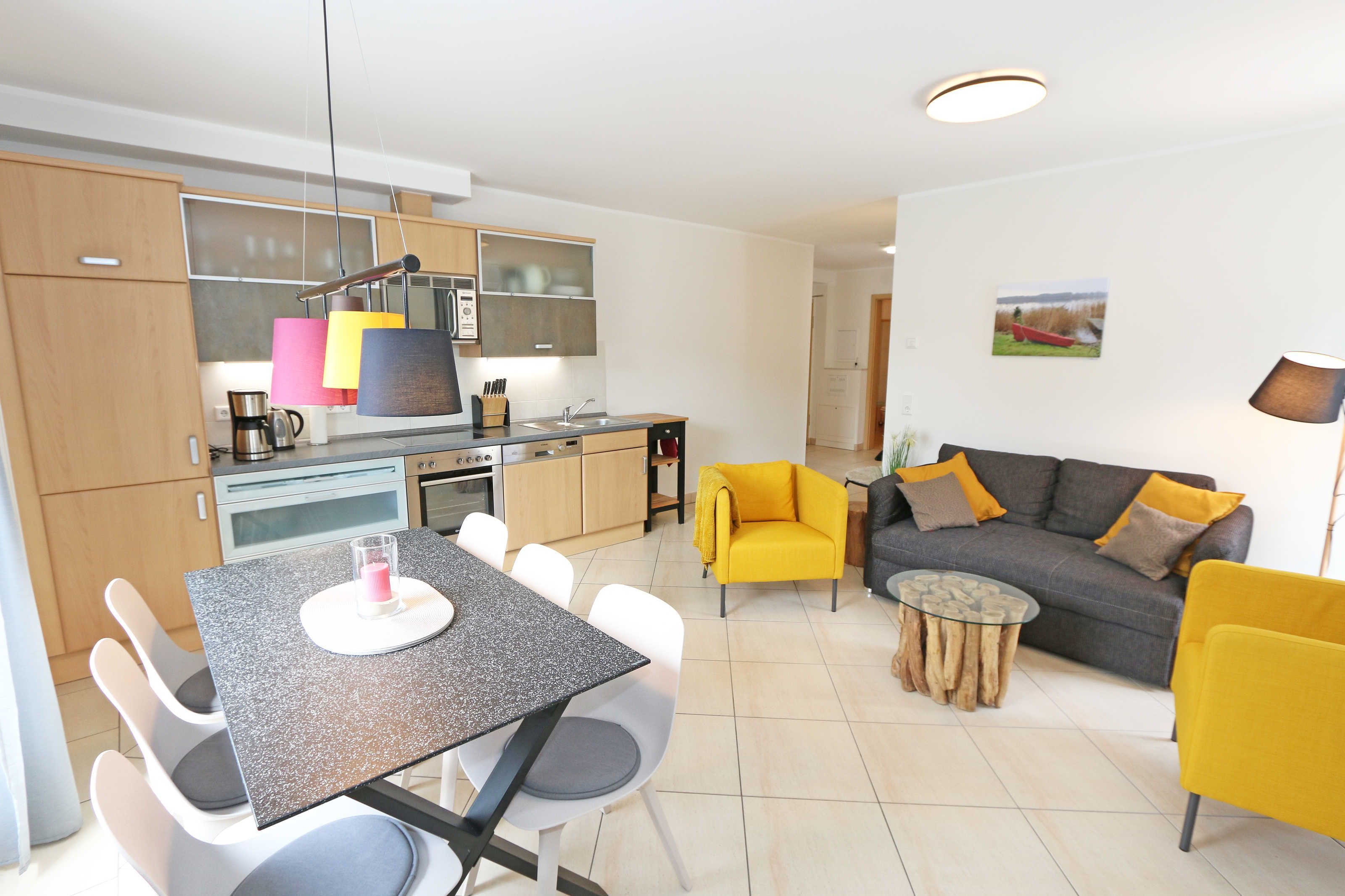 Sie wohnen auf ca. 70 m² in einer 3-Raum-Ferienwohnung für max. 2 bis 6 Personen, welche sich in der 1. Etage des Hauses befindet. Die Nichtraucherwohnung „ Auszeit“ verfügt über 2 Schlafzimmer, 2 Bäder, einen Wohn-Essbereich sowie einen kleinen Balkon. Durch die bodentiefen Fenster erwartet Sie eine sehr helle und freundliche Wohnung. Der Flur ist mit einer Garderobe, einem Ganzkörperspiegel und einer Sitzmöglichkeit versehen. Der Wohn-/Essbereich ist ausgestattet mit einer bequemen Couch (Aufbettungsmöglichkeit für 2 Personen 1,40m x 2,00m), zwei Sesseln, einem Couchtisch, TV Board mit Smart-TV mit Netflix-Abonnement, DAB CD-Radio mit Bluetooth und USB, WLAN-Zugang, diversen Regalen, eine Leselampe, einem LED-Kamin mit Heizfunktion sowie einem Esstisch mit 4 Stühlen. Die angrenzende Küchenzeile ist mit einer Kühlgefrierkombination, mit einem Ceranfeld, einem Backofen, einer Spülmaschine, einer Mikrowelle, einer Kaffeemaschine, einem Wasserkocher, einen Toaster ausgestattet aber auch Kleingeräte wie ein Rührmixer, ein Raclette Gerät und ein Eierkocher sind vorhanden. Das erste Schlafzimmer verfügt über ein Doppelbett (1,80 m x 2,00 m) mit verstellbaren Lattenrosten, Nachttischablagen, einem Kleiderschrank, eine Sitzmöglichkeit sowie ein Smart-TV. Von hier gelangen Sie direkt in eines der beiden Bäder welches mit einer Dusche, WC, Waschplatz, Handtuchtrockner und Fön ausgestattet ist. Das zweite Schlafzimmer verfügt über ein Doppelbett (1,60 m x 2,00 m), verstellbare Lattenroste, Nachttischablagen sowie einen Kleiderschrank. Von hier haben Sie zudem einen Zugang zu Ihrem bestuhlten Ost-Balkon. Beide Schlafzimmer verfügen über ein Insektenschutzgitter. Das 2. Bad erreichen Sie von Ihrem Flur, welches auch mit einer Dusche, einem WC, einem Waschplatz, einem Kosmetikspiegel, einem Handtuchtrockner sowie Fön ausgestattet ist. Die Ferienwohnung ist durchgehend gefliest und verfügt über eine Fußbodenheizung. Alle Fenster sind wahlweise über Vorhänge oder Außenrollos, zum Teil auch über Plissees abzudunkeln. Für unsere kleinen Gäste stehen zwei Hochstühle sowie ein Kinderreisebett (ohne Zusatzmatratze, ohne Bett Inlett) inklusive zur Verfügung. Reinigungsutensilien sowie ein Bügelbrett und ein Bügeleisen stehen Ihnen zusätzlich in der Wohnung zur Verfügung. Im Erdgeschoss des Hauses befindet sich ein gemeinschaftlicher Abstellraum, wo Sie eine Waschmaschine sowie einen Bollerwagen inklusive nutzen können. Auch Ihre mitgebrachten Fahrräder können hier je nach Verfügbarkeit eingestellt werden und E-Bikes geladen werden. Maximal sind 2 Hunde sind gegen eine Gebühr gern gesehene Gäste. Ein eigener PKW-Stellplatz (Nr.05) befindet sich hinter dem Haus. Die Erstausstattung eines Wäschepaketes (komplette Bettwäsche, 1 Duschhandtuch, 2 kleine Handtücher) können Sie bis 14 Tage vor Anreise gegen einen Aufpreis dazu buchen oder durch eigene ergänzen. Ab 2 gebuchten Paketen erhalten Sie einmalig 1 Geschirrhandtuch und 1 Duschvorleger hinzu.