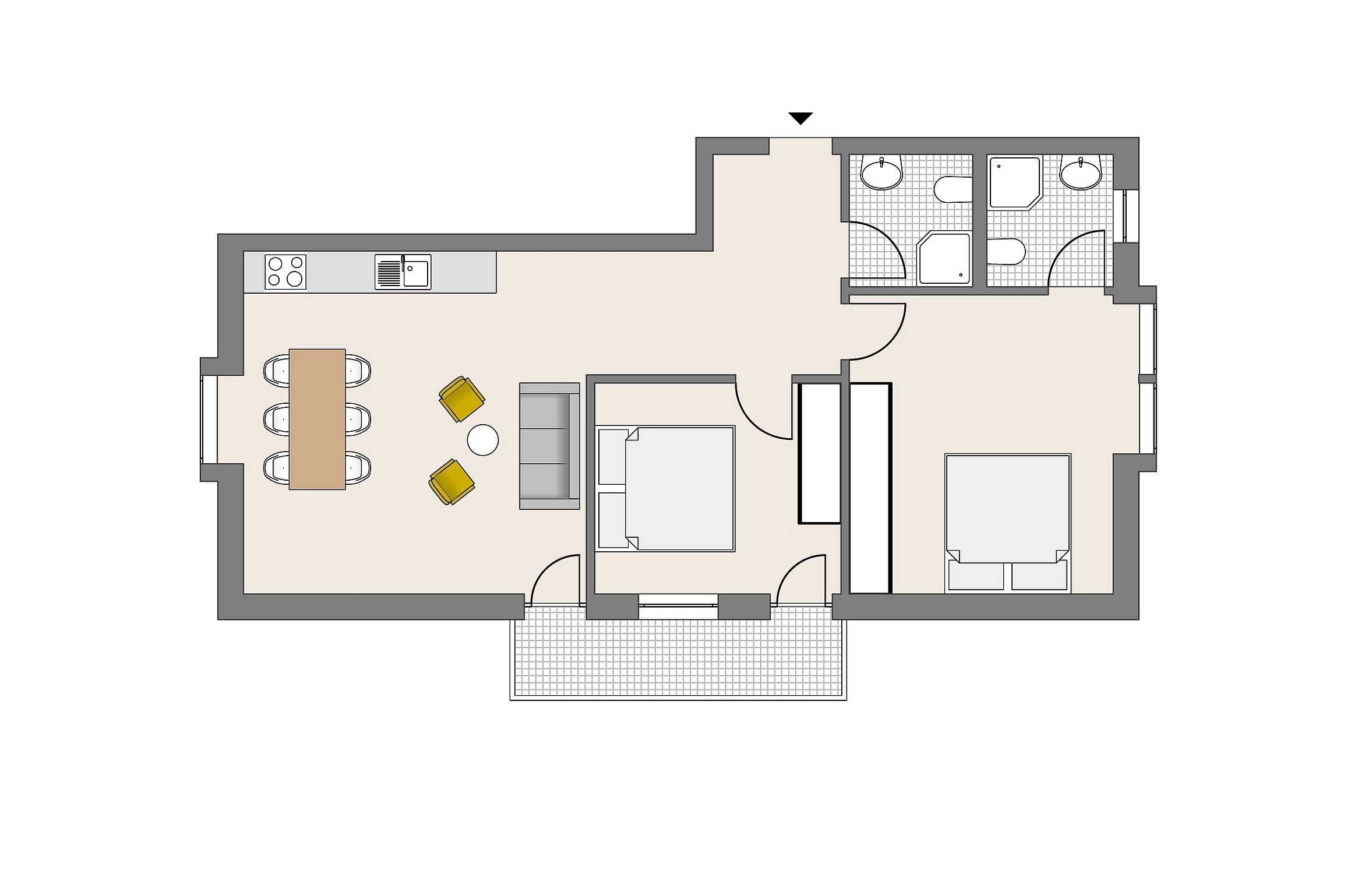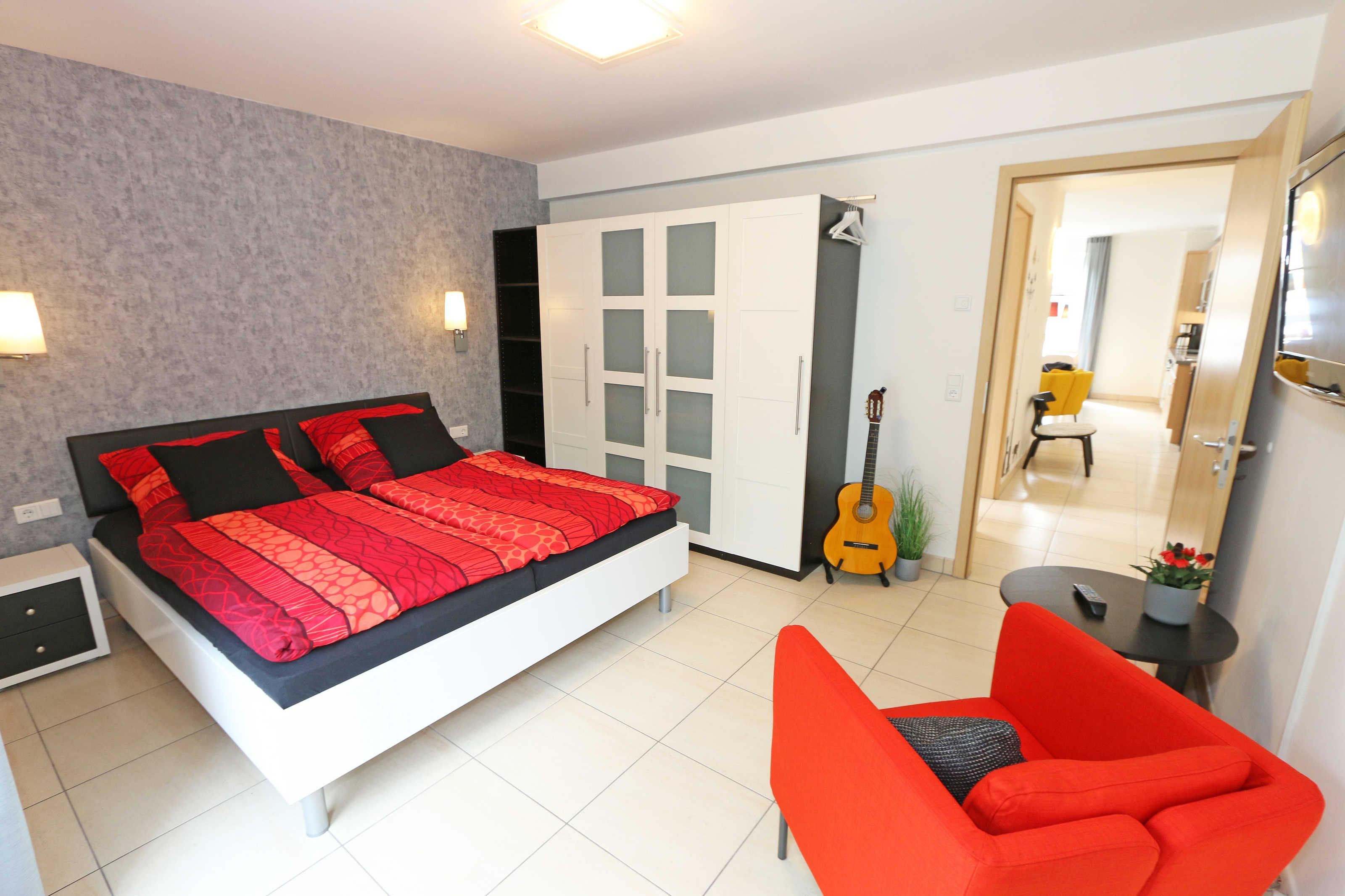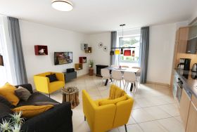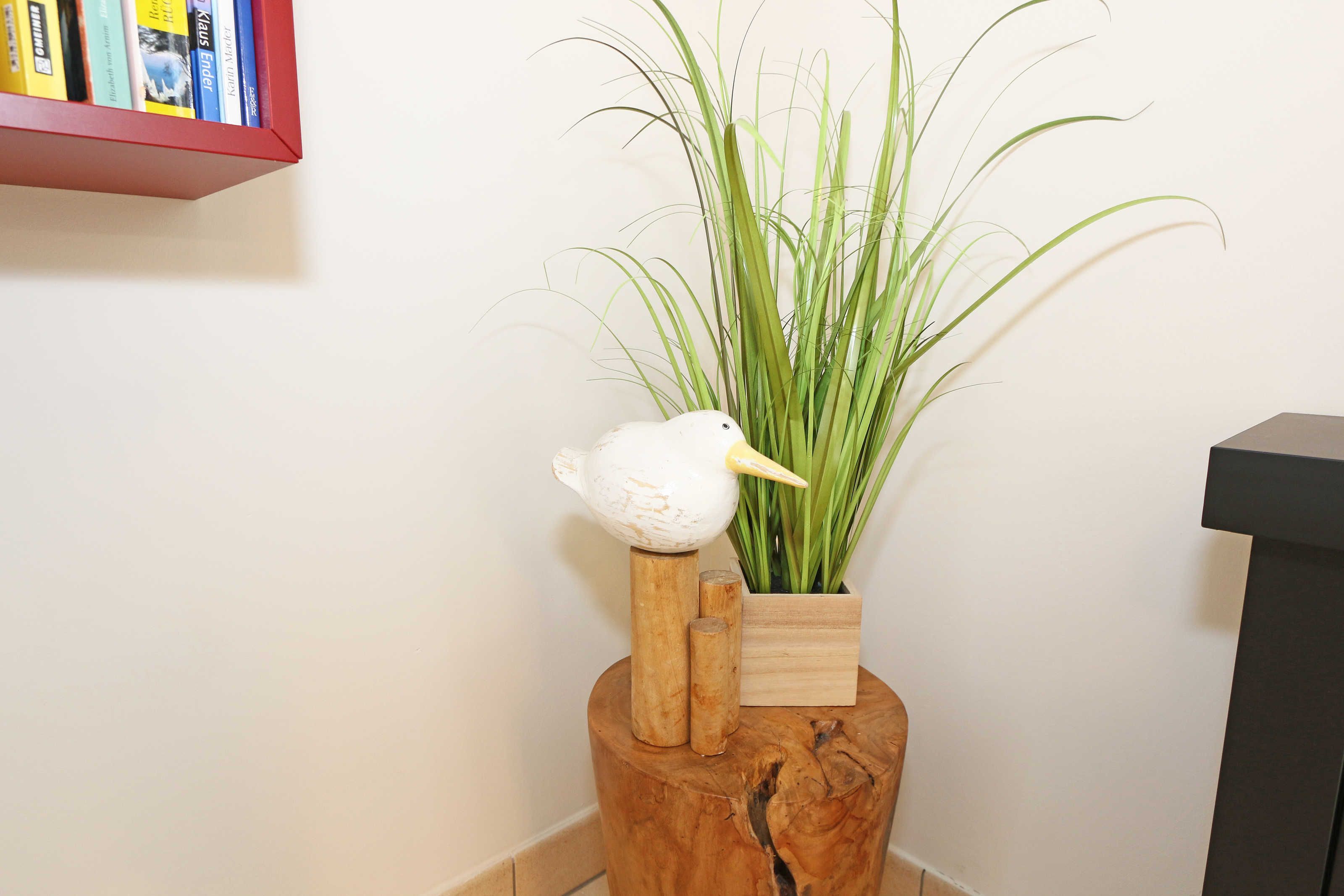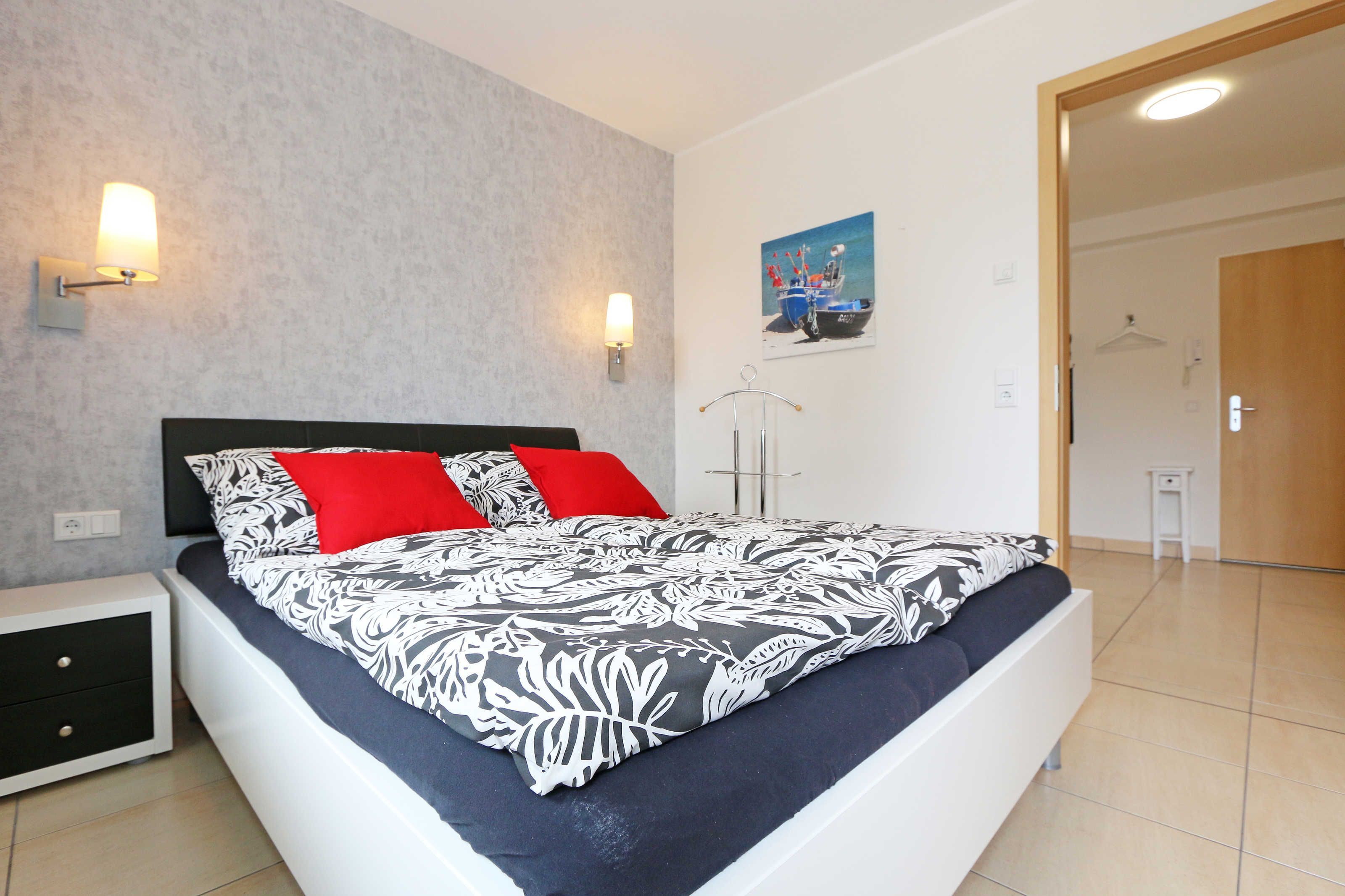 Sie wohnen auf ca. 70 m² in einer 3-Raum-Ferienwohnung für max. 2 bis 6 Personen, welche sich in der 1. Etage des Hauses befindet. Die Nichtraucherwohnung „ Auszeit“ verfügt über 2 Schlafzimmer, 2 Bäder, einen Wohn-Essbereich sowie einen kleinen Balkon. Durch die bodentiefen Fenster erwartet Sie eine sehr helle und freundliche Wohnung. Der Flur ist mit einer Garderobe, einem Ganzkörperspiegel und einer Sitzmöglichkeit versehen. Der Wohn-/Essbereich ist ausgestattet mit einer bequemen Couch (Aufbettungsmöglichkeit für 2 Personen 1,40m x 2,00m), zwei Sesseln, einem Couchtisch, TV Board mit Smart-TV mit Netflix-Abonnement, DAB CD-Radio mit Bluetooth und USB, WLAN-Zugang, diversen Regalen, eine Leselampe, einem LED-Kamin mit Heizfunktion sowie einem Esstisch mit 4 Stühlen. Die angrenzende Küchenzeile ist mit einer Kühlgefrierkombination, mit einem Ceranfeld, einem Backofen, einer Spülmaschine, einer Mikrowelle, einer Kaffeemaschine, einem Wasserkocher, einen Toaster ausgestattet aber auch Kleingeräte wie ein Rührmixer, ein Raclette Gerät und ein Eierkocher sind vorhanden. Das erste Schlafzimmer verfügt über ein Doppelbett (1,80 m x 2,00 m) mit verstellbaren Lattenrosten, Nachttischablagen, einem Kleiderschrank, eine Sitzmöglichkeit sowie ein Smart-TV. Von hier gelangen Sie direkt in eines der beiden Bäder welches mit einer Dusche, WC, Waschplatz, Handtuchtrockner und Fön ausgestattet ist. Das zweite Schlafzimmer verfügt über ein Doppelbett (1,60 m x 2,00 m), verstellbare Lattenroste, Nachttischablagen sowie einen Kleiderschrank. Von hier haben Sie zudem einen Zugang zu Ihrem bestuhlten Ost-Balkon. Beide Schlafzimmer verfügen über ein Insektenschutzgitter. Das 2. Bad erreichen Sie von Ihrem Flur, welches auch mit einer Dusche, einem WC, einem Waschplatz, einem Kosmetikspiegel, einem Handtuchtrockner sowie Fön ausgestattet ist. Die Ferienwohnung ist durchgehend gefliest und verfügt über eine Fußbodenheizung. Alle Fenster sind wahlweise über Vorhänge oder Außenrollos, zum Teil auch über Plissees abzudunkeln. Für unsere kleinen Gäste stehen zwei Hochstühle sowie ein Kinderreisebett (ohne Zusatzmatratze, ohne Bett Inlett) inklusive zur Verfügung. Reinigungsutensilien sowie ein Bügelbrett und ein Bügeleisen stehen Ihnen zusätzlich in der Wohnung zur Verfügung. Im Erdgeschoss des Hauses befindet sich ein gemeinschaftlicher Abstellraum, wo Sie eine Waschmaschine sowie einen Bollerwagen inklusive nutzen können. Auch Ihre mitgebrachten Fahrräder können hier je nach Verfügbarkeit eingestellt werden und E-Bikes geladen werden. Maximal sind 2 Hunde sind gegen eine Gebühr gern gesehene Gäste. Ein eigener PKW-Stellplatz (Nr.05) befindet sich hinter dem Haus. Die Erstausstattung eines Wäschepaketes (komplette Bettwäsche, 1 Duschhandtuch, 2 kleine Handtücher) können Sie bis 14 Tage vor Anreise gegen einen Aufpreis dazu buchen oder durch eigene ergänzen. Ab 2 gebuchten Paketen erhalten Sie einmalig 1 Geschirrhandtuch und 1 Duschvorleger hinzu.
