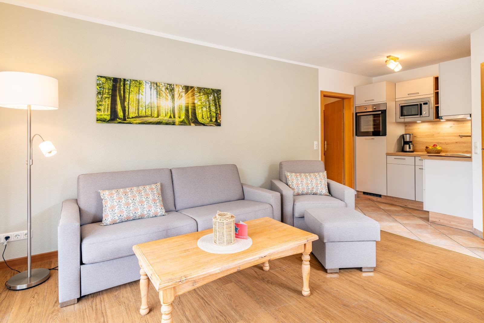 Die Ferienwohnungen am Maiglöckchenberg, Typ 1/2 sind gemütlich eingerichtet, 46m² groß und für bis zu 4 Personen ausgelegt (2 Pers. + 2 Aufbettungen). Sie besitzen ein Schlafzimmer, ein Wohnbereich mit einer offenen Küche und ein Badezimmer.