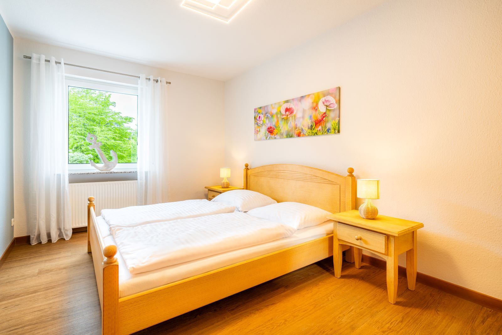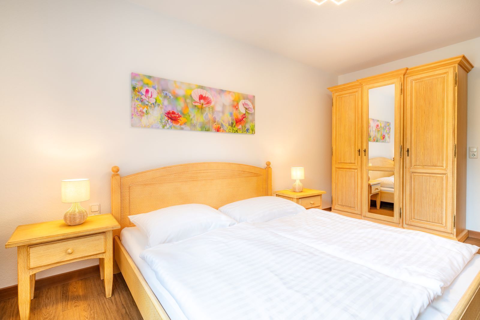 Die Ferienwohnung Klatschmohn präsentiert sich in einem modernen und einladenden Ambiente. Im geräumigen Schlafzimmer erwartet Sie ein gemütliches Doppelbett für erholsame Nächte. Zusätzlich bietet die komfortable Schlafcouch im Wohnbereich Platz für zwei weitere Gäste.
