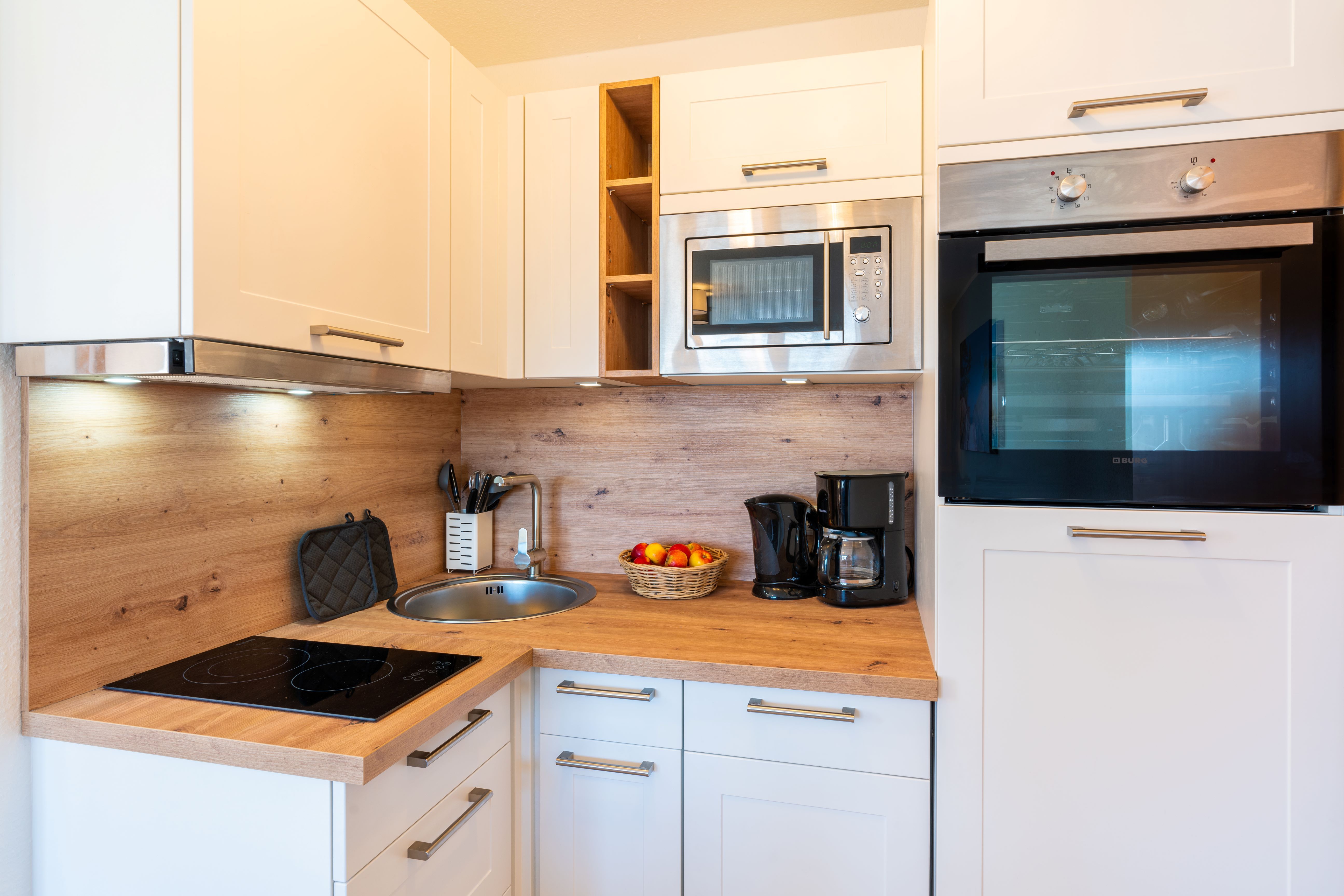 Die Wohnung verfügt über eine voll ausgestattete Küche, die mit modernen Geräten und allem, was Sie für die Zubereitung köstlicher Mahlzeiten benötigen, ausgestattet ist. Genießen Sie Ihre kulinarischen Kreationen am Esstisch oder lassen Sie den Tag auf dem Balkon bei einem Glas Wein ausklingen und genießen Sie die malerische Umgebung.