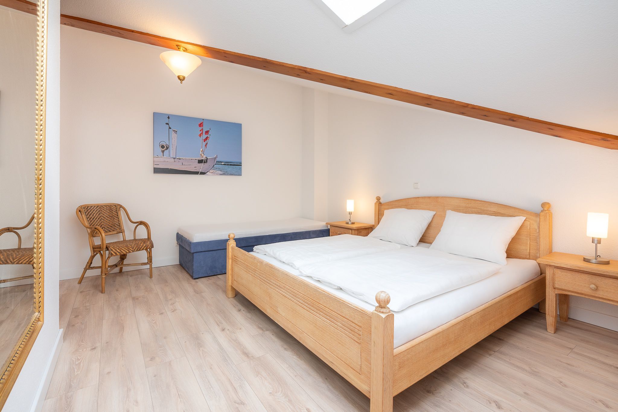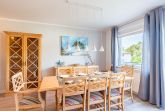 In dem Wohnraum mit Sitzecke und Fernseher können SIe gemütlich zusammensitzen und die Zeit in der Ferienwohnungenießen. Die komplett eigerichtete Küche ermöglicht Ihnen eine bequeme Selbstversorgung während Ihres Urlaubs. Das Bad auf der unteren Etage besitzt eine Dusche und ein WC. In der oberen Etage befinden sich die drei Schlafzimmer, zwei sind mit jeweils einem Doppelbett versehen und eins mit zwei Einzelbetten. Hier befindet sich auch ein zweites Bad. Auf dem möblierten Balkon können Sie Ihren Tag gemütlich ein und ausklingen lassen. WLAN ist vorhanden. Waschmaschine und Trockner können Sie gegen Entgelt verwenden. Ein Parkplatz vor dem Haus wird Ihnen natürlich zur Verfügung gestellt. Zum feinsandigen, weißen Badestrand sind es nur ca. 3-4 Gehminuten.