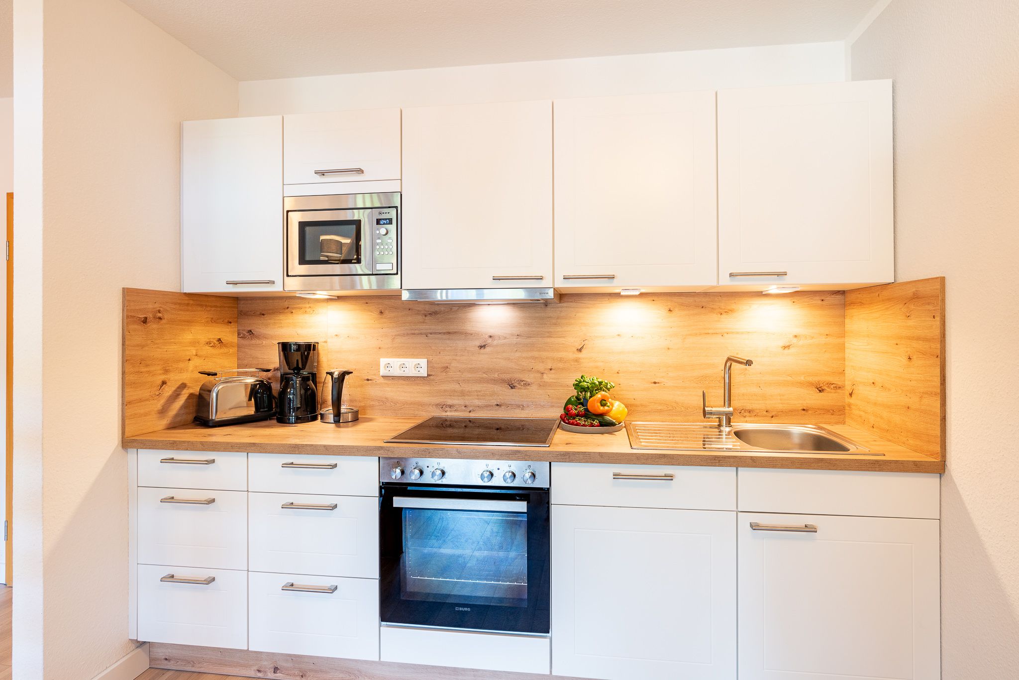 Die Wohnung erstreckt sich über 2 Etagen und ist für bis zu 8 Personen geeignet (6Pers. + 2Aufbettungen). In der unteren Etage sind ein Wohnraum mit komplett eigerichteter Küche und ein Bad. In der oberen Etage befinden sich drei Schlafzimmer und ein weiteres Badezimmer.