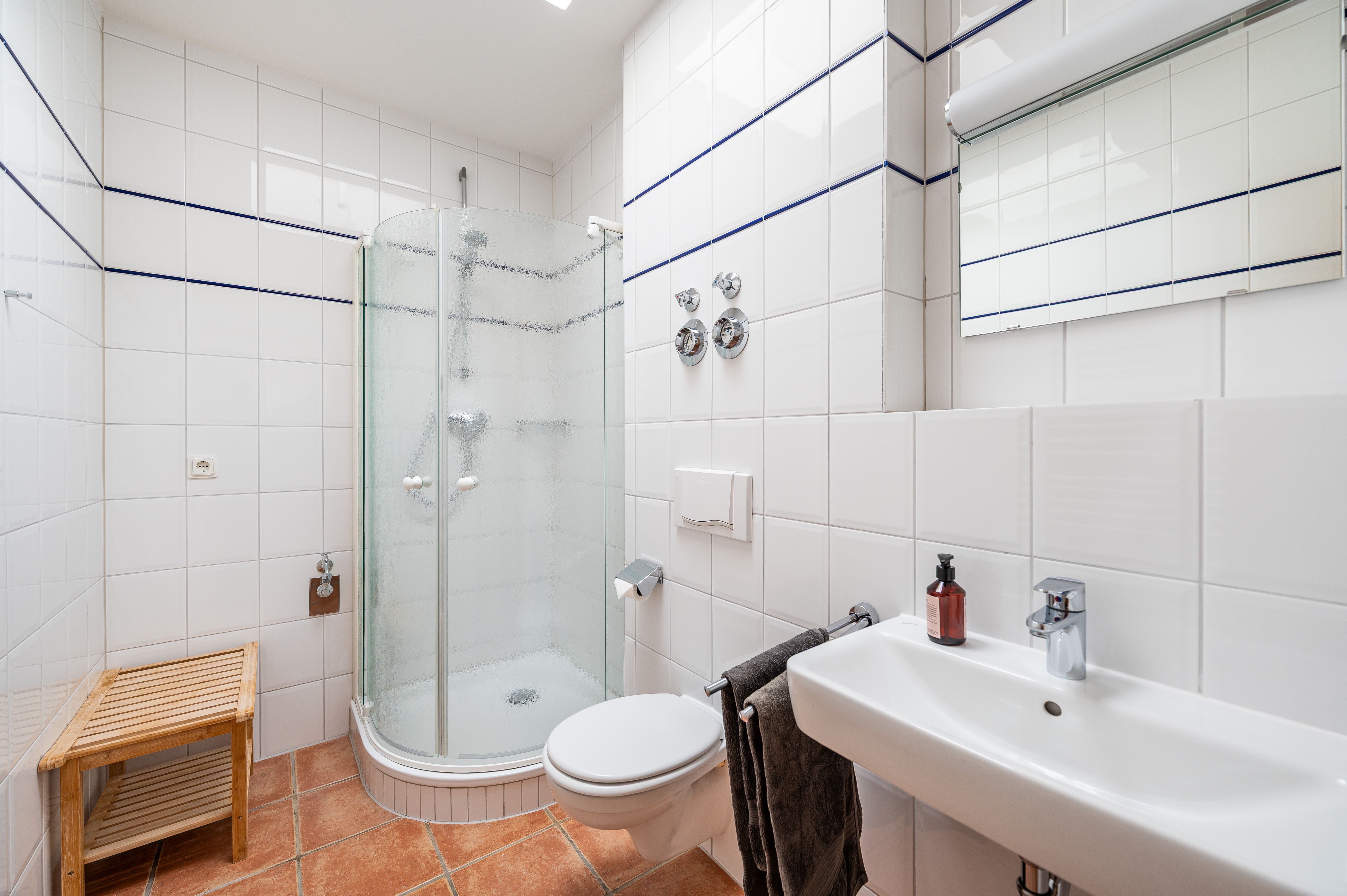 • Bad : Dusche, Waschbecken, Toilette, Schrank