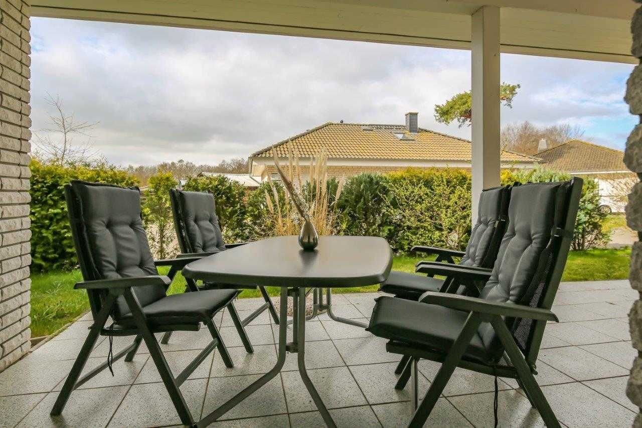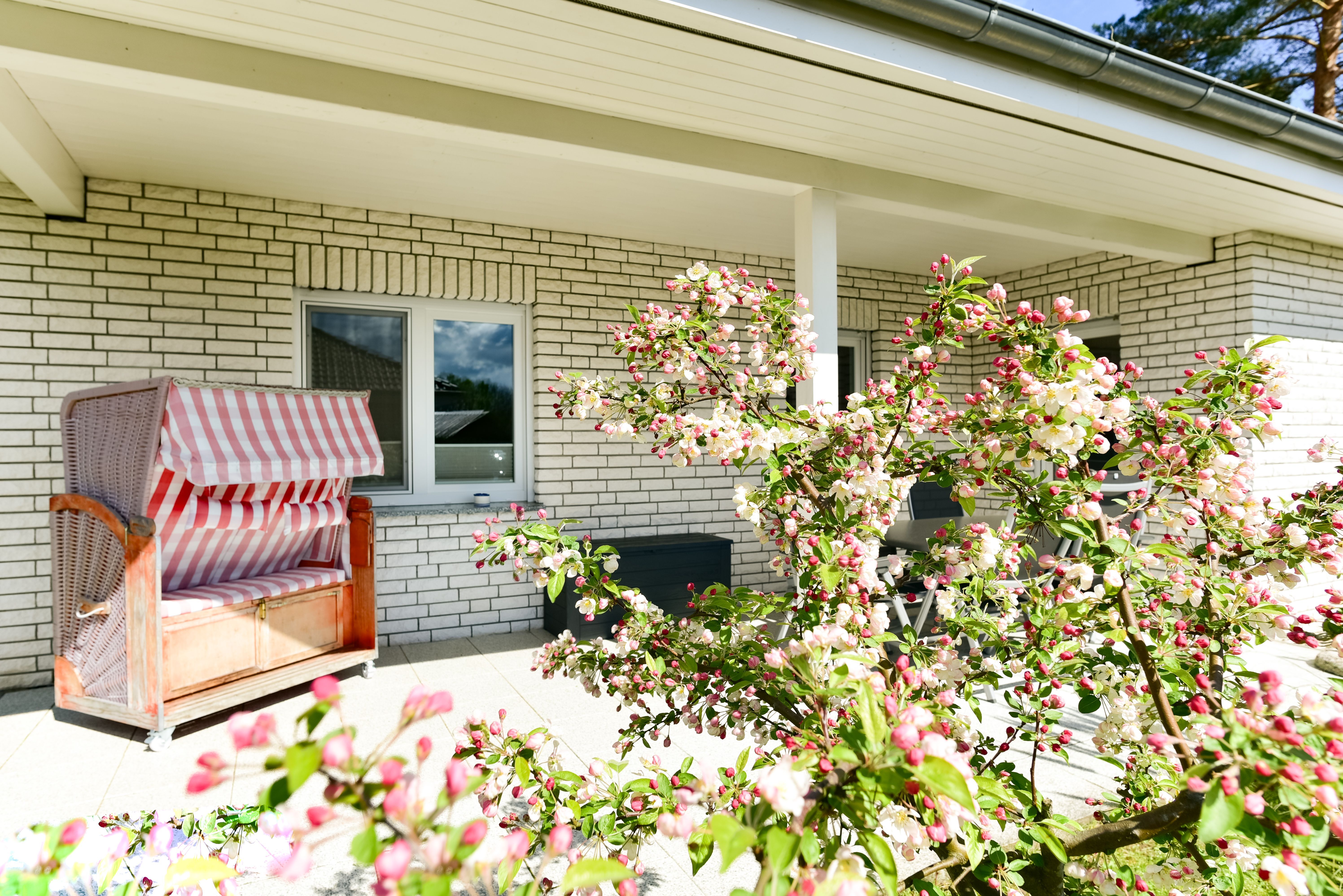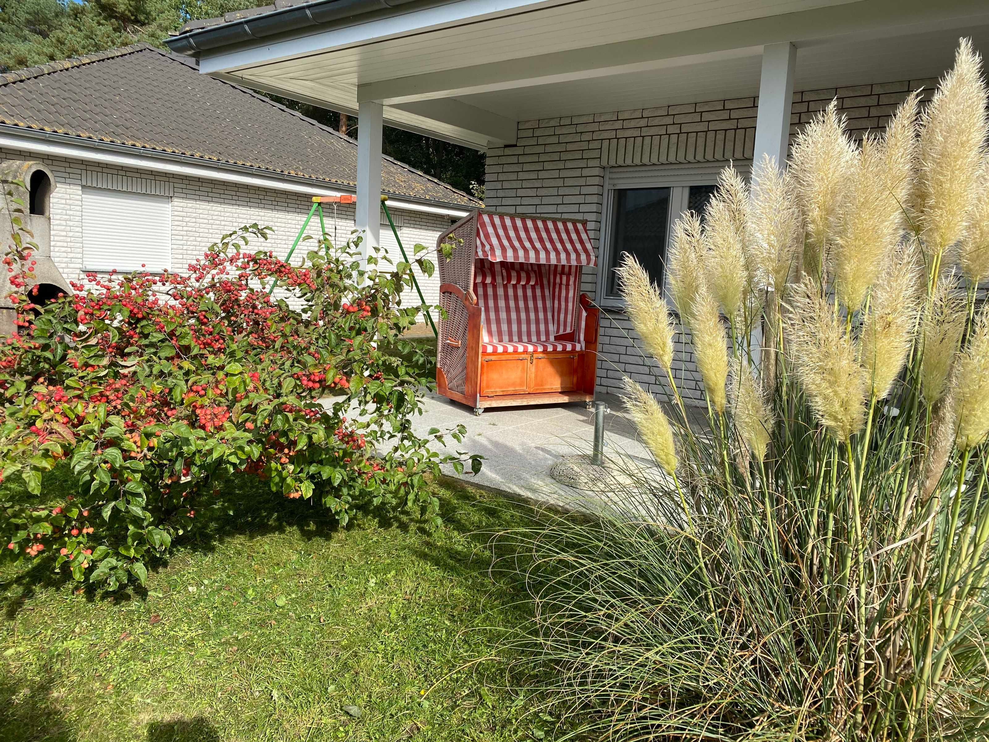 Die großzügige und überdachte Terrasse mit Strandkorb und der Grillkamin im Garten garantieren gesellige Abende im Freien.