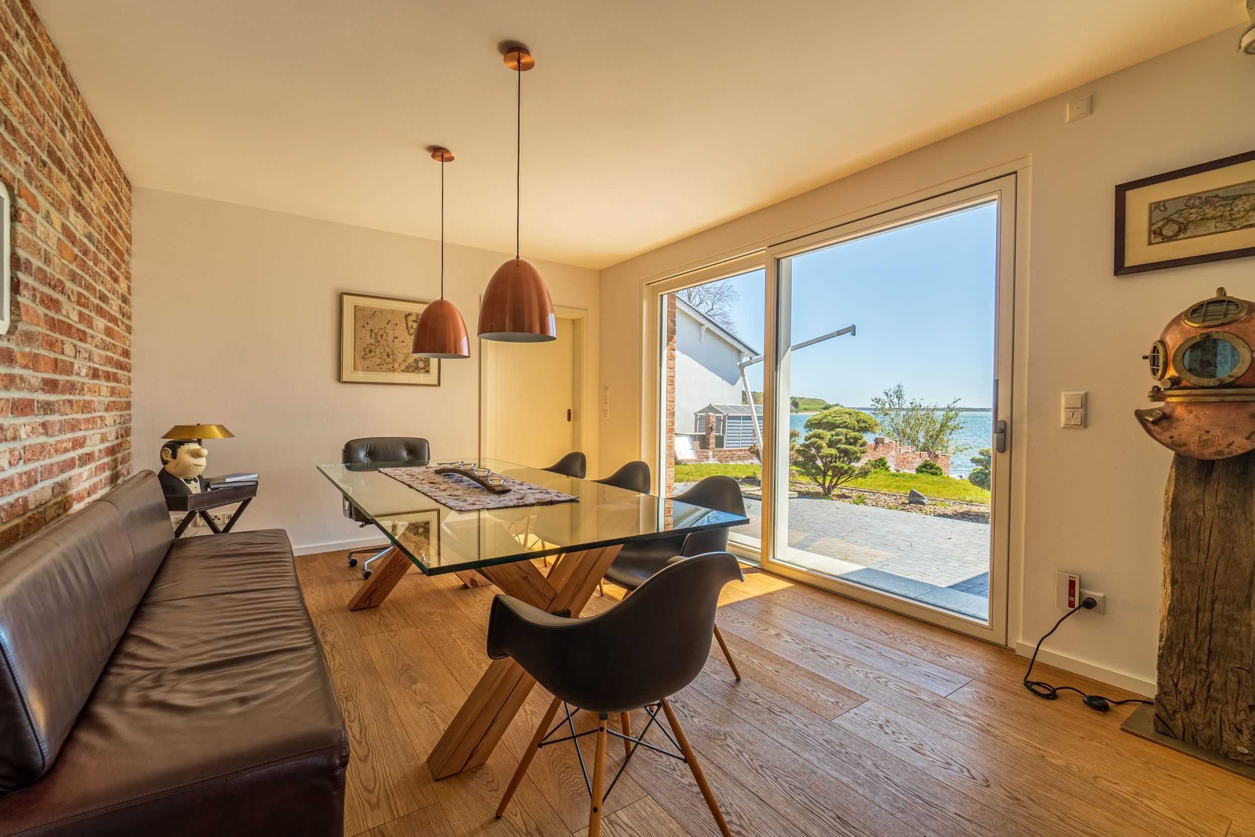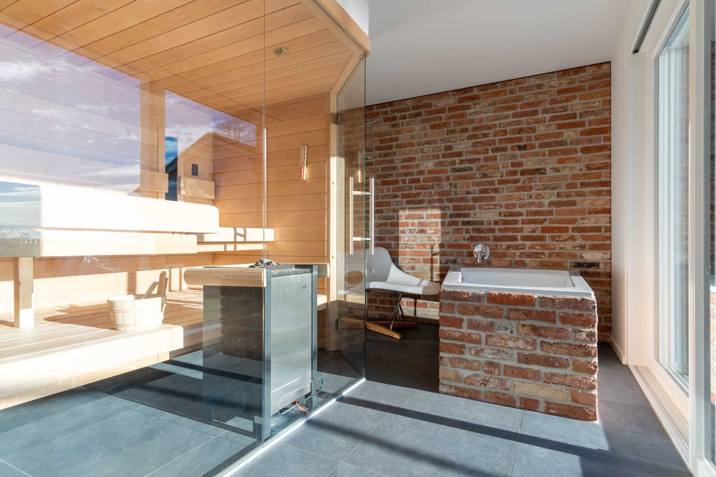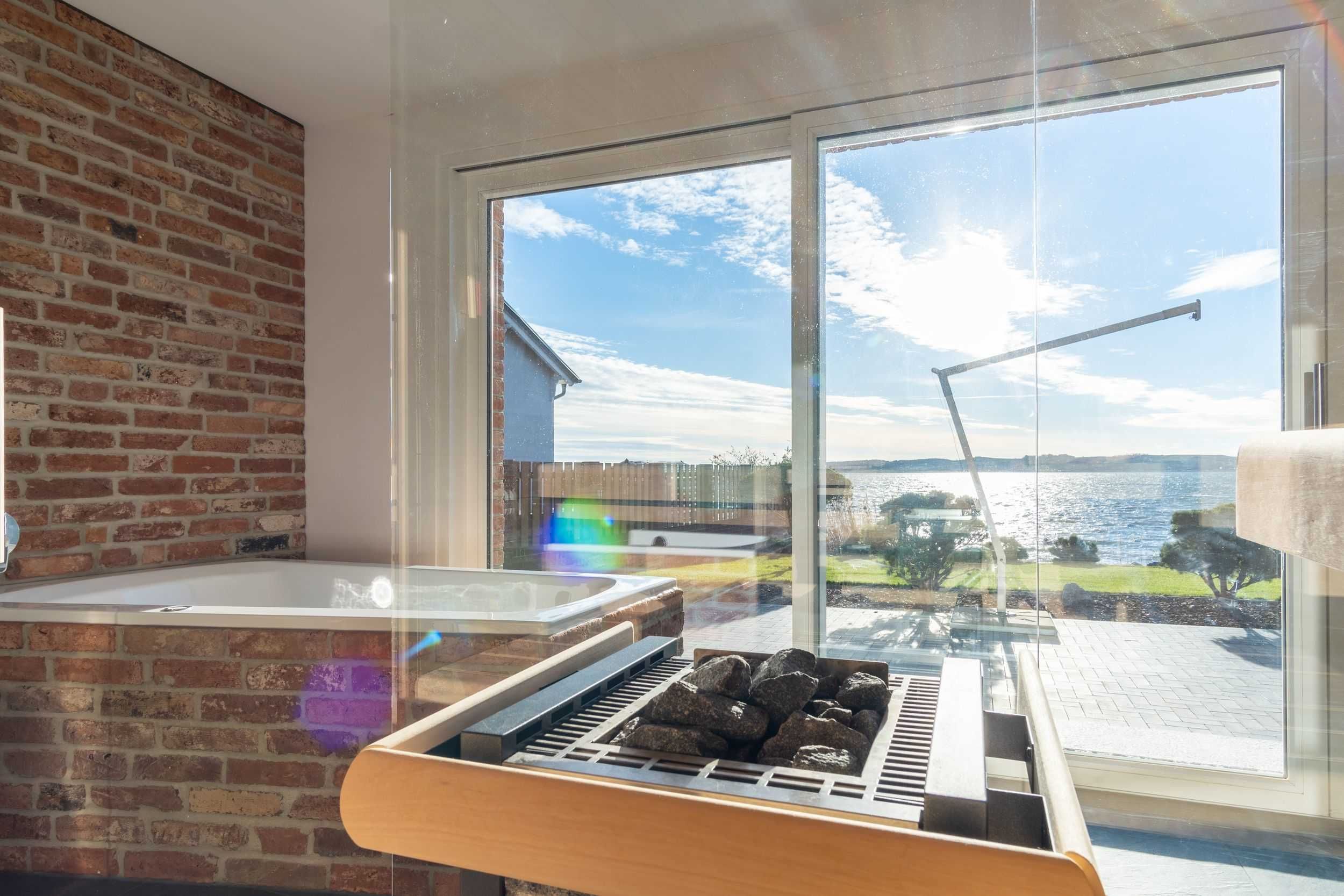 Hinter dem Essbereich befindet sich eines der Highlights, der Wellnessbereich. Genießen Sie vom Whirlpool den Blick auf den Rügischen Bodden (ab Herbst auch in Ihrer Sauna). Im Wellnessbereich steht Ihnen eine Dusche und ein WC zur Verfügung.