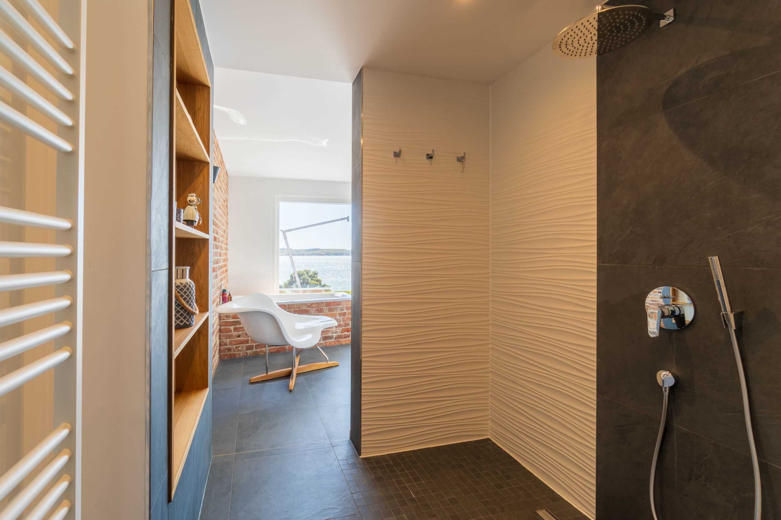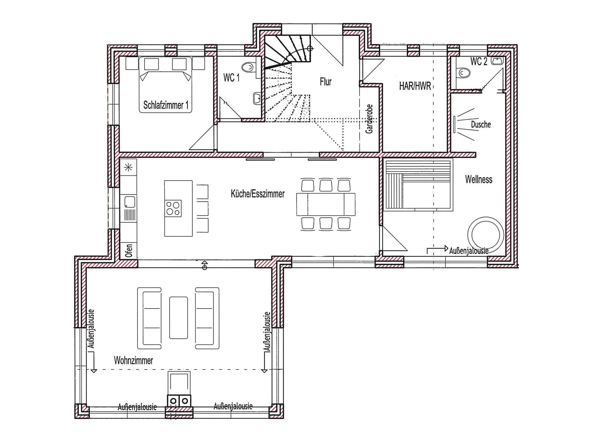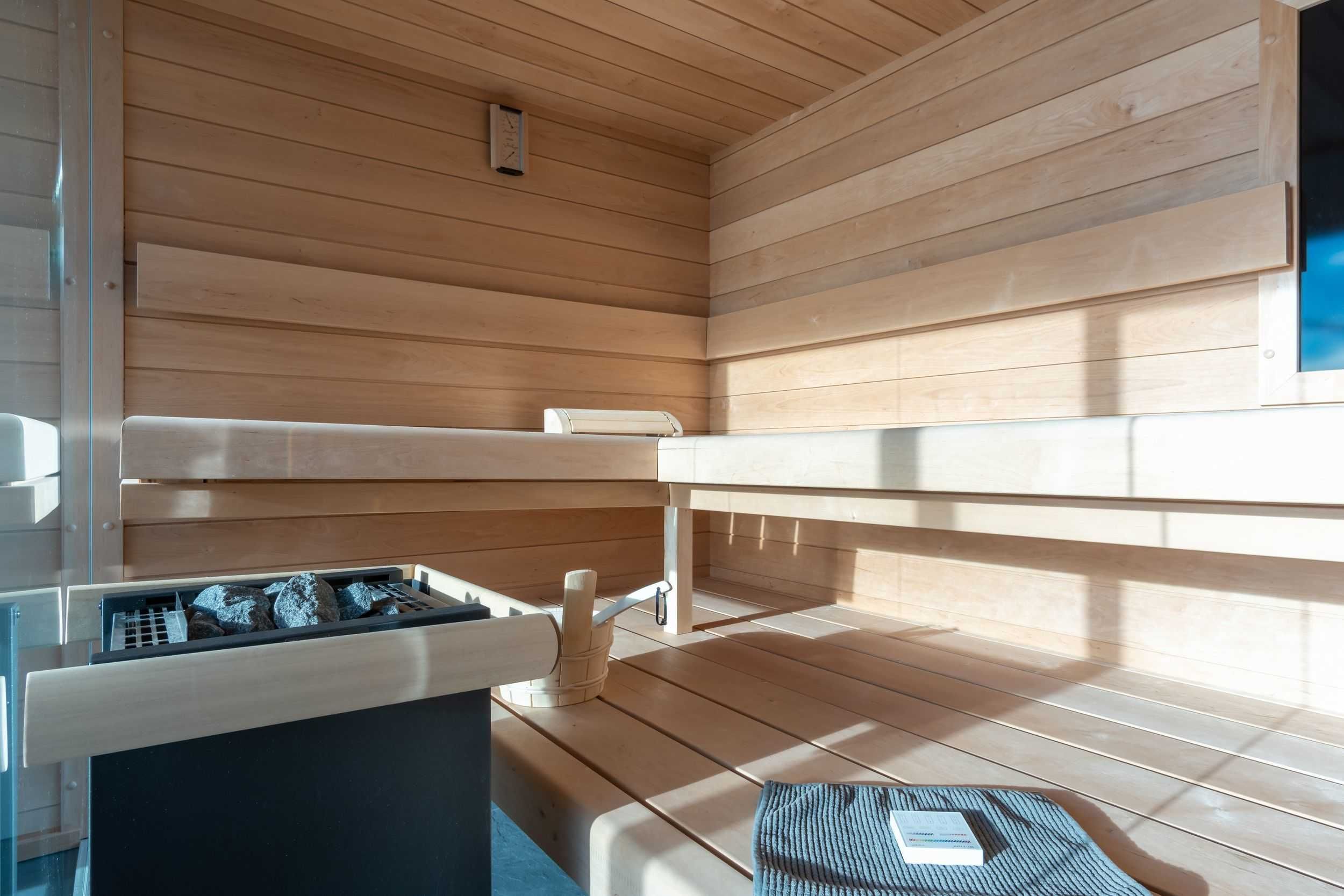 Hinter dem Essbereich befindet sich eines der Highlights, der Wellnessbereich. Genießen Sie vom Whirlpool den Blick auf den Rügischen Bodden (ab Herbst auch in Ihrer Sauna). Im Wellnessbereich steht Ihnen eine Dusche und ein WC zur Verfügung.