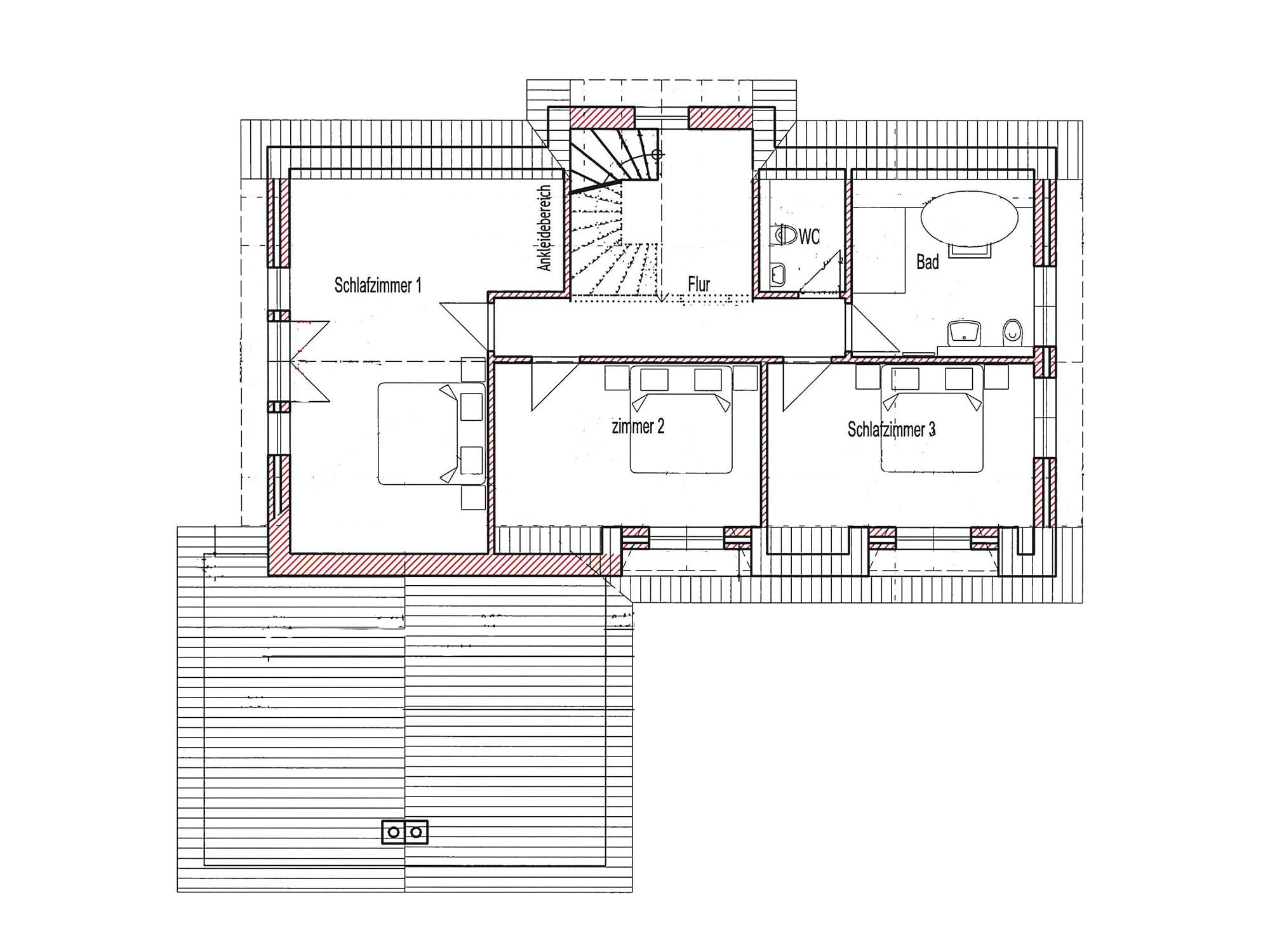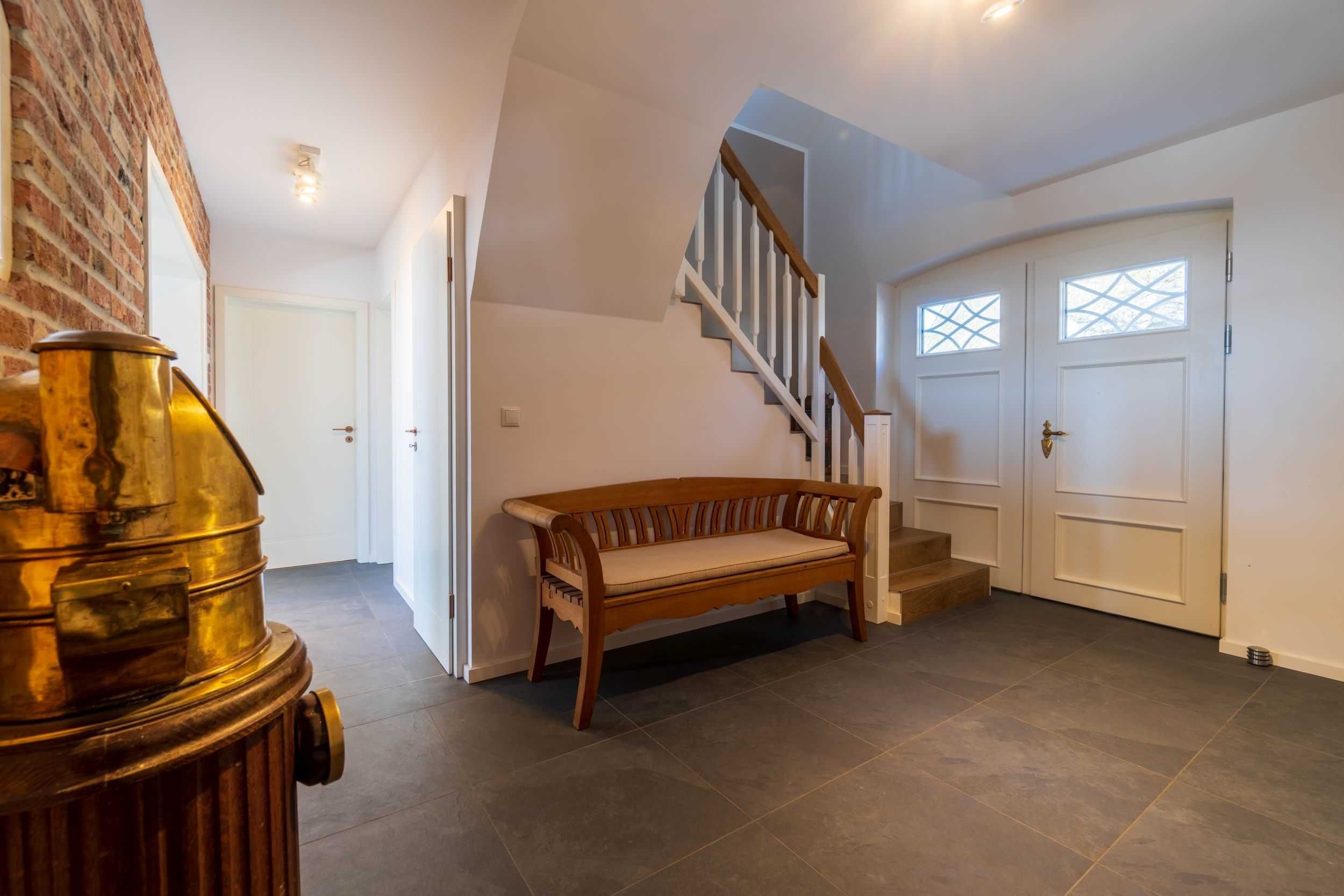 Das große geschmackvoll gestaltete Bad ist mit einer bodentiefen Dusche sowie einer Eckbadewanne ausgestattet. Außerdem befindet sich auch im Obergeschoß ein Gäste WC.