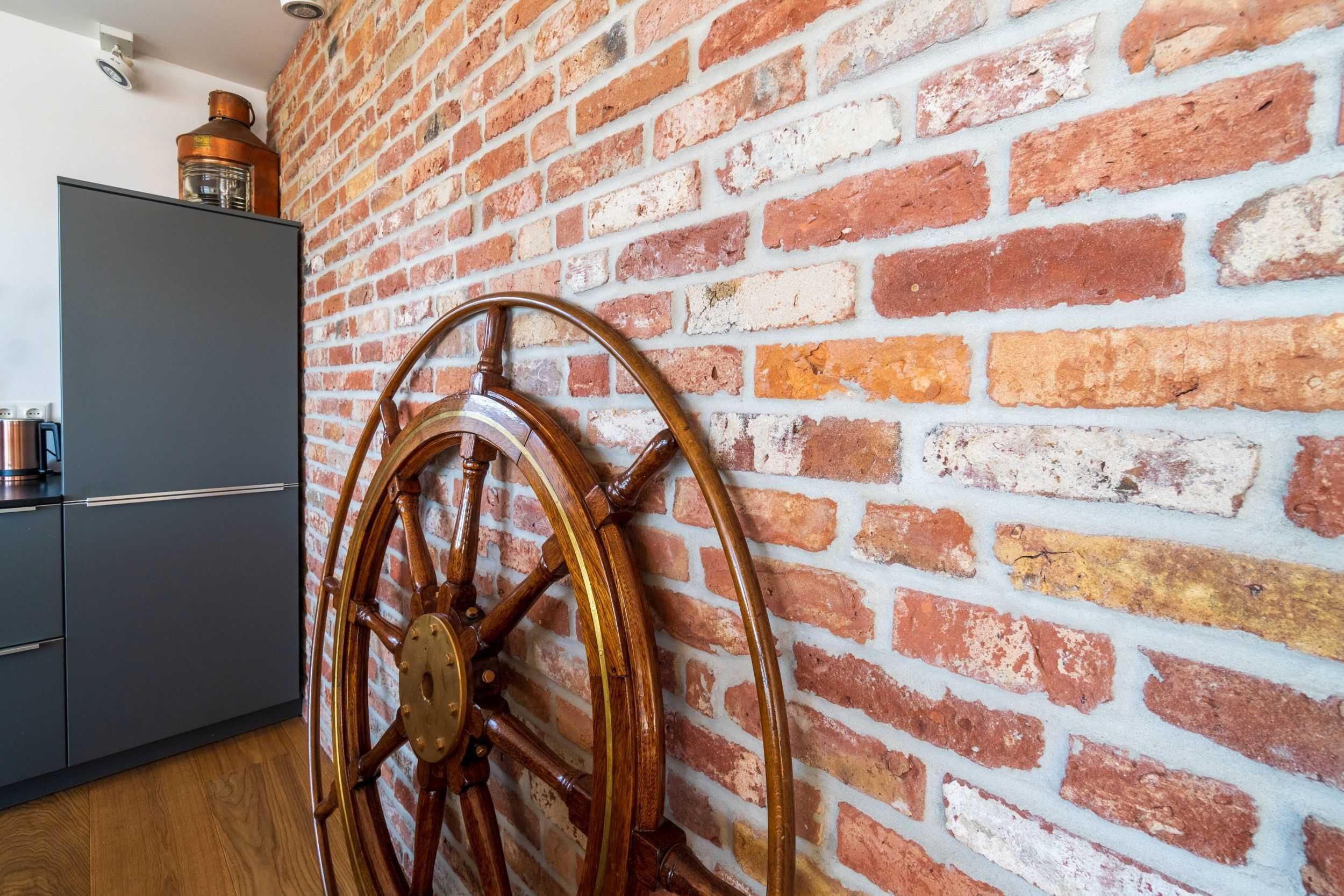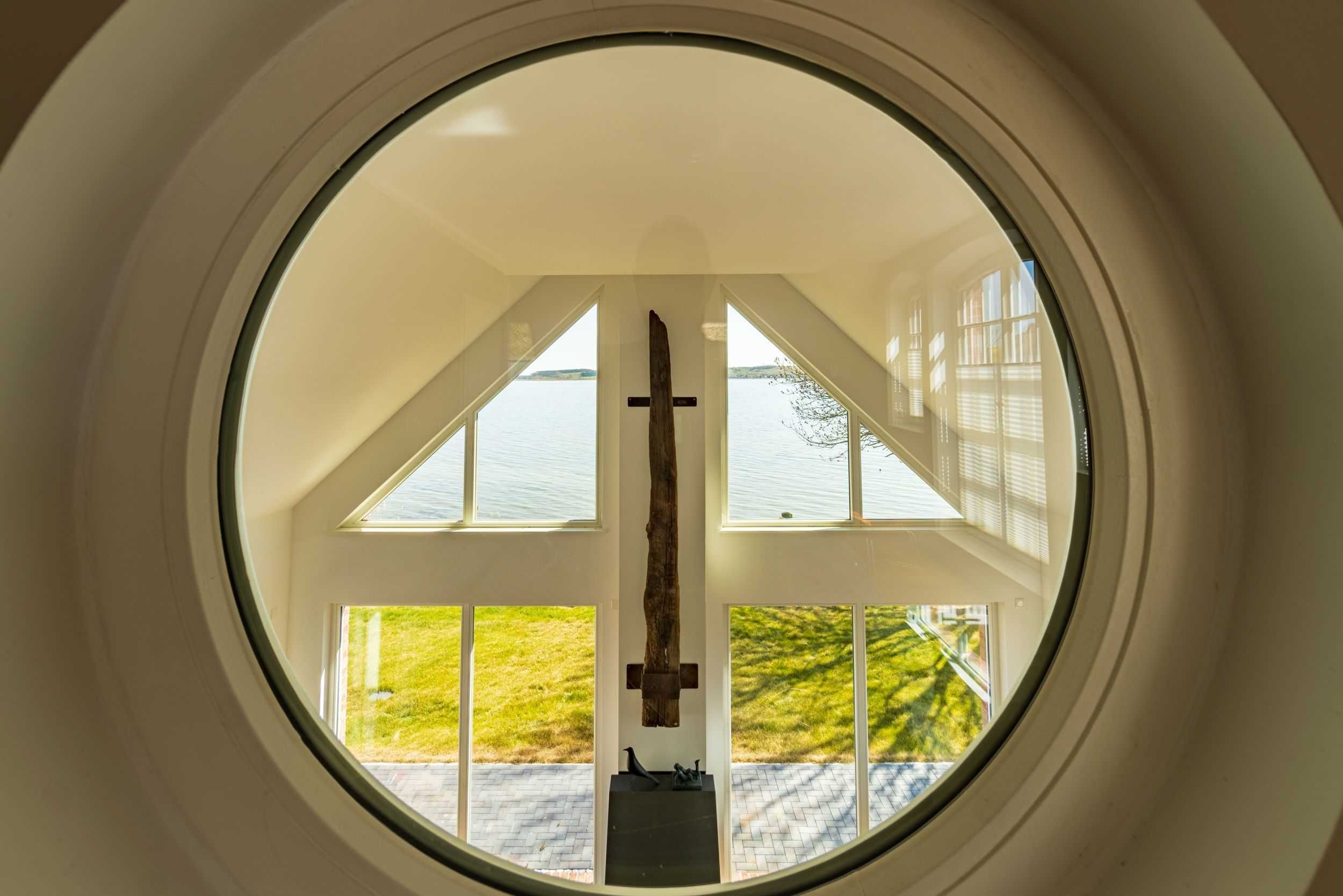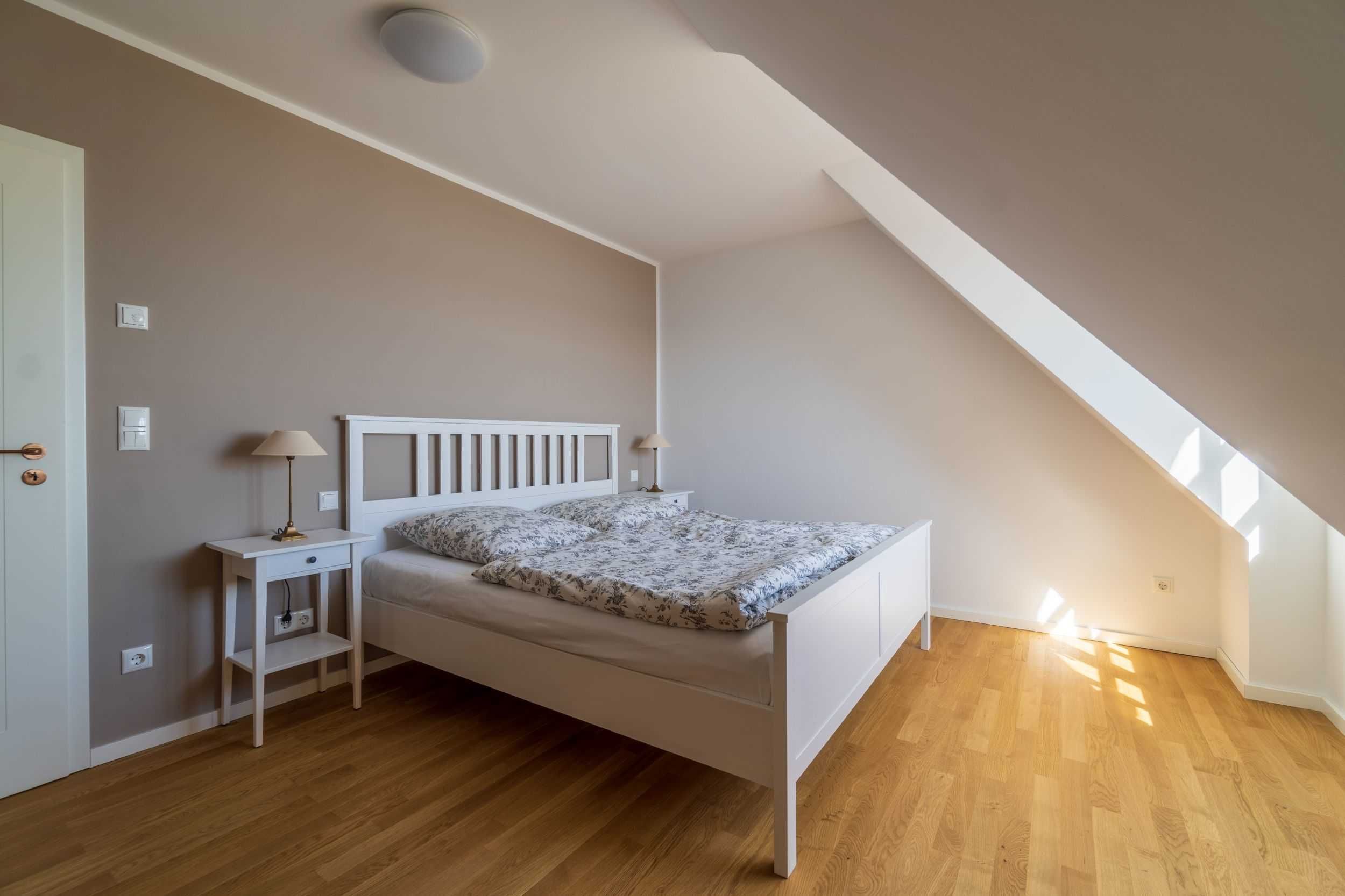 Über den geräumigen Eingangsbereich kommen Sie in das Obergeschoß mit 3 Schlafzimmern, die jeweils mit einem Doppelbett sowie Schrank und TV ausgestattet sind. Im größten der 3 Schlafzimmer haben Sie einen herrlichen Blick durch ein Bullauge auf den Wohnbereich und den Bodden.