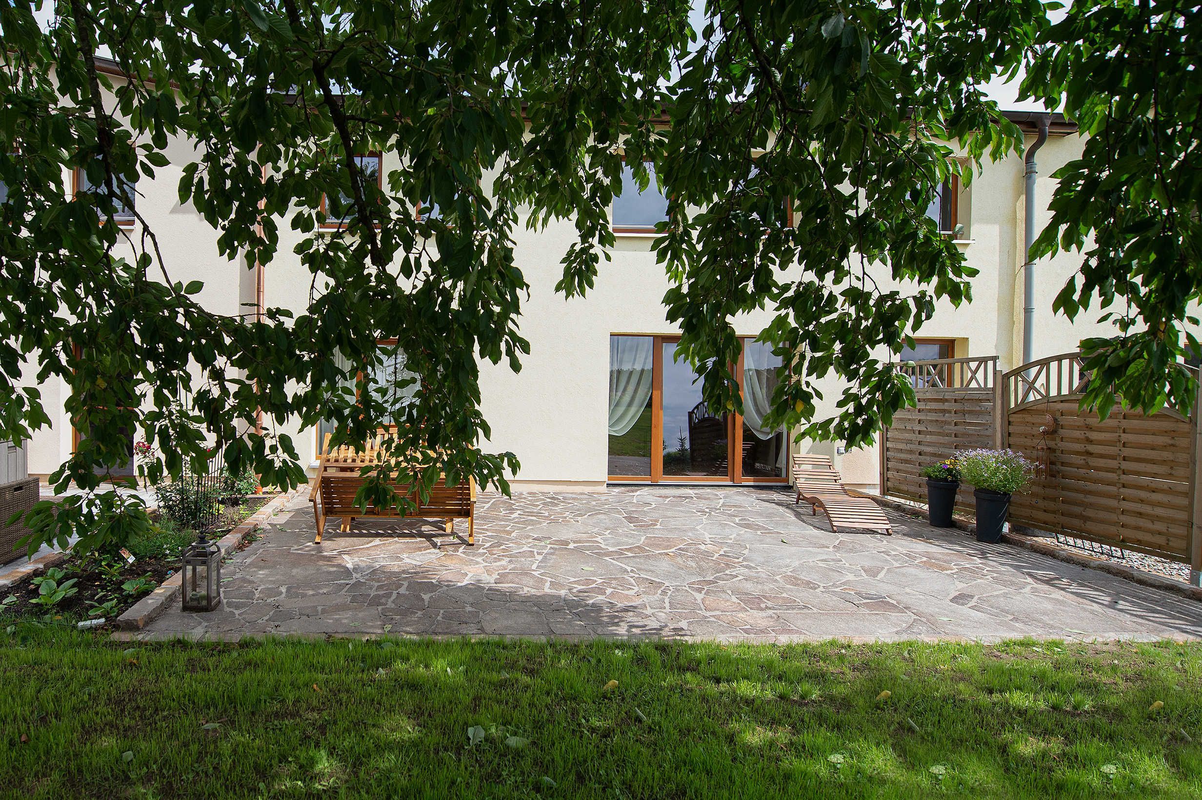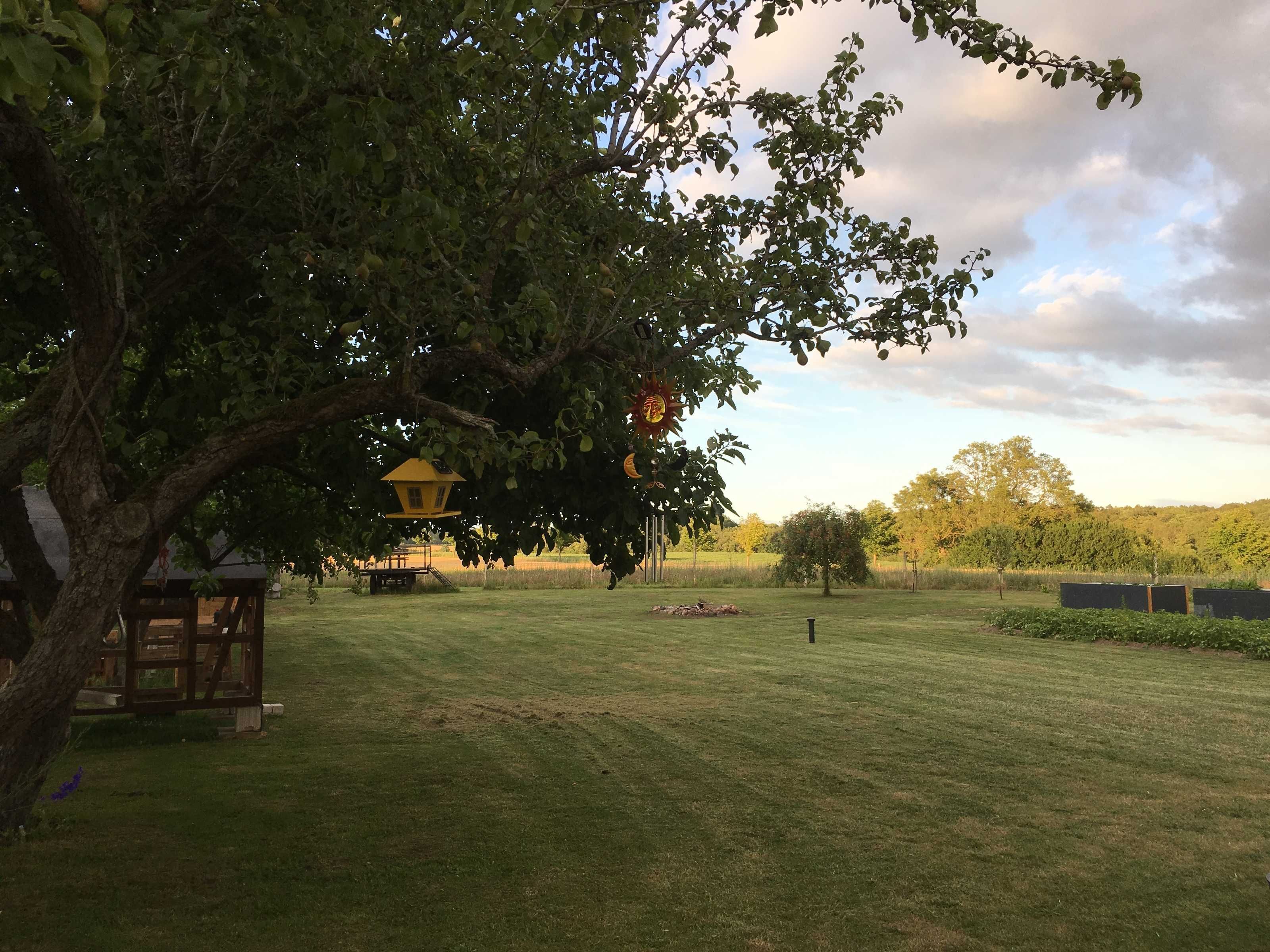 Im weitläufigen Garten des Landhauses mit alten Obstbäumen, separaten Sitzecken mit Grill und Kinder-Gartenhaus für Kinder findet sich genug Raum für Entspannung und Spiel.