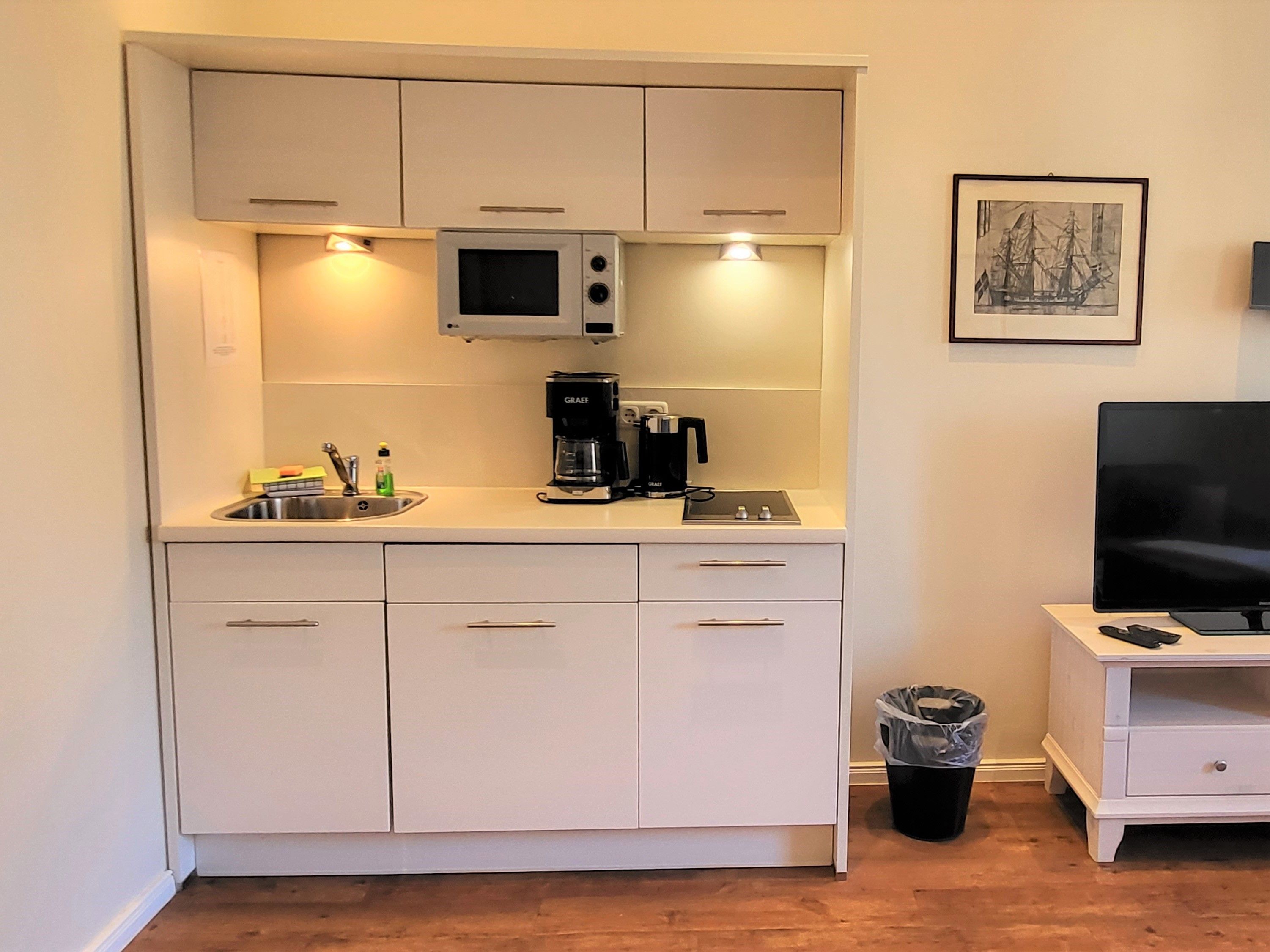 • Pantry-Küche (mit Mikrowelle, Wasserkocher, 2 Kochfelder, Kaffeemaschine, Kühlschrank)