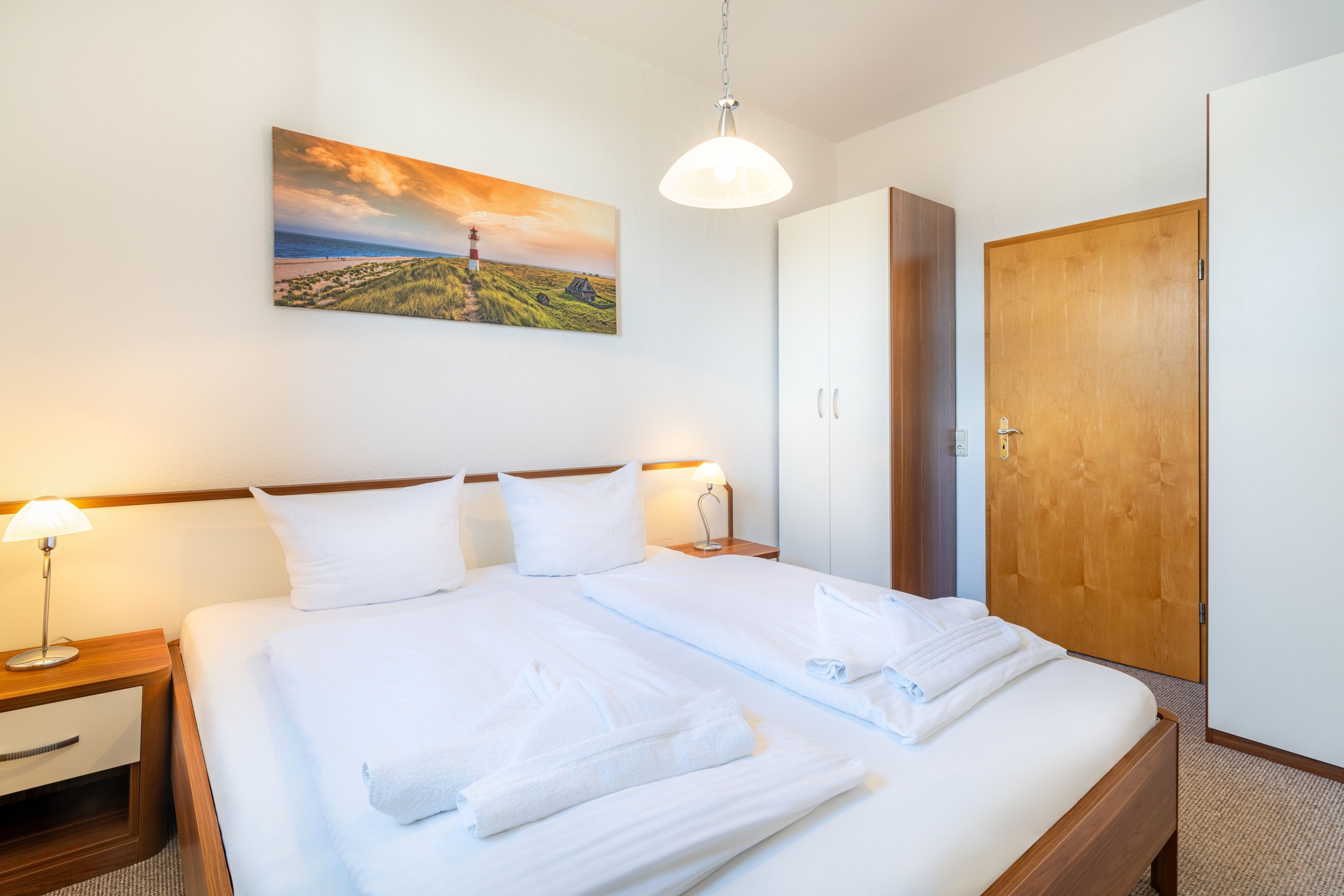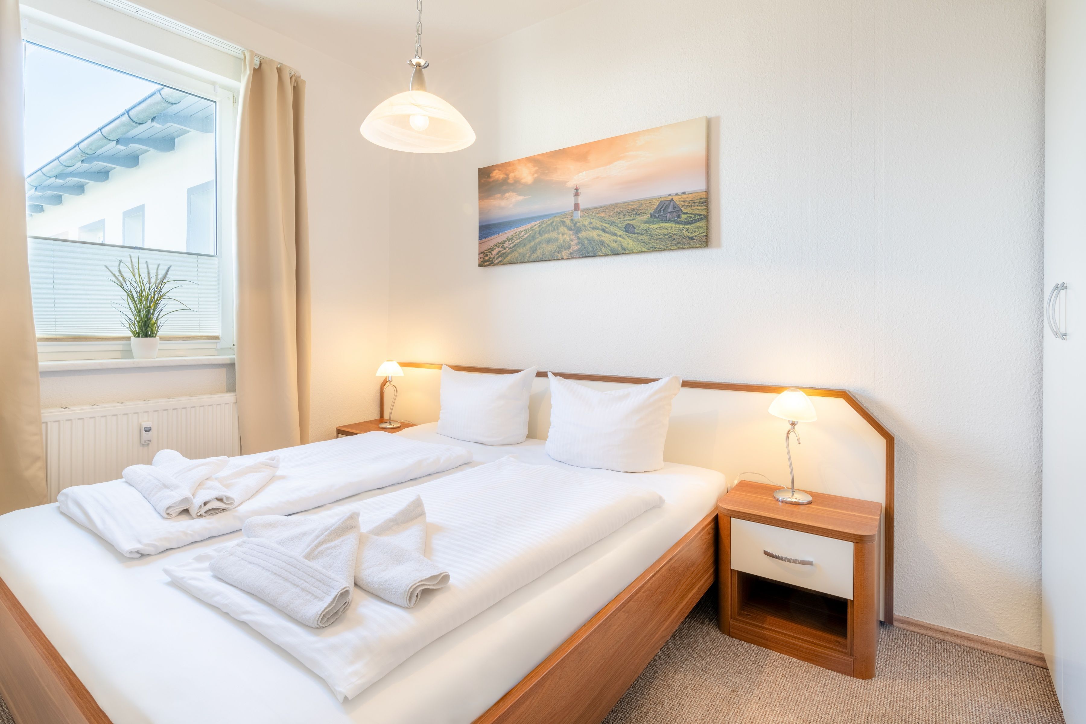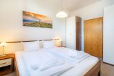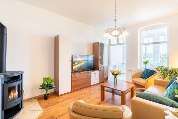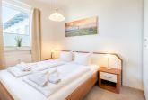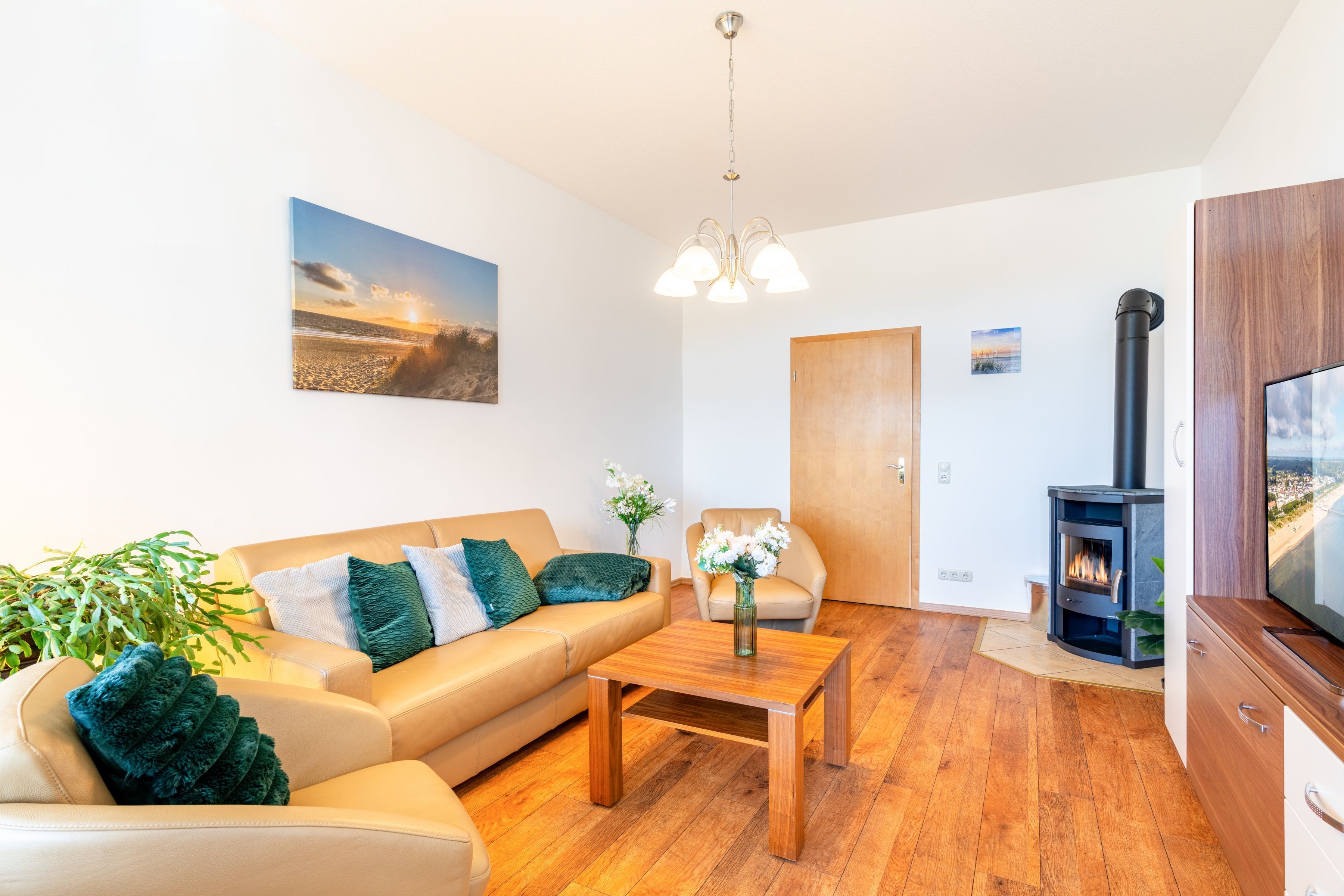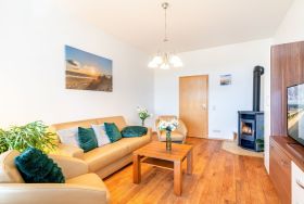 Das 65 qm große Appartement in ersten Obergeschoss verfügt über ein Wohnzimmer mit moderner Couchecke, TV und Kamin. Die separate Küche ist mit Backofen, Spülmaschine, Mikrowelle Ceranherd, Kühlschrank und vielen weiteren Küchenutensilien ausgestattet. Die Küche erreichen Sie über die großzügige Veranda mit Essplatz. Das erste Schlafzimmer ist mit Doppelbett ausgestattet, das zweite Schlafzimmer mit einem Einzelbett und TV. Bad mit Dusche und WC.