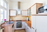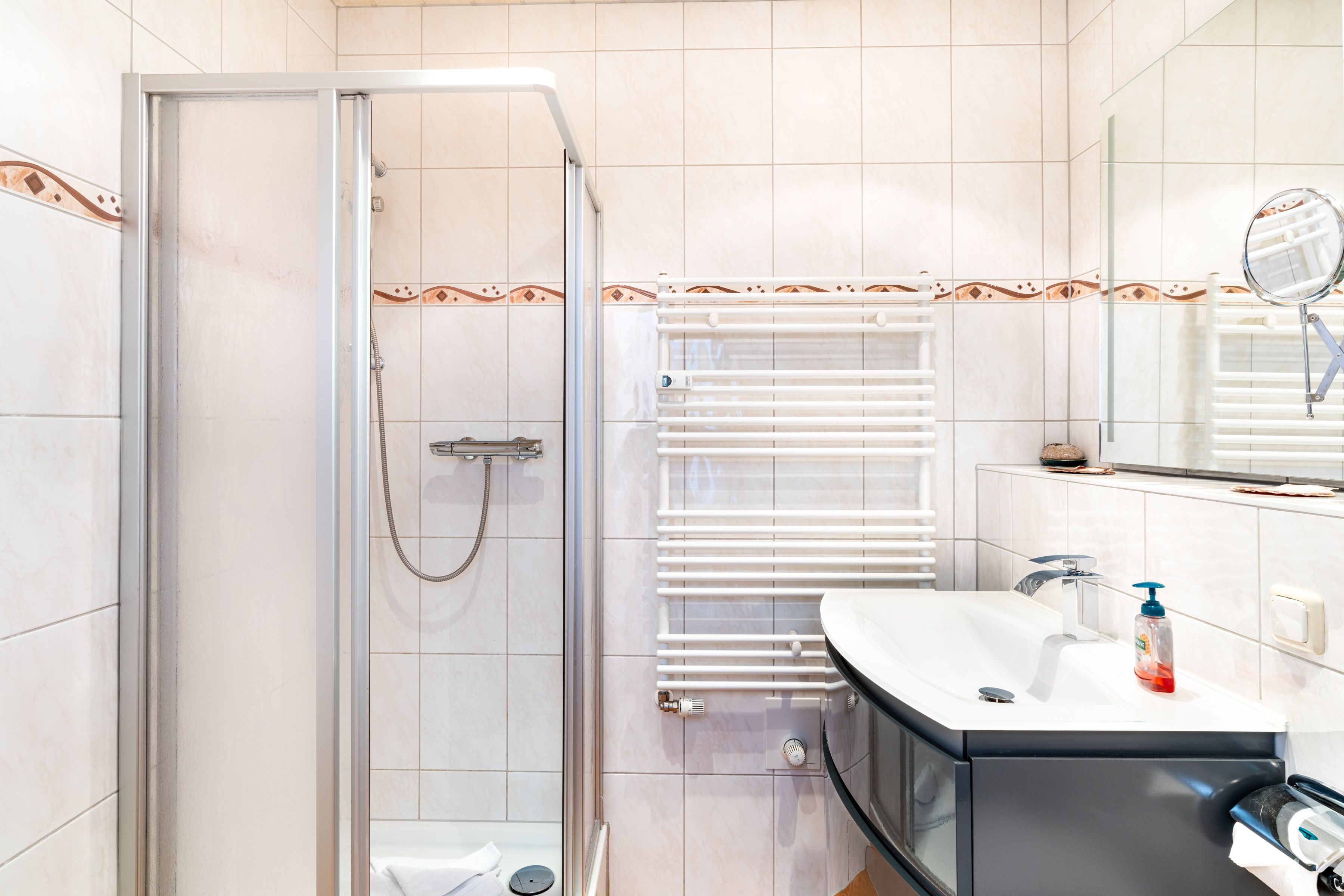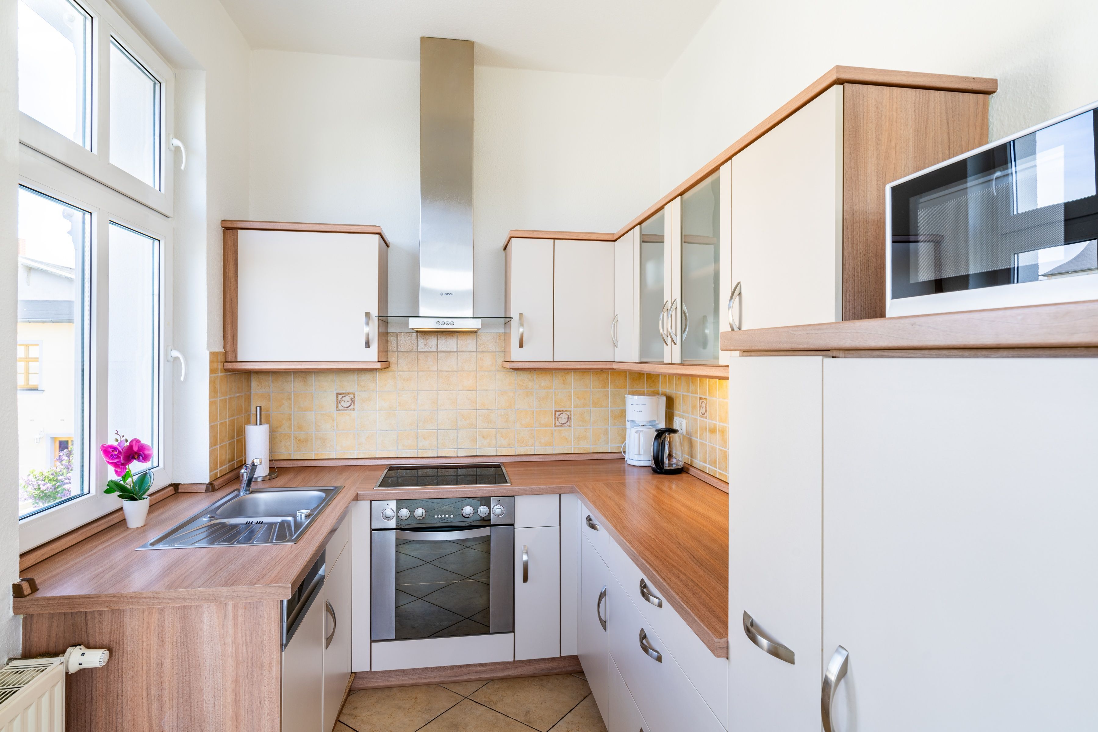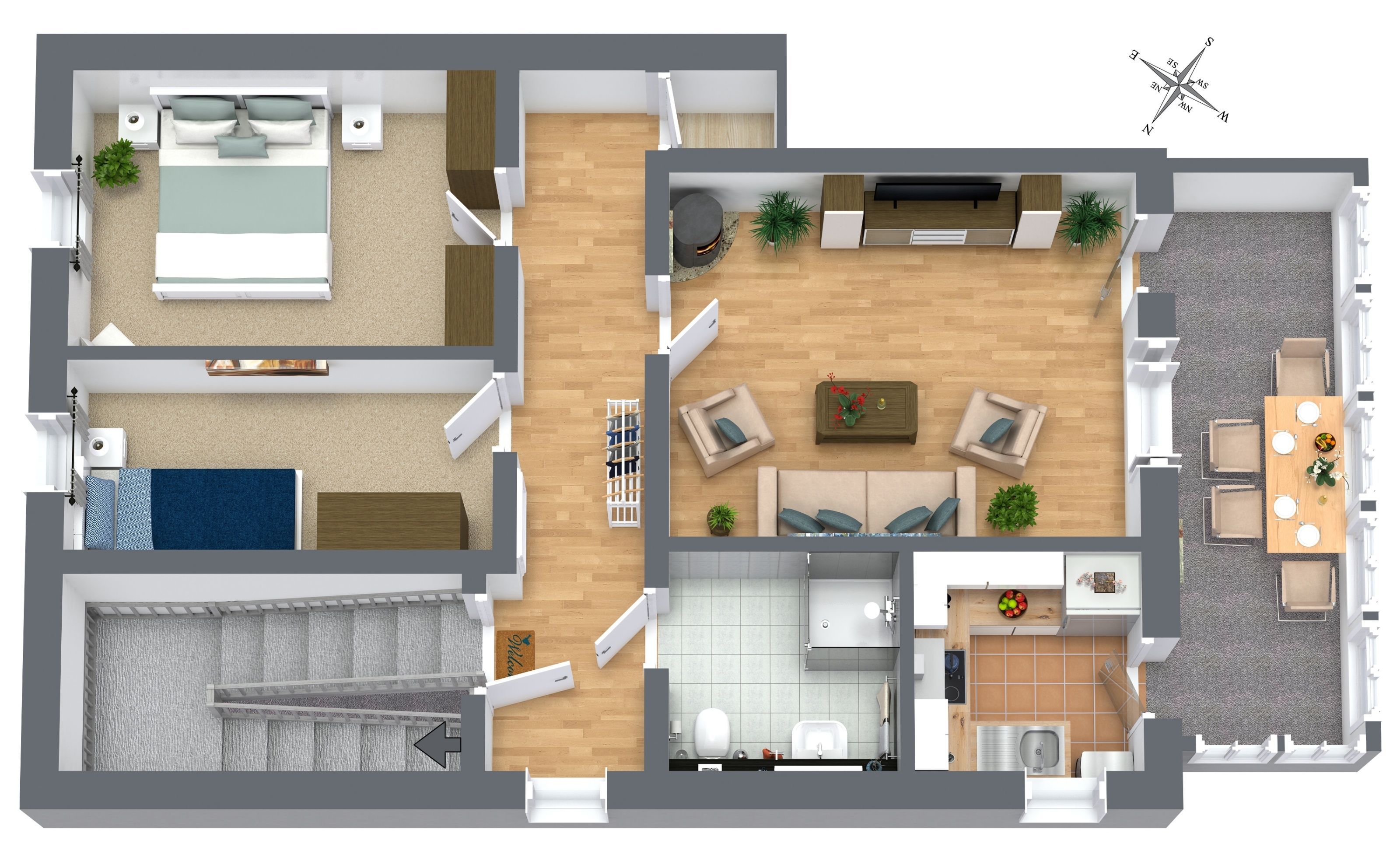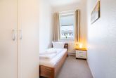 Das 65 qm große Appartement in ersten Obergeschoss verfügt über ein Wohnzimmer mit moderner Couchecke, TV und Kamin. Die separate Küche ist mit Backofen, Spülmaschine, Mikrowelle Ceranherd, Kühlschrank und vielen weiteren Küchenutensilien ausgestattet. Die Küche erreichen Sie über die großzügige Veranda mit Essplatz. Das erste Schlafzimmer ist mit Doppelbett ausgestattet, das zweite Schlafzimmer mit einem Einzelbett und TV. Bad mit Dusche und WC.