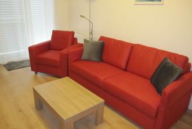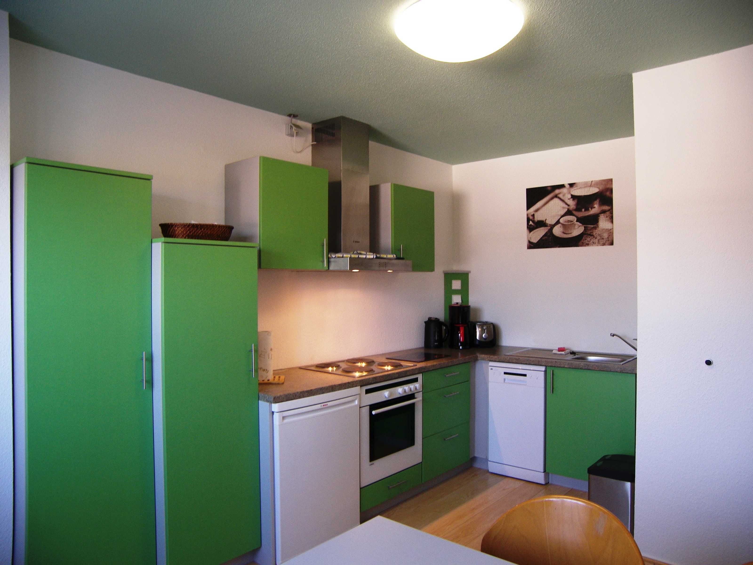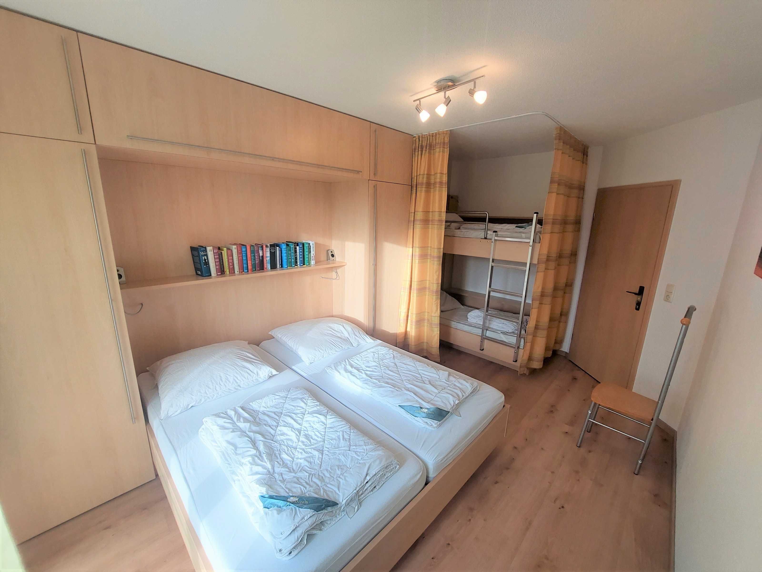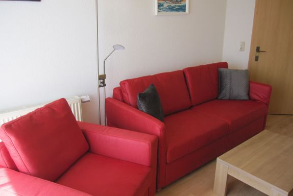 Die 53 m² große Nichtraucher-Wohnung im Obergeschoss ist modern und gemütlich ausgestattet. Sie besteht aus einem Wohnraum, einem Schlafraum mit einem Doppelbett (2 x 90 cm x 200 cm) und einem Doppelstockbett (Länge ca. 175 cm), einer Küche, einer Diele, einem Bad/WC und einen Balkon. Der Fußboden in Küche, Bad/WC ist gefliest und im Flur befindet sich Laminat. Wohnraum und Schlafraum sind neu renoviert worden, hier besteht der Fußboden aus Klick-Vinyl. Im Wohnzimmer befindet sich eine weitere Schlafmöglichkeit auf einer Schlafcouch und ein 39-Zoll LED-Fernseher. Die Küche ist komplett mit allen notwendigen Geräten (Spülmaschine, Wasserkocher, Herd, Backofen, Kühlschrank, Kaffeemaschine, Toaster) ausgestattet. Ein Kinderbett kann nach Verfügbarkeit ausgeliehen werden. Bitte vorher anmelden.