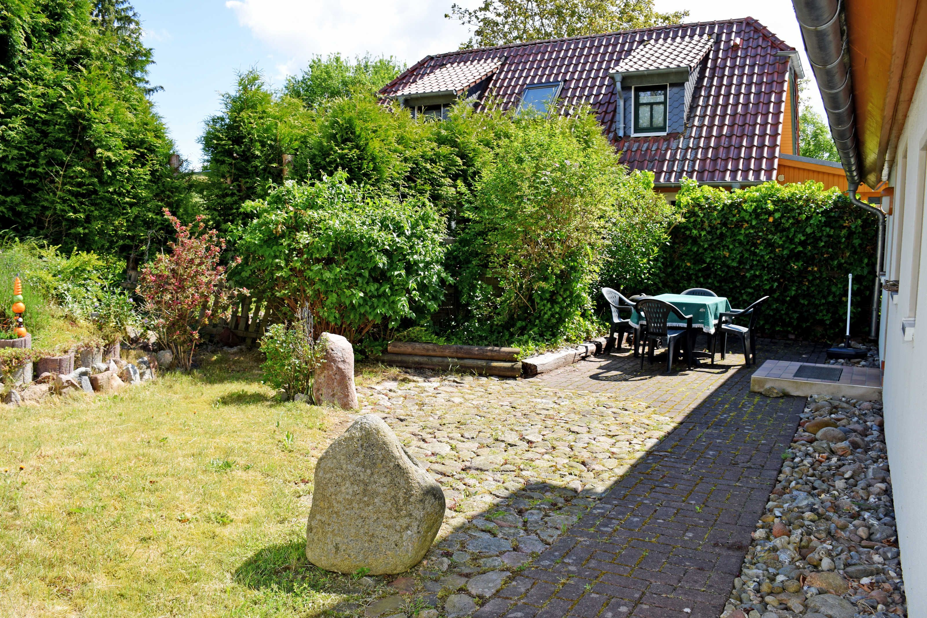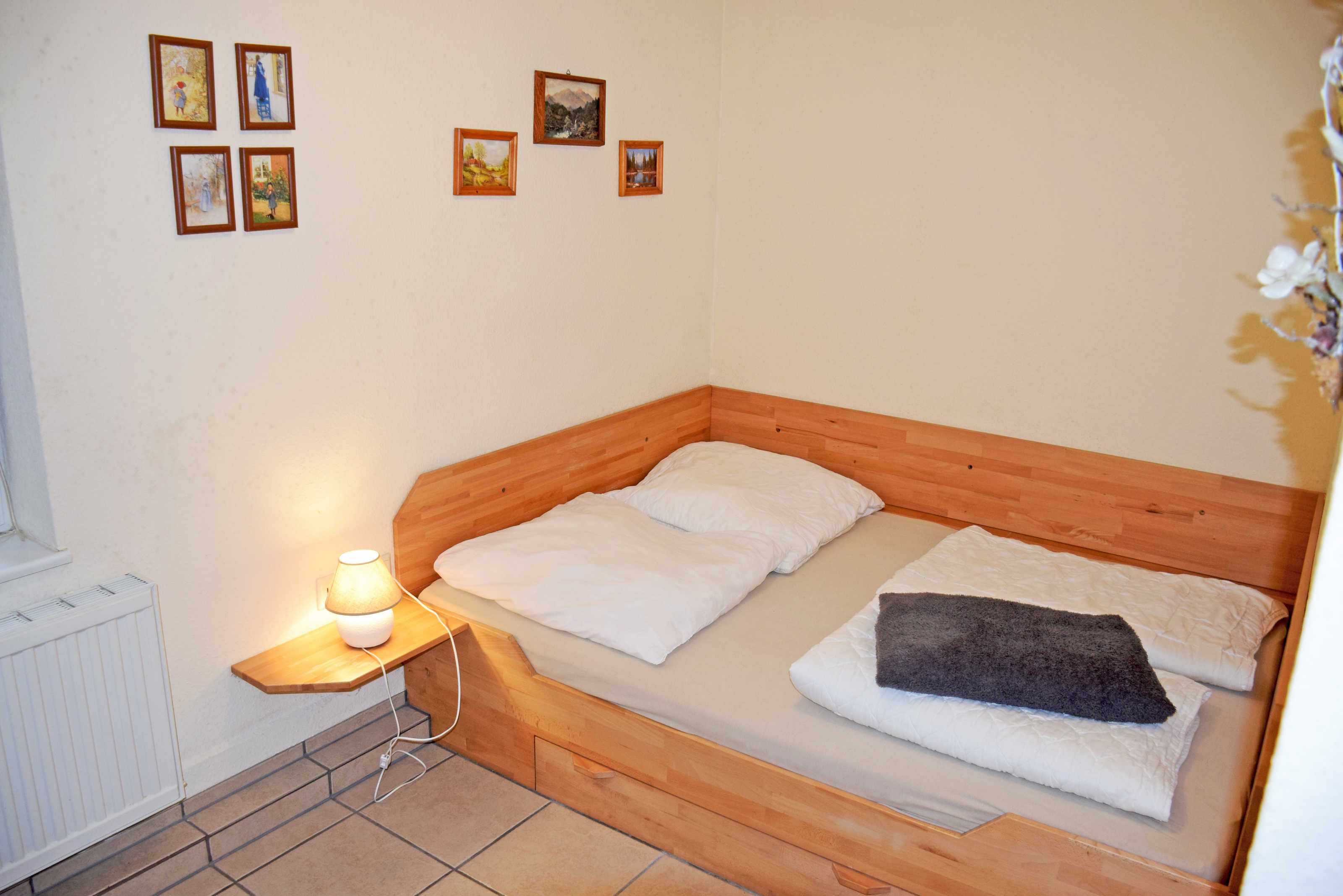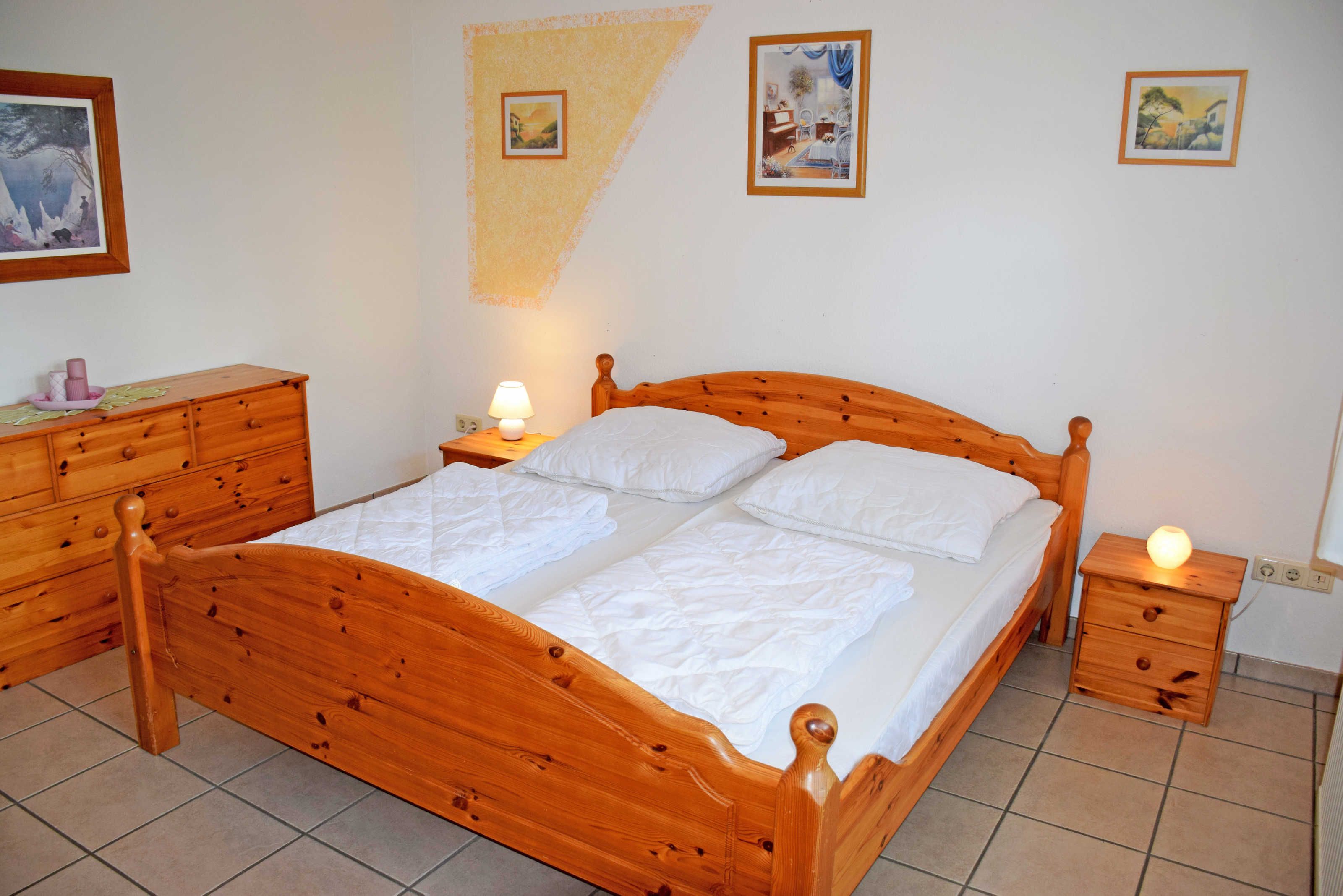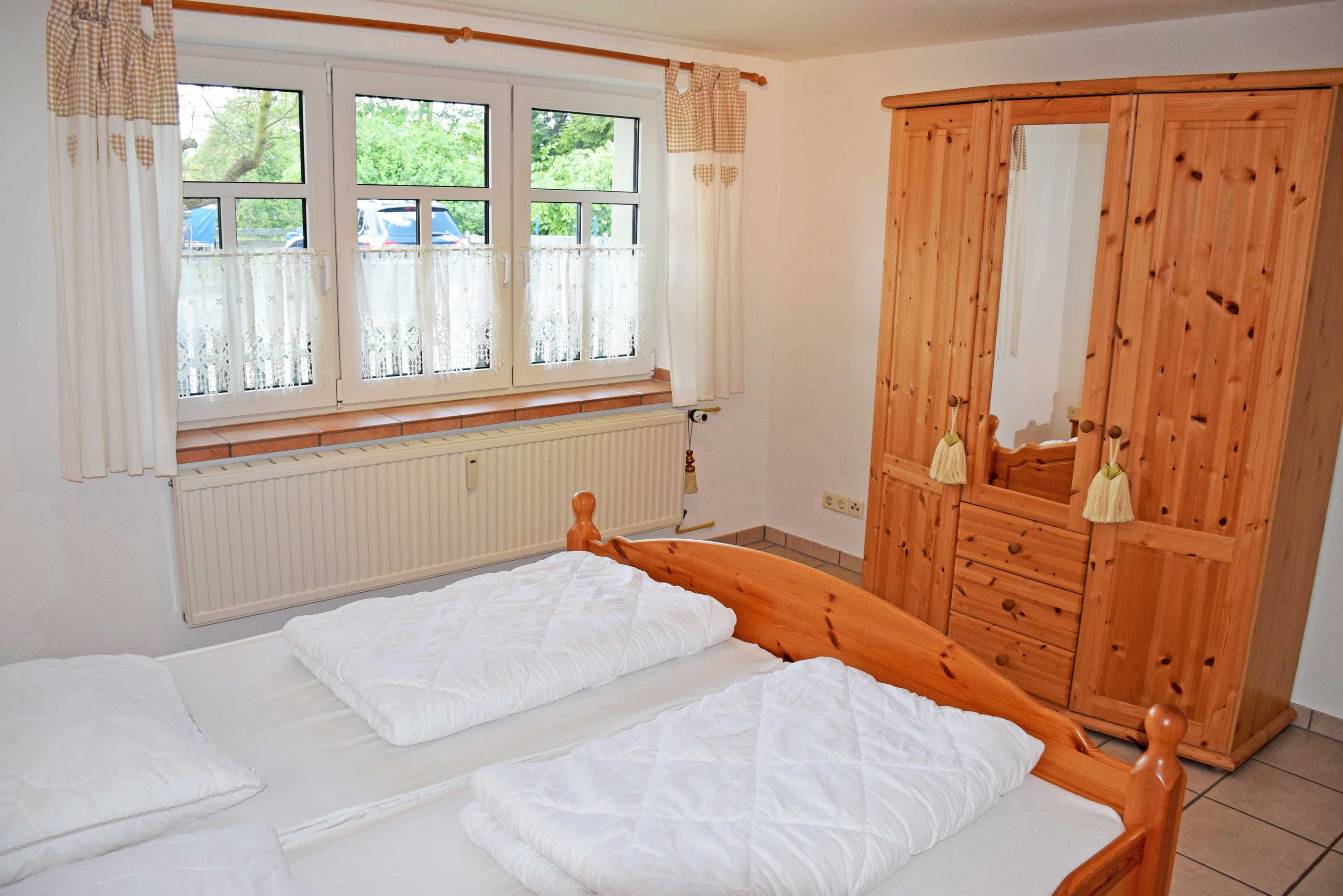 Im ersten Schlafzimmer stehen ein bequemes Doppelbett mit Nachttischen und Leselampen, sowie ein Kleiderschrank. Das zweite Schlafzimmer bietet ebenfalls ein Doppelbett an. Hinter dem Haus gibt es für diese Ferienwohnung einen großen Hofgarten mit Terrasse und Gartenmöbeln, wo man frühstücken oder abends grillen kann.