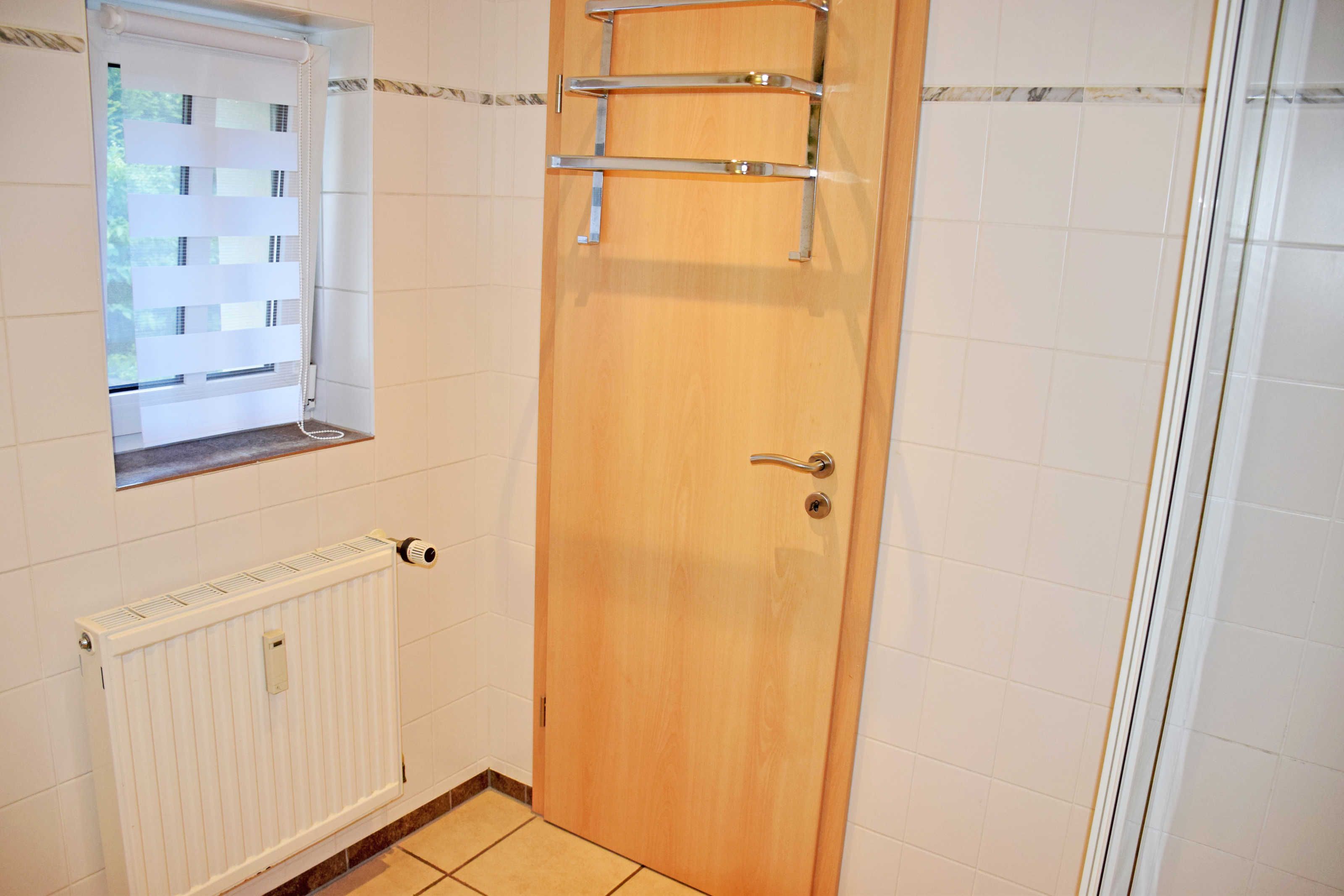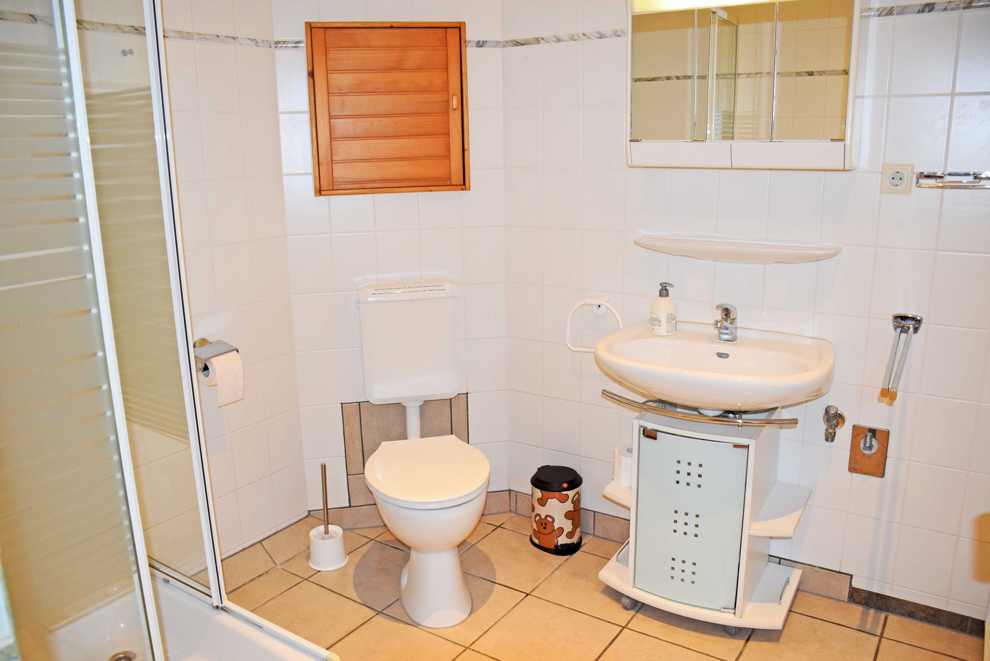Das Bad ist mit Dusche, Waschbecken und WC ausgestattet und hat Tageslicht.