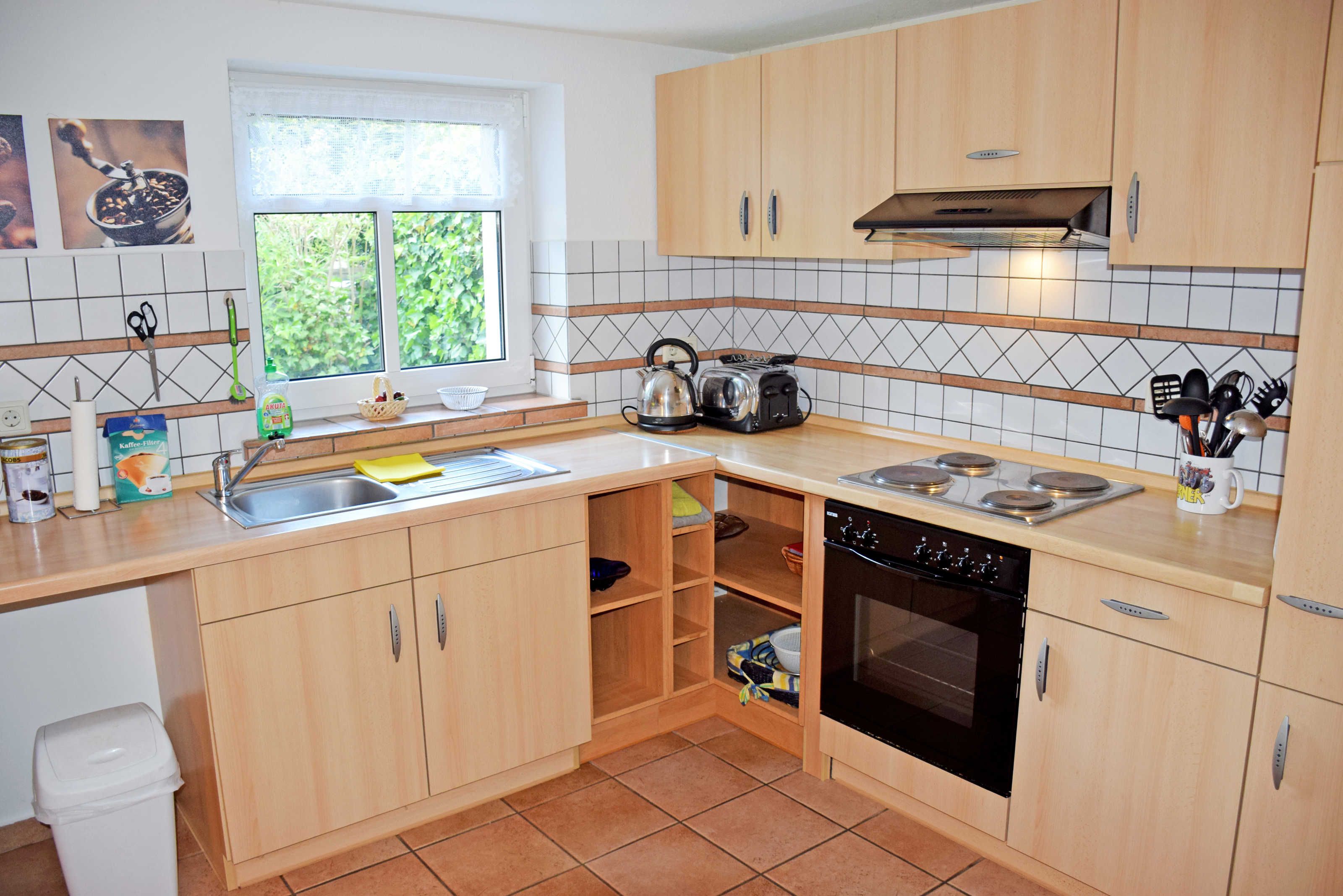 Die Küchenzeile bietet Herd, Kühlschrank, Spüle, Abzugshaube, Kaffeemaschine, Wasserkocher und Küchenausstattung.