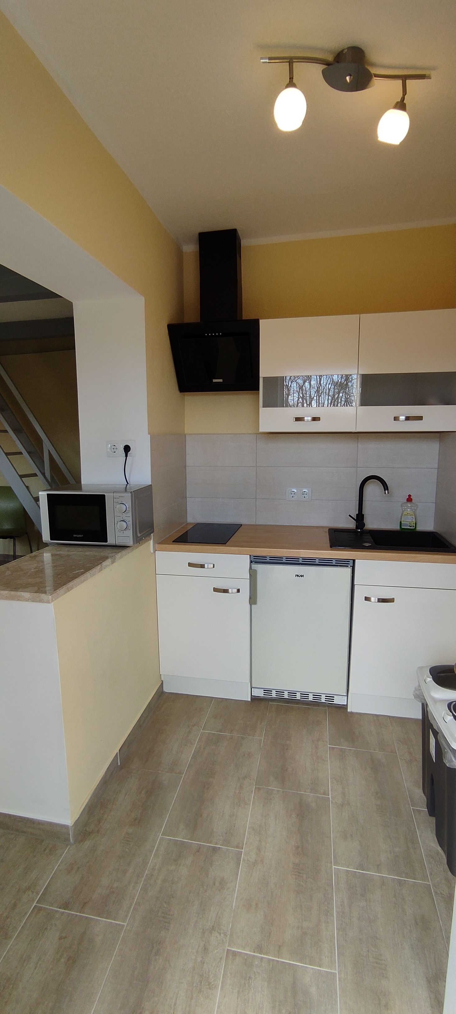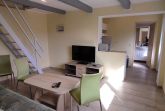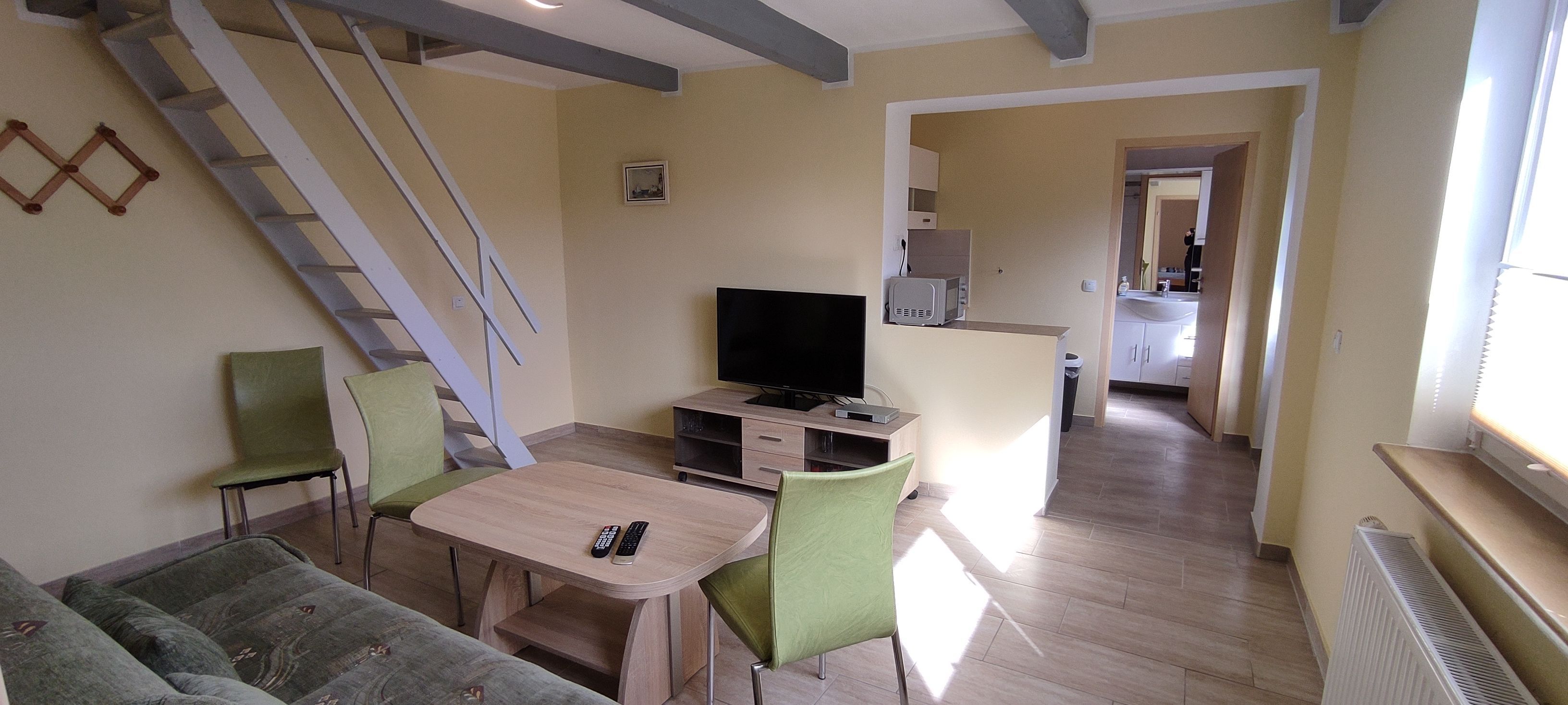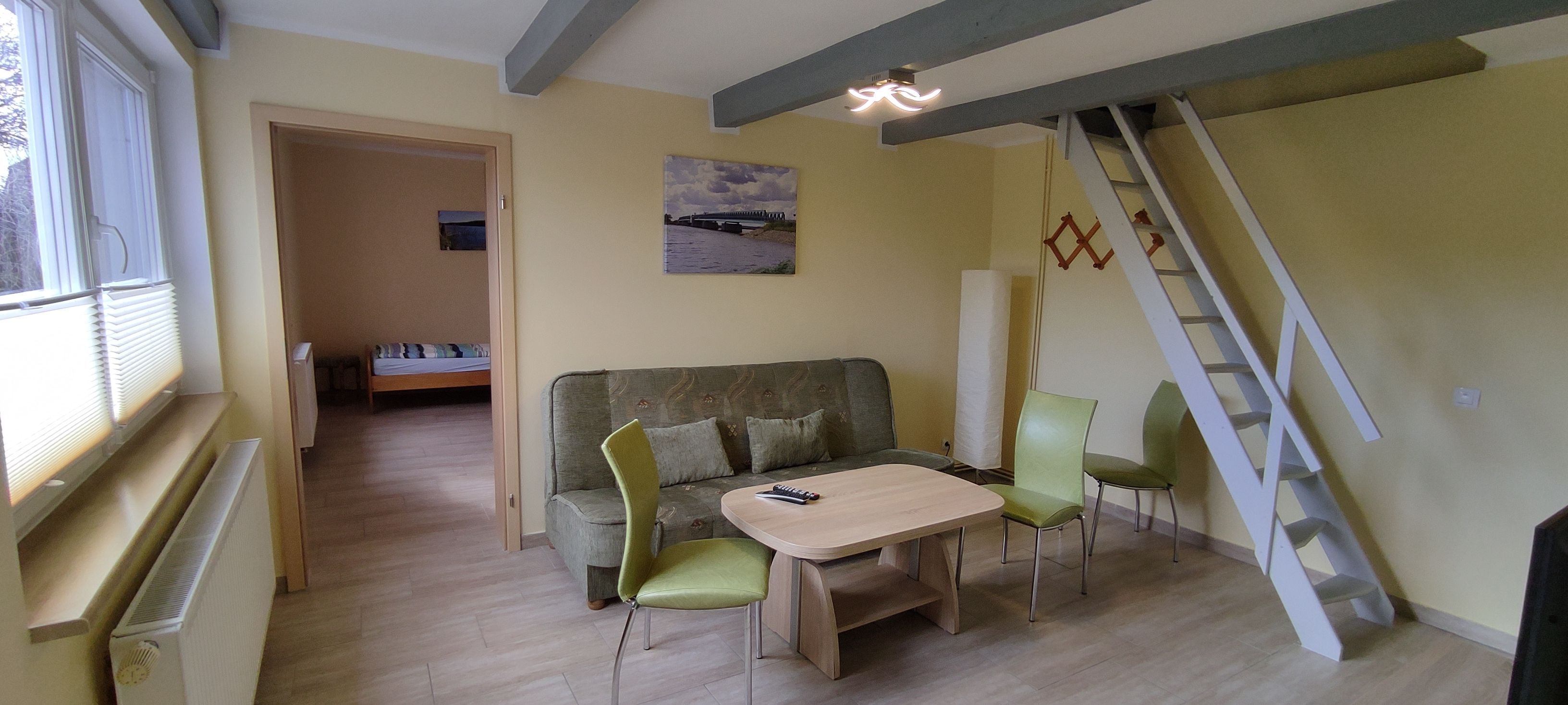 Erdgeschoss & 1. Obergeschoss, 40 m², für 4 Personen; Wohnzimmer mit Radio und Sat-TV, Couch, Tisch und Stühle; Kleiderschrank, Raumspartreppe zum Schlafzimmer; Schlafzimmer mit Doppelbett, Nachtschränken und 2 Einzelbetten; Küche mit Küchenzeile, Wasserkocher, Toaster, Kühlschrank, Microwelle, Kaffeemaschine, 2 - Plattenkochfeld Badezimmer (Dusche und WC), Badezimmermöbel; Terrasse vor der Wohnung mit Massivgrill und Sitzmöbeln