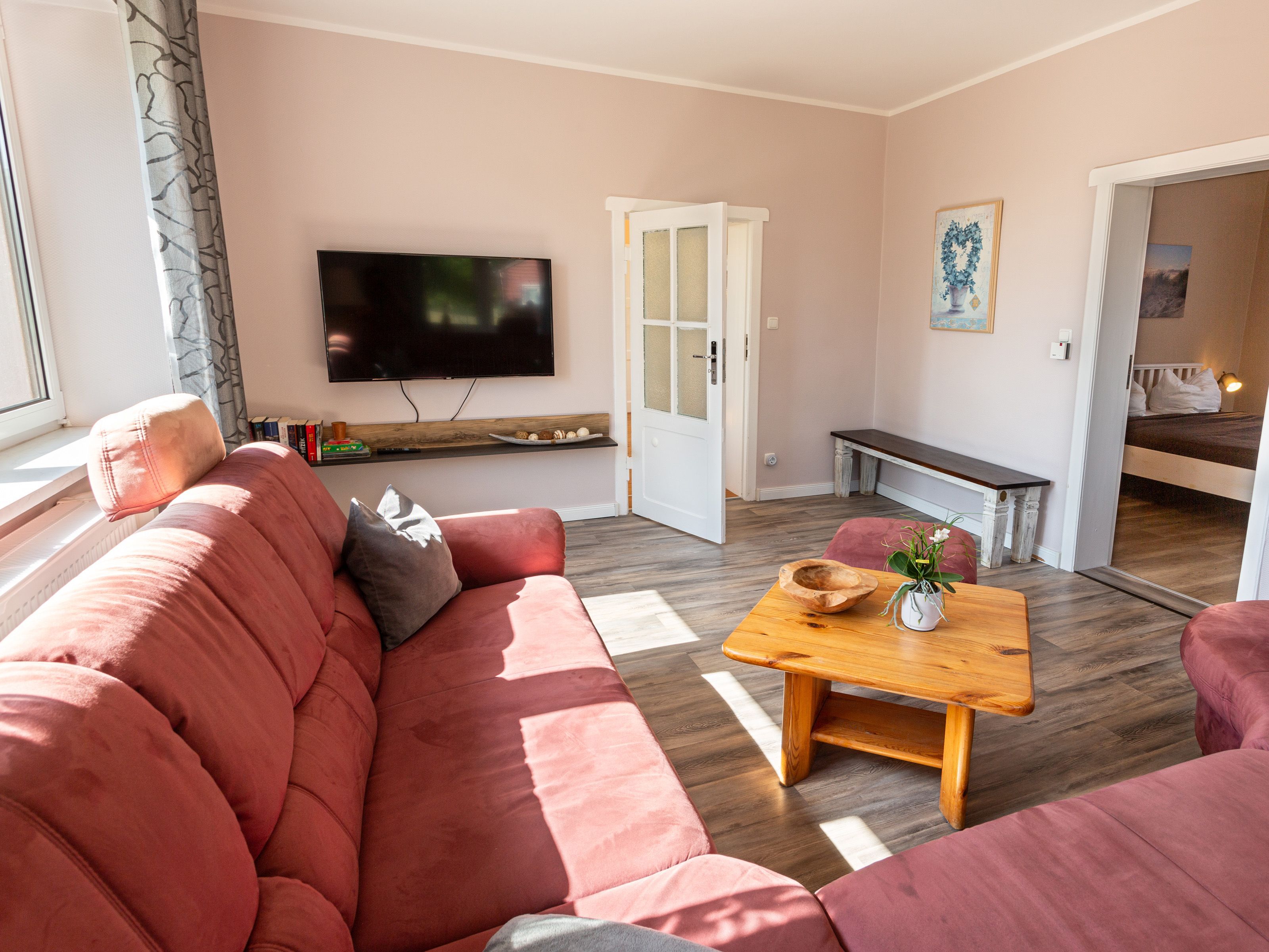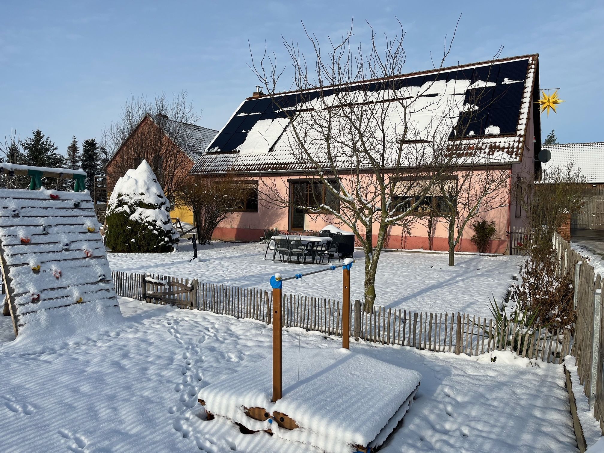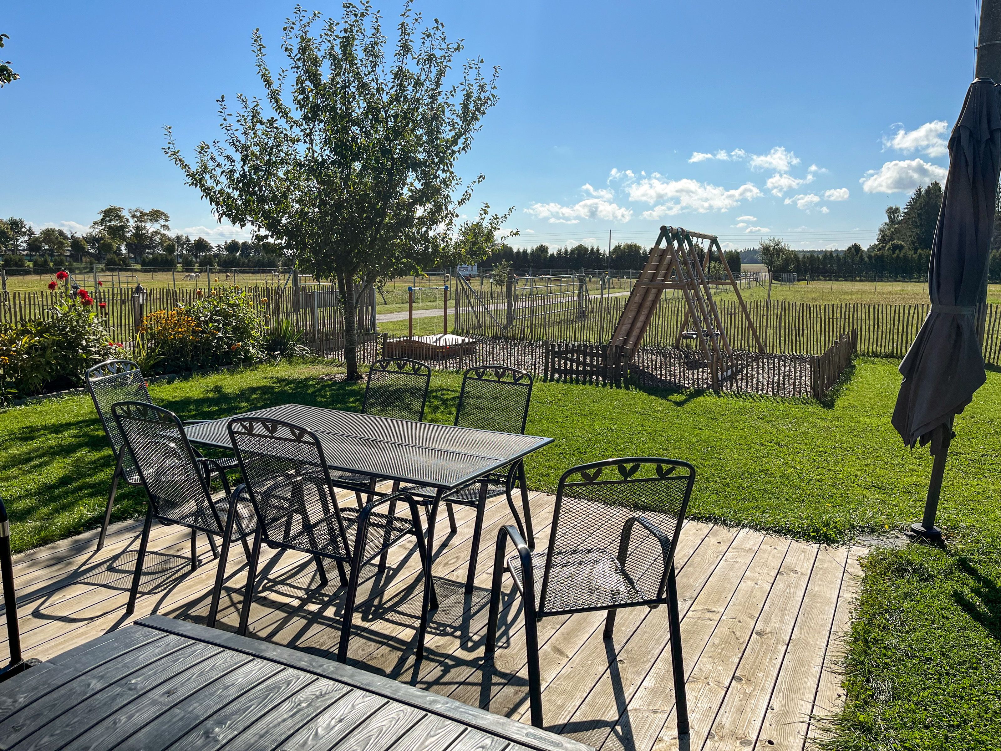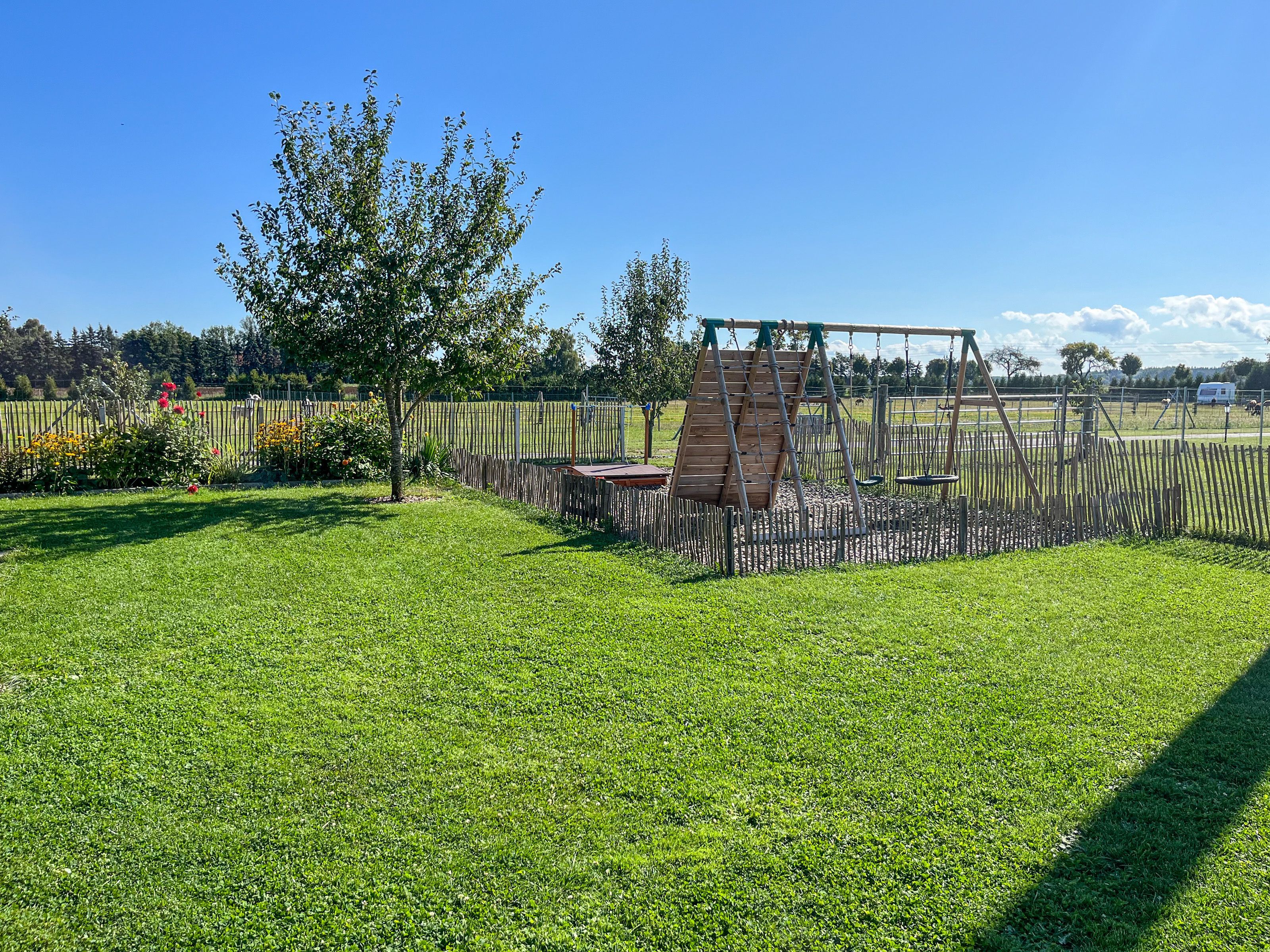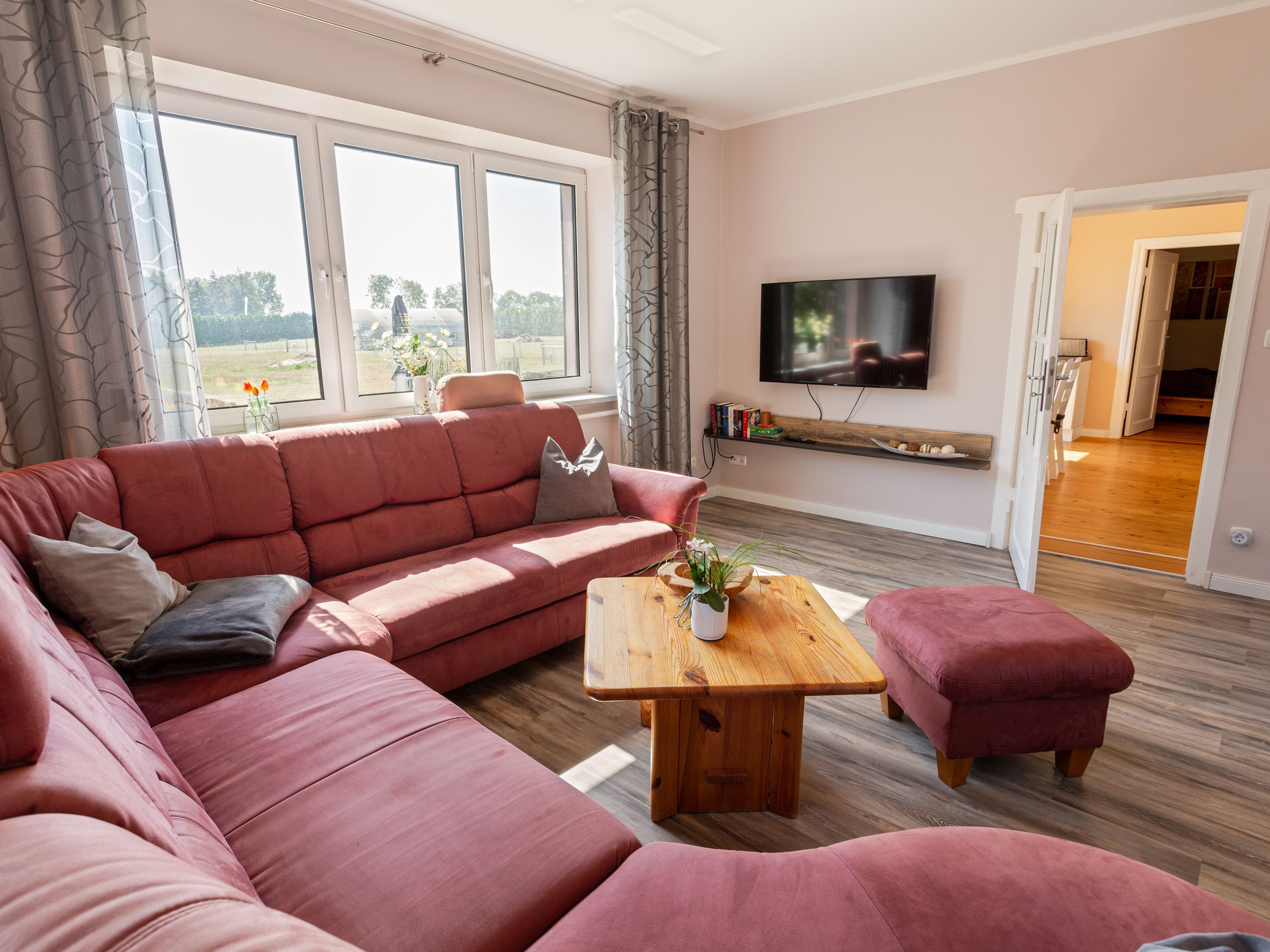 In dem Bauernhaus auf dem Alpaka-Hof in Rubkow, zwischen Anklam und Wolgast, erwartet Sie eine fast ebenerdige 85 m² große Wohnung mit 3 Zimmern, Küche und Bad. Diese wurde neu ausgebaut, gemütlich eingerichtet und befindet sich auf einer Etage. Durch einen separaten Eingang gelangen Sie über einen kleinen Flur in eine moderne Küche mit großem Esstisch für bis zu 8 Personen. Von da aus empfängt Sie ein gemütlicher Wohnbereich mit bequemen Polstermöbeln (mögliche Aufbettung für 2 Personen) und Sat-TV. Es stehen Ihnen zwei separate Schlafzimmer mit je einem Doppel- und einem weiteren Einzelbett zur Verfügung. Ein geräumiges modernes Bad mit bodenebener großer Dusche, Waschtisch und WC rundet den Komfort ab. Von der voll ausgestatteten Küche geht es in Ihren eigenen Garten mit Ausblick auf die Alpakas. Im Garten befindet sich eine sonnengeschützte Sitzgruppe und ein Holzkohlegrill. Auf der Alpaka-Farm werden Alpaka-Spaziergänge, Alpaka Foto-Shootings, Hofführungen oder Alpaka-Picknicks angeboten. Bei einer Buchung ab 7 Übernachtungen ist ein Alpaka-Picknick (nicht im Winter) oder eine Hofführung für Sie kostenlos.