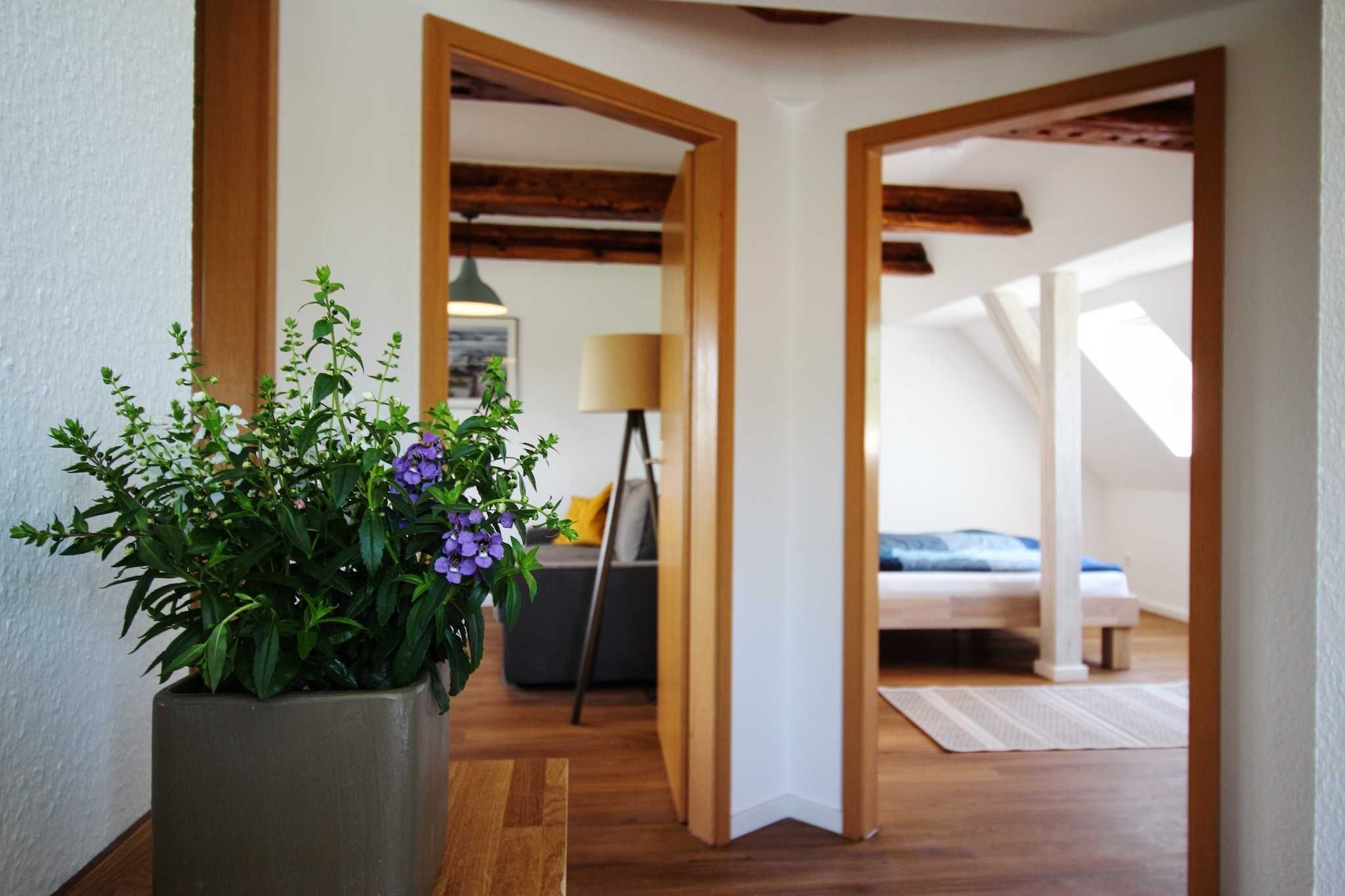 sowohl im Wohn- als auch im Schlafzimmer die alten Holzbalken an der