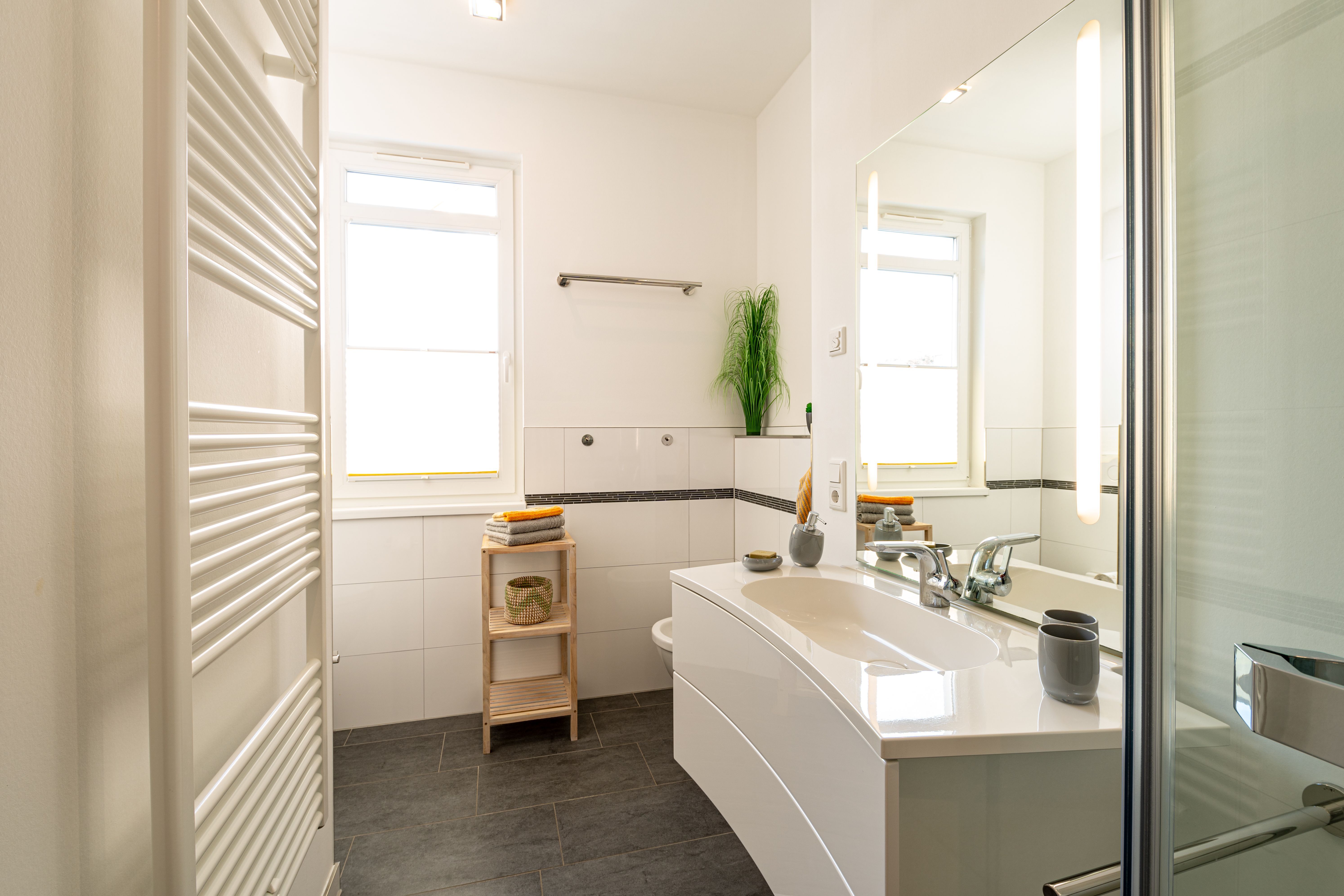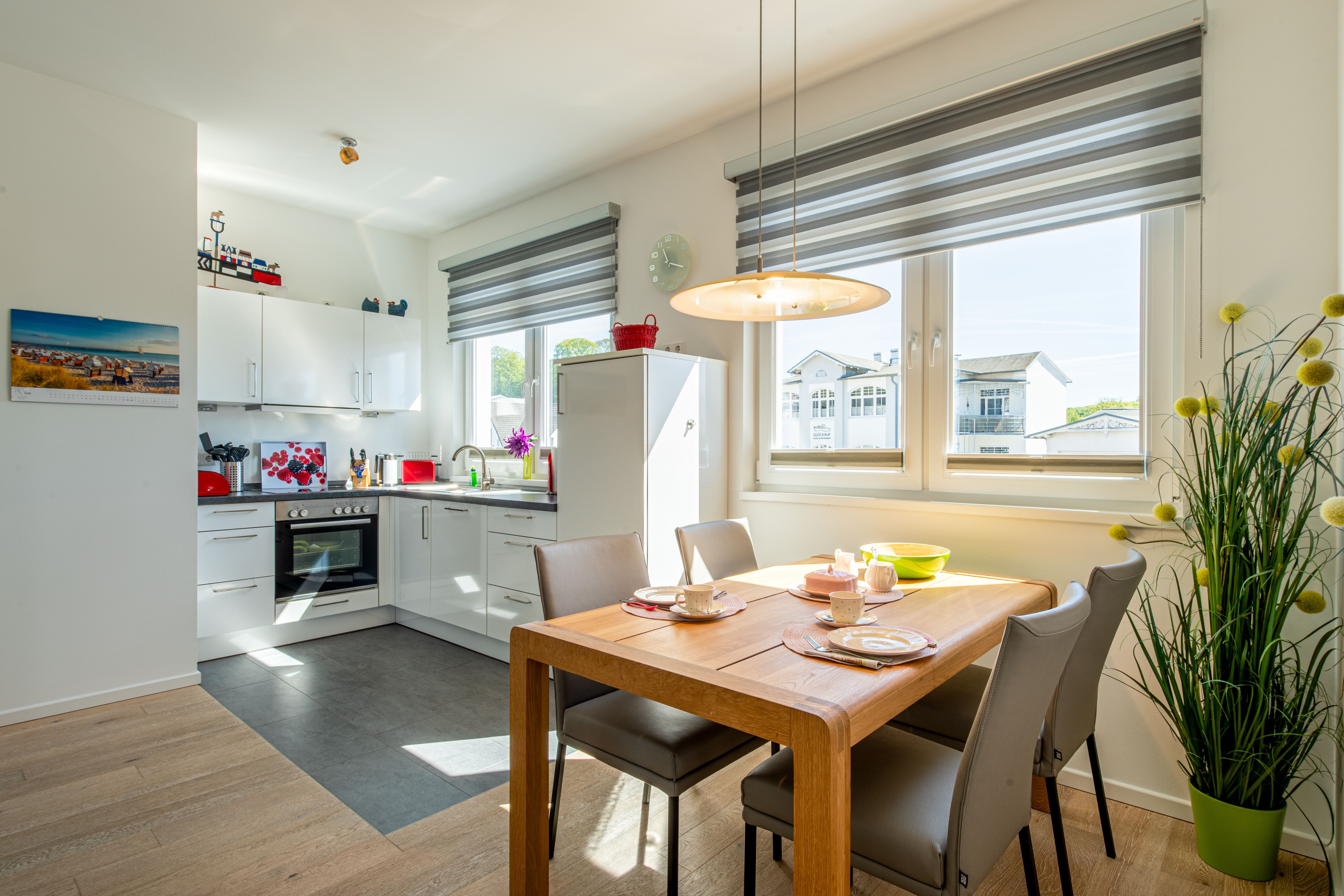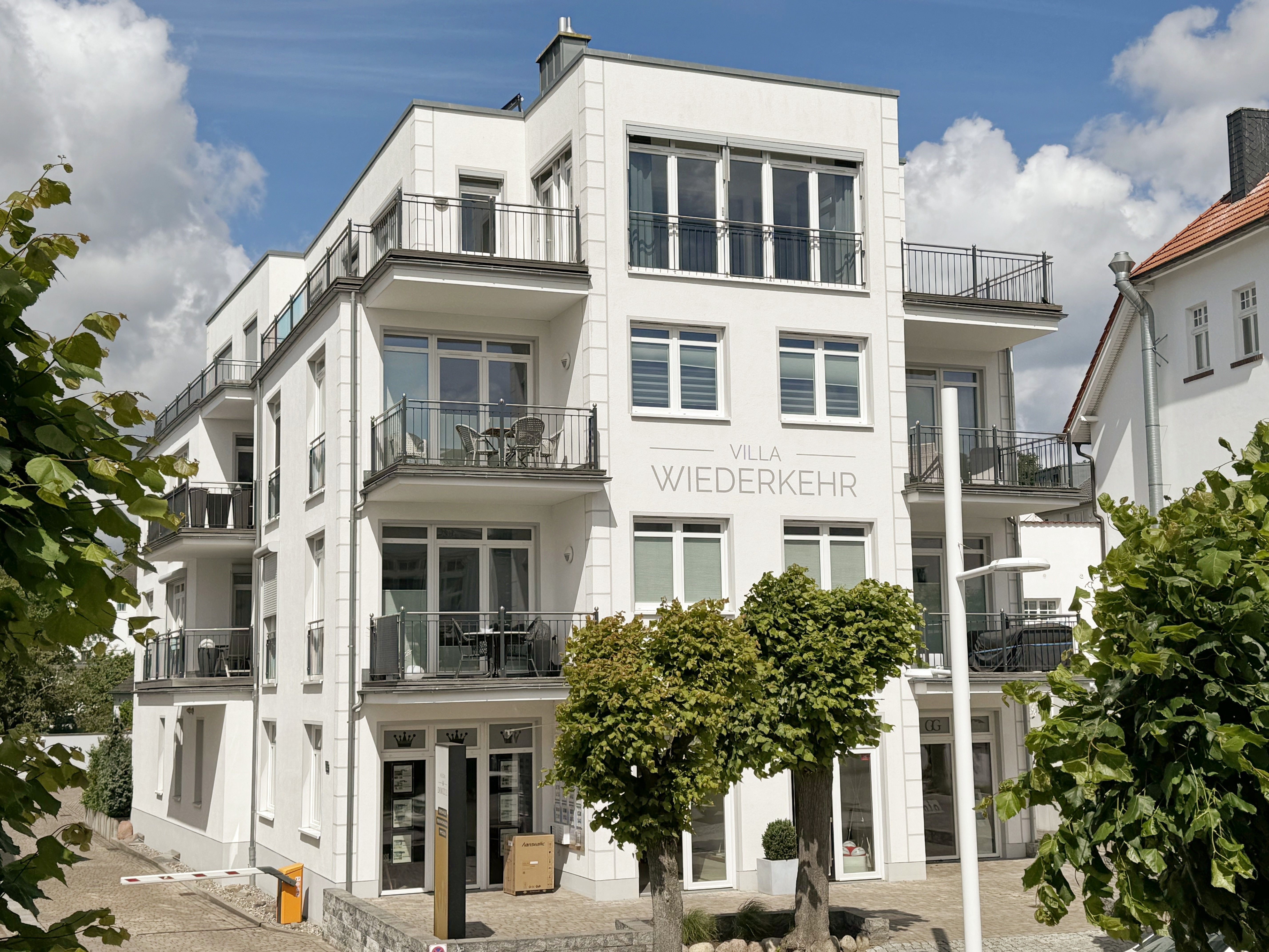 Herzlich willkommen im wunderschönen Urlaubs-Domizil WILHELMINE im zweiten OG der Villa Wiederkehr direkt an der berühmten Wilhelmstraße im Ostseebad Sellin. Die Villa Wiederkehr, im klassischen Bauhausstil errichtet, befindet sich am oberen Ende der Wilhelmstraße zentral gelegen und doch nicht mittendrin im Trubel. Bis zur historischen Seebrücke mit ihren Pavillions und dem feinsandigen Ostseestrand sind es ca. 700 Meter. Der Strand erstreckt sich von Sellin über 7 km, an Baabe vorbei bis zum Ostseebad Göhren. Von der Seebrücke aus startet (saisonal) die Weiße Flotte in Richtung Binz und Sassnitz, bis zu den weltberühmten Kreidefelsen. Von der Villa Wiederkehr ausgehend gelangen Sie in ca. 500 Metern an den Selliner See, der zu herrlichen Wanderungen und Radfahrten einlädt. Wer gerne ein Restaurant besuchen möchte, findet in unmittelbarer Nähe verschiedene Möglichkeiten. Ganz in der Nähe befindet sich auch die Haltestelle des Rasenden Roland, eine der Hauptattraktionen Rügens: die dampflokbetriebene historische Schmalspurbahn, mit der Sie vorbei am Jagdschloss Granitz auch nach Binz fahren können. Ein Spaß für Groß und Klein.