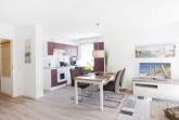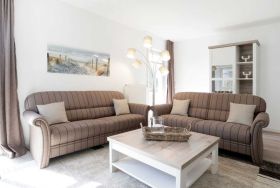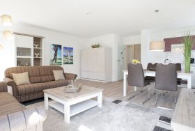 Die sehr komfortabel möblierte 2-Zimmer Ferienwohnung mit Balkon, befindet sich im 1.Obergeschoss des Hauses. Mit einer Wohnfläche von 57qm ist das Appartement für eine Belegung mit max. 4 Personen geeignet. Im behaglichen Wohn-Essbereich erwartet Sie eine ausziehbare Komfort Sofagarnitur, die zwei weitere Schlafgelegenheiten ermöglicht. Zudem sind ein großer Esstisch sowie Fernseher und gebührenfreies WLAN vorhanden.