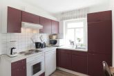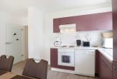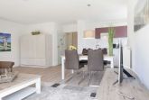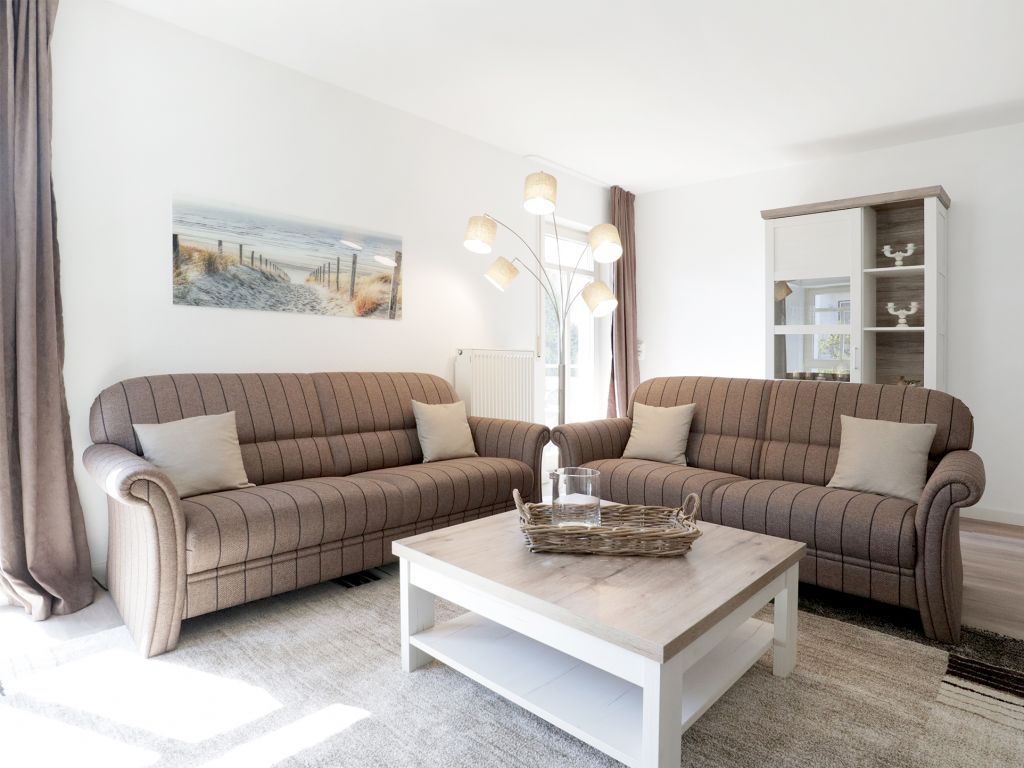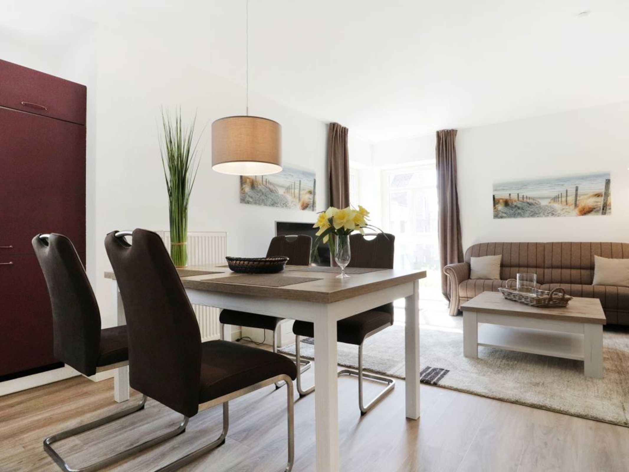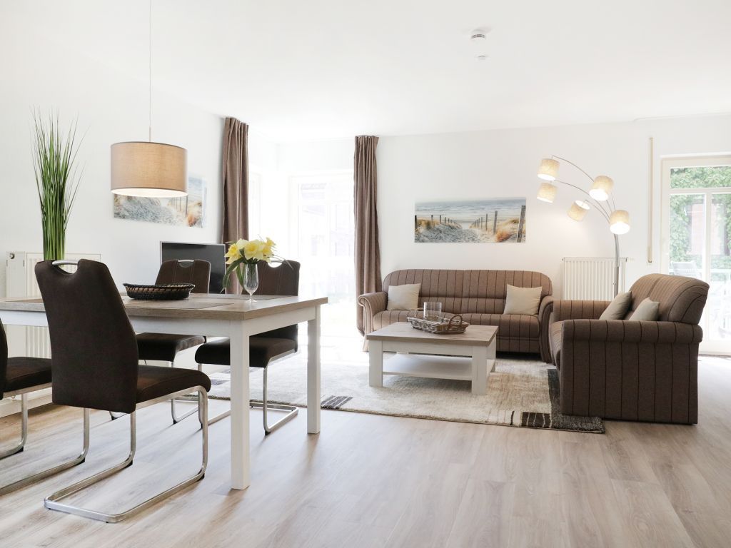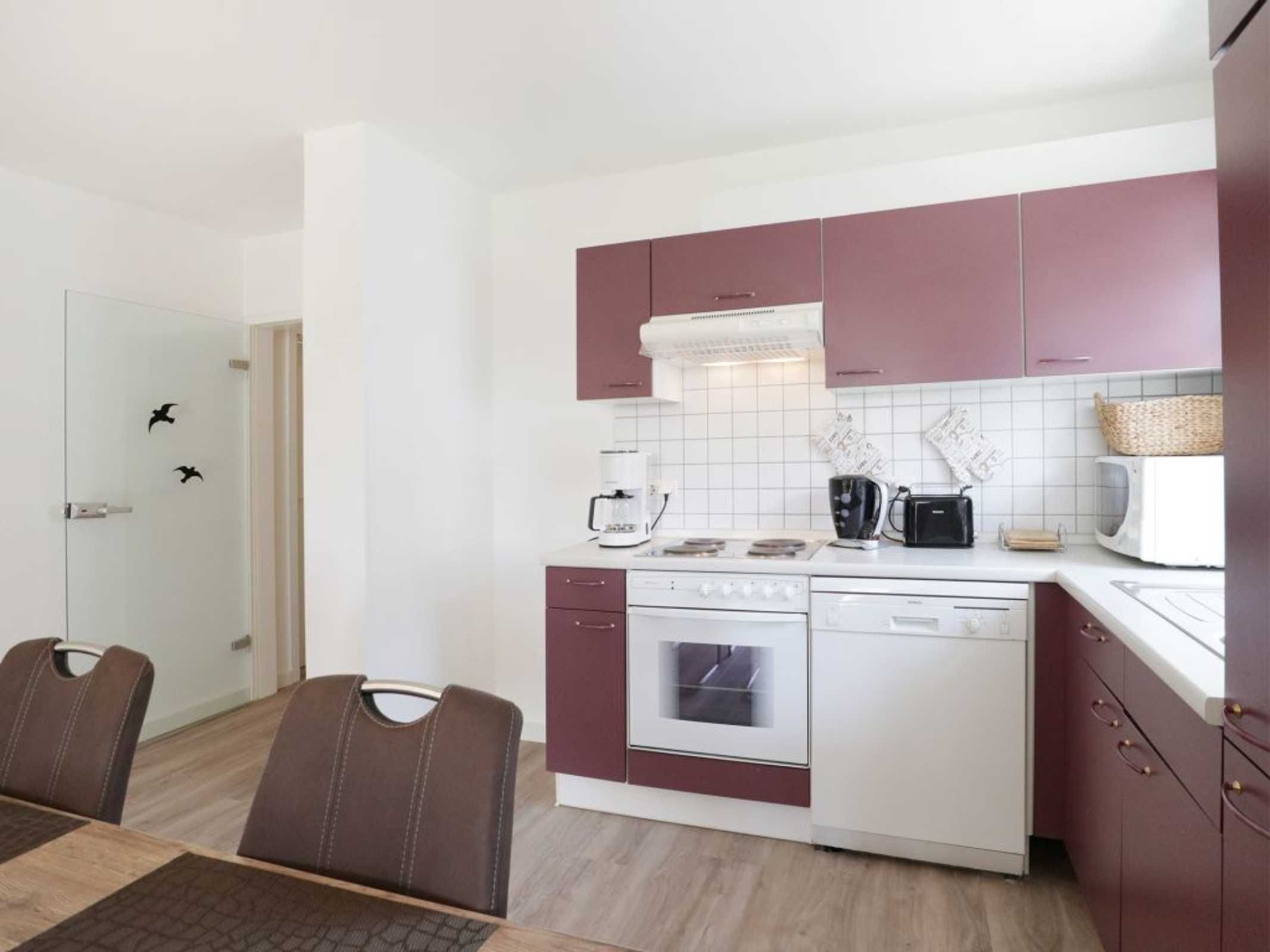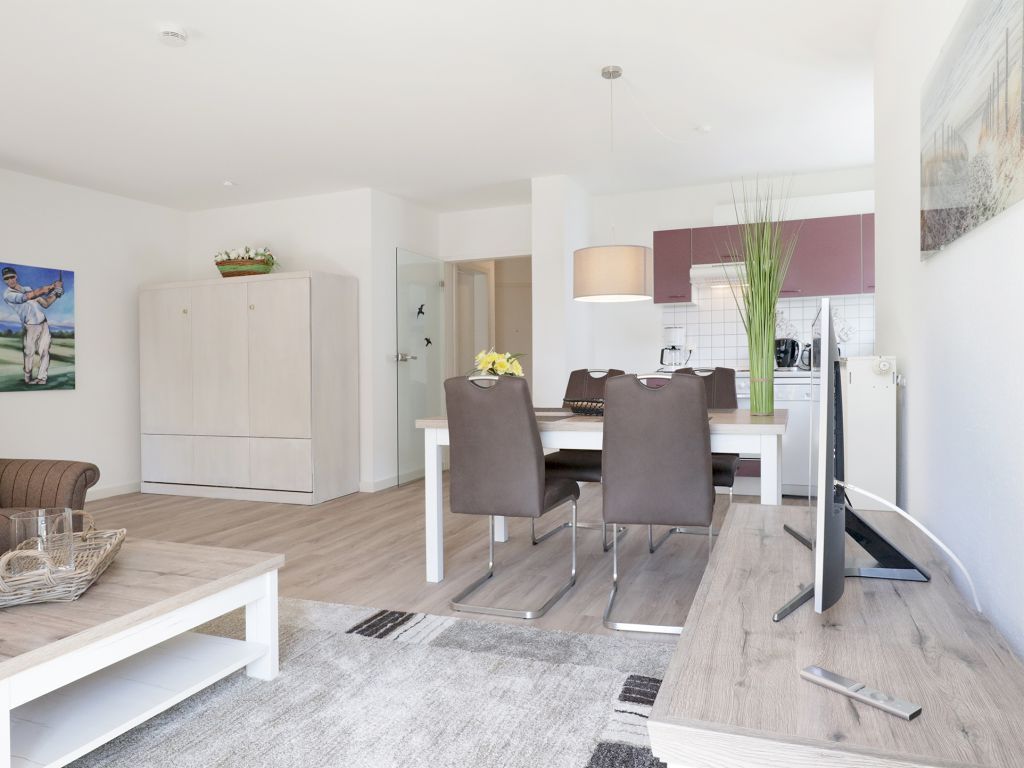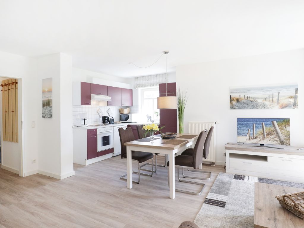 Die in den Wohnraum integrierte Küchenzeile ist offen gestaltet und vollständig ausgestattet mit: Herd, Backofen, Mikrowelle Dunstabzug, Kühlschrank mit integr. Frostfach, Geschirrspüler, Toaster, Kaffeemaschine, Wasserkocher usw. Ihre zubereiteten Urlaubsmahlzeiten können Sie am Esstisch zu sich nehmen, oder Sie genießen Ihren Morgenkaffee auf dem saisonal möblierten West-Balkon.