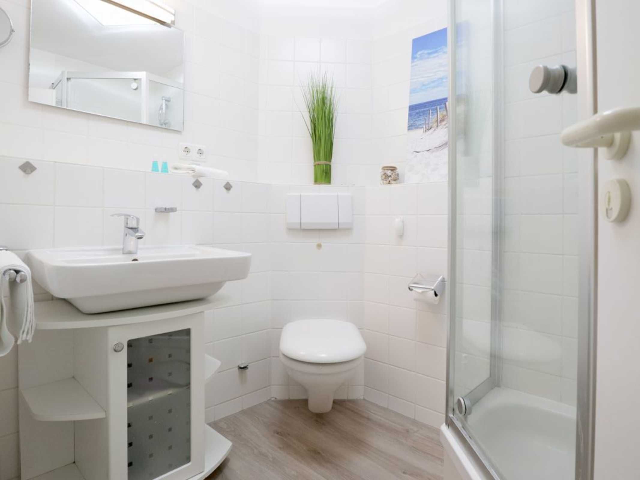 Zugehörig ist ein helles Duschbad mit Waschtisch, WC.
